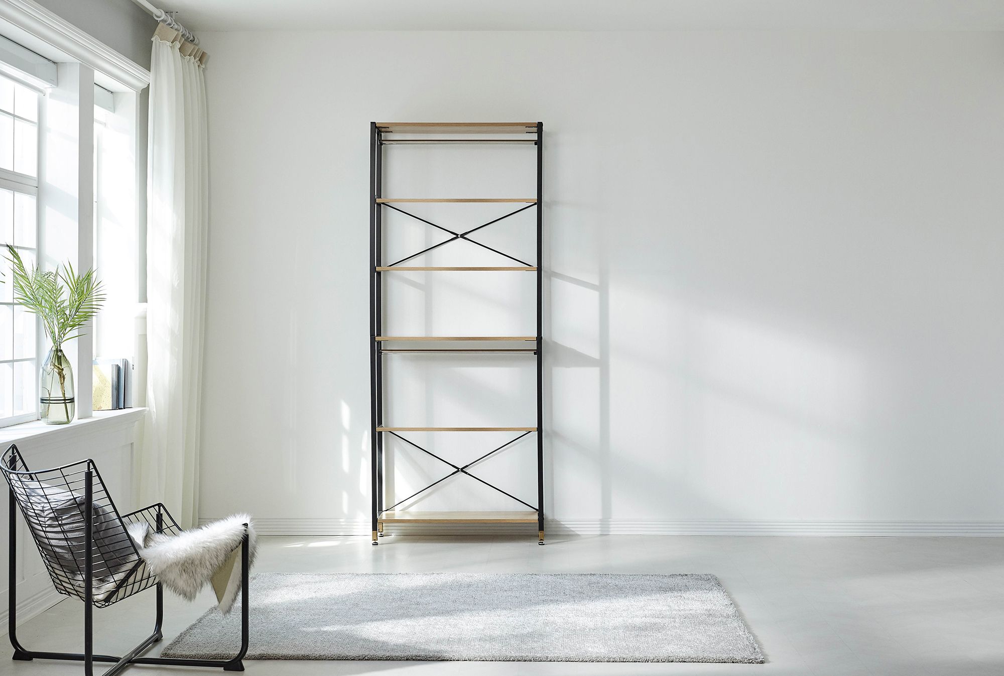Faites régner l'ordre ! Avec cette étagère, créez un espace de rangement supplémentaire et le manque de place ne sera plus jamais un problème. Avec une hauteur de 210 cm, cette étagère offre suffisamment de place par exemple pour les livres ou les articles de décoration. . Vous pourrez suspendre vos vêtements à la barre de penderie. La structure est en métal. Les quatre tablettes amovibles sont en MDF plaqué aspect acacia. Grâce à la répartition ouverte, l'étagère peut également servir de séparateur de pièce. Avec sa largeur de 85 cm, cette étagère est idéale pour quasiment toutes les pièces.