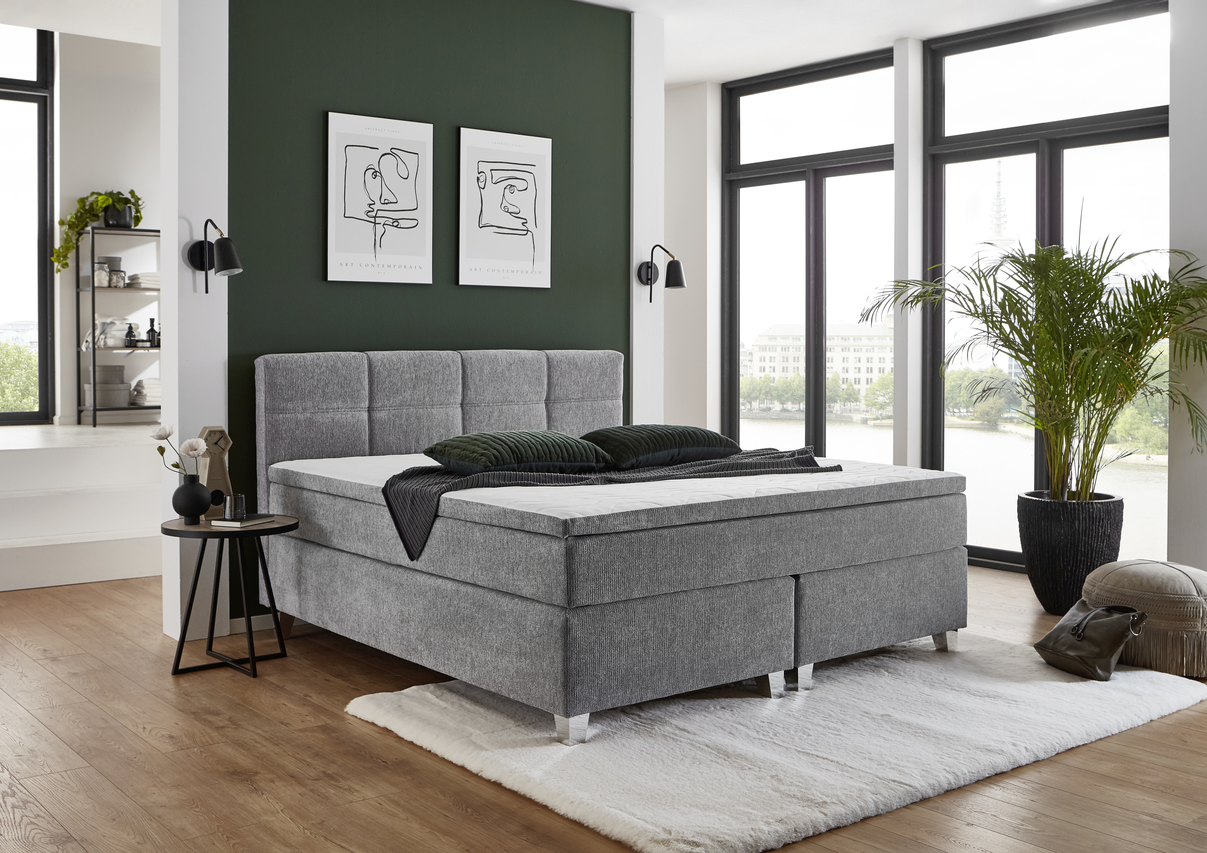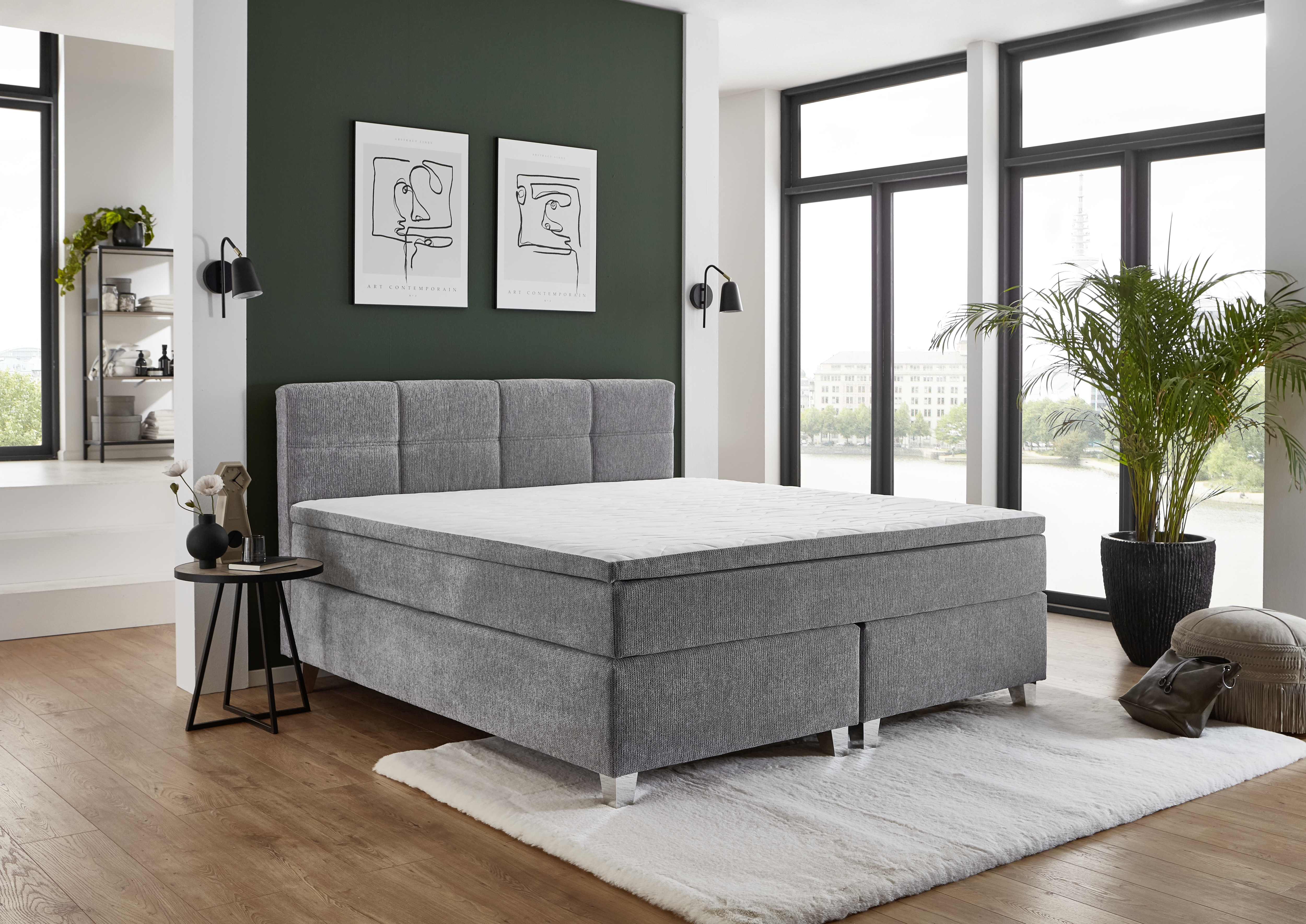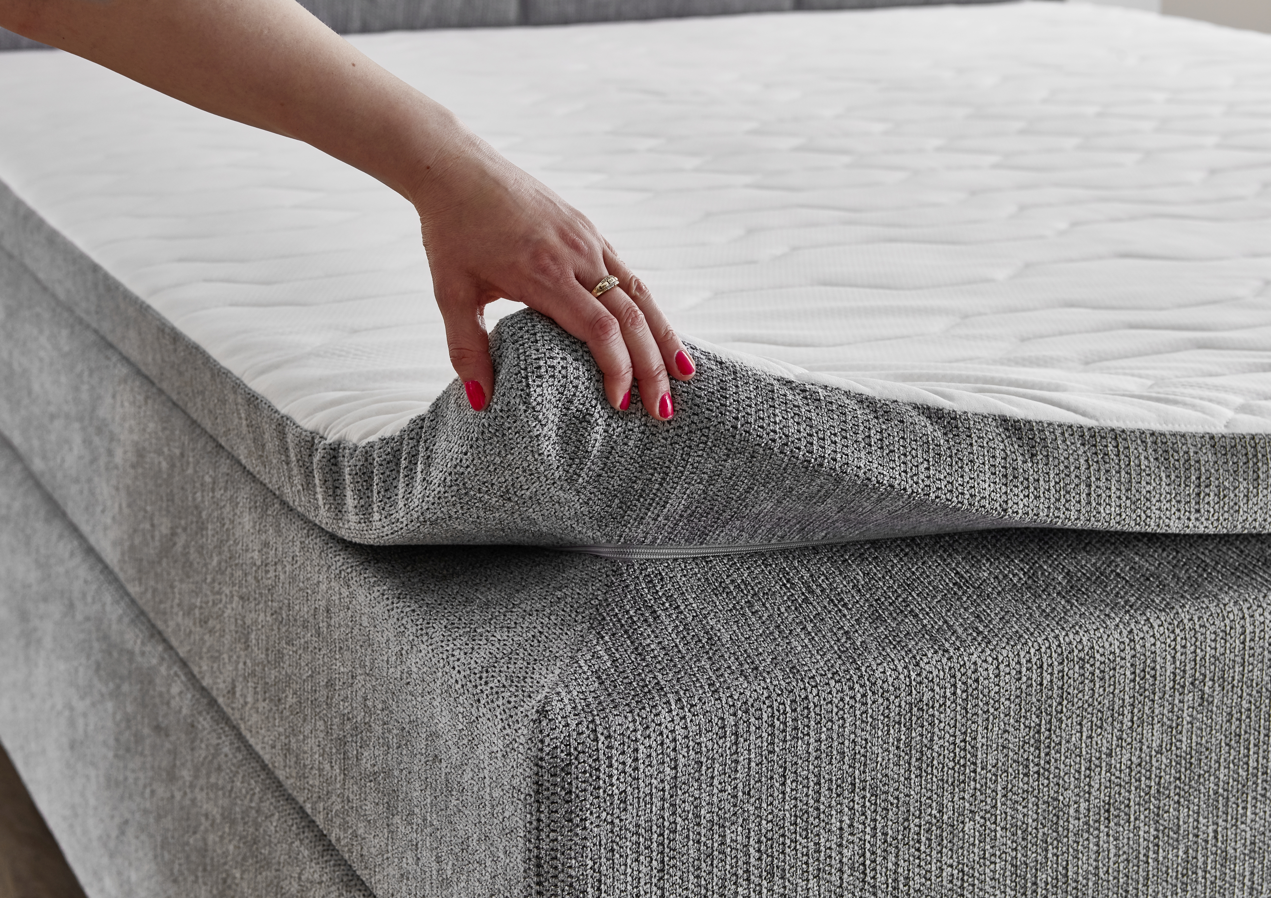 Revetement : lit boxspring en tissu 50530-720 couleur argent, 100 % polyester ; surface de couchage/double toile 100 % polyester