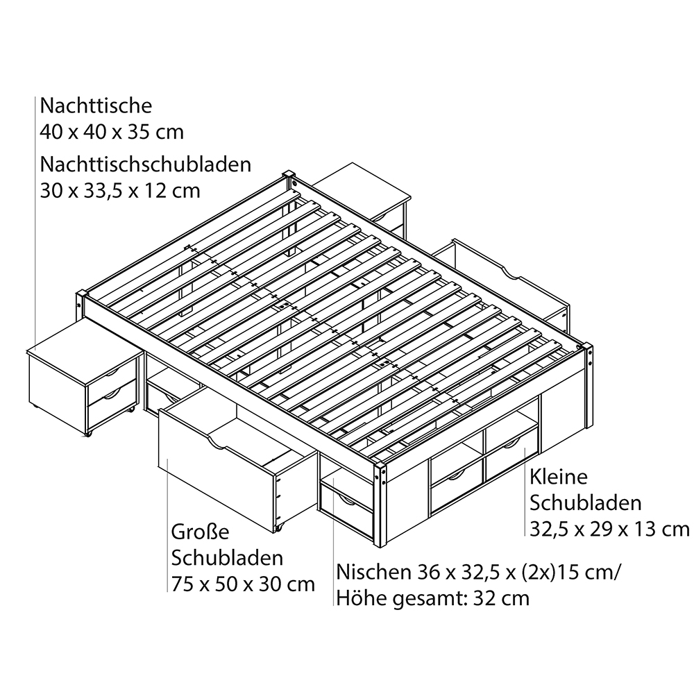 | Equipement lits: | Tiroirs, incl. chevet(s), incl. sommier à lattes | ||
