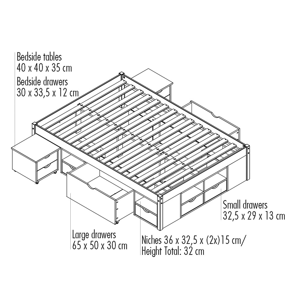 | Equipement lits: | Tiroirs, incl. chevet(s), incl. sommier à lattes , sans tête de lit |