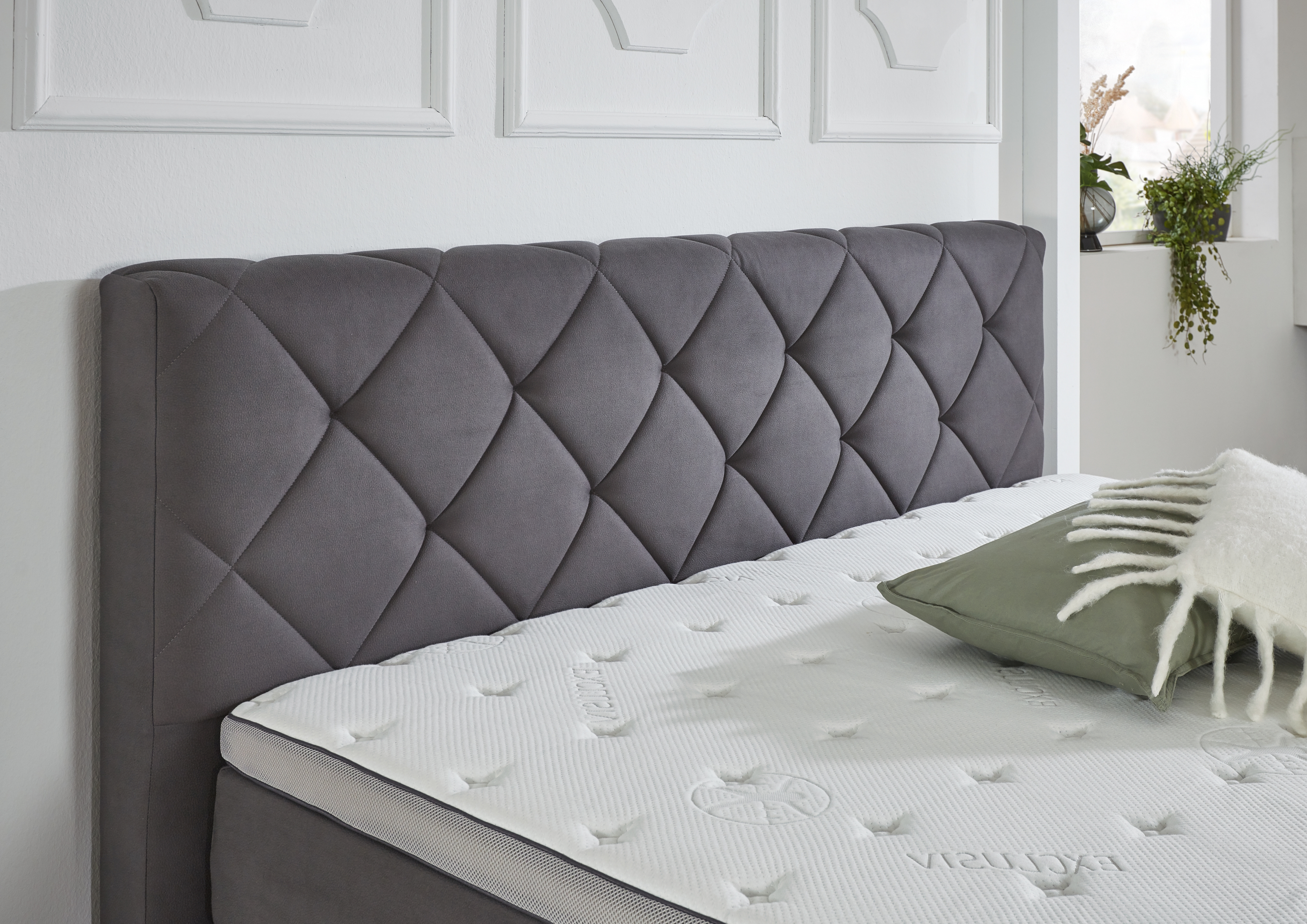 Tête de lit surpiquée en mousse polyuréthane 14 kg/m³ d'env. 2 cm d’épaisseur et non-tissé climatique en polyester