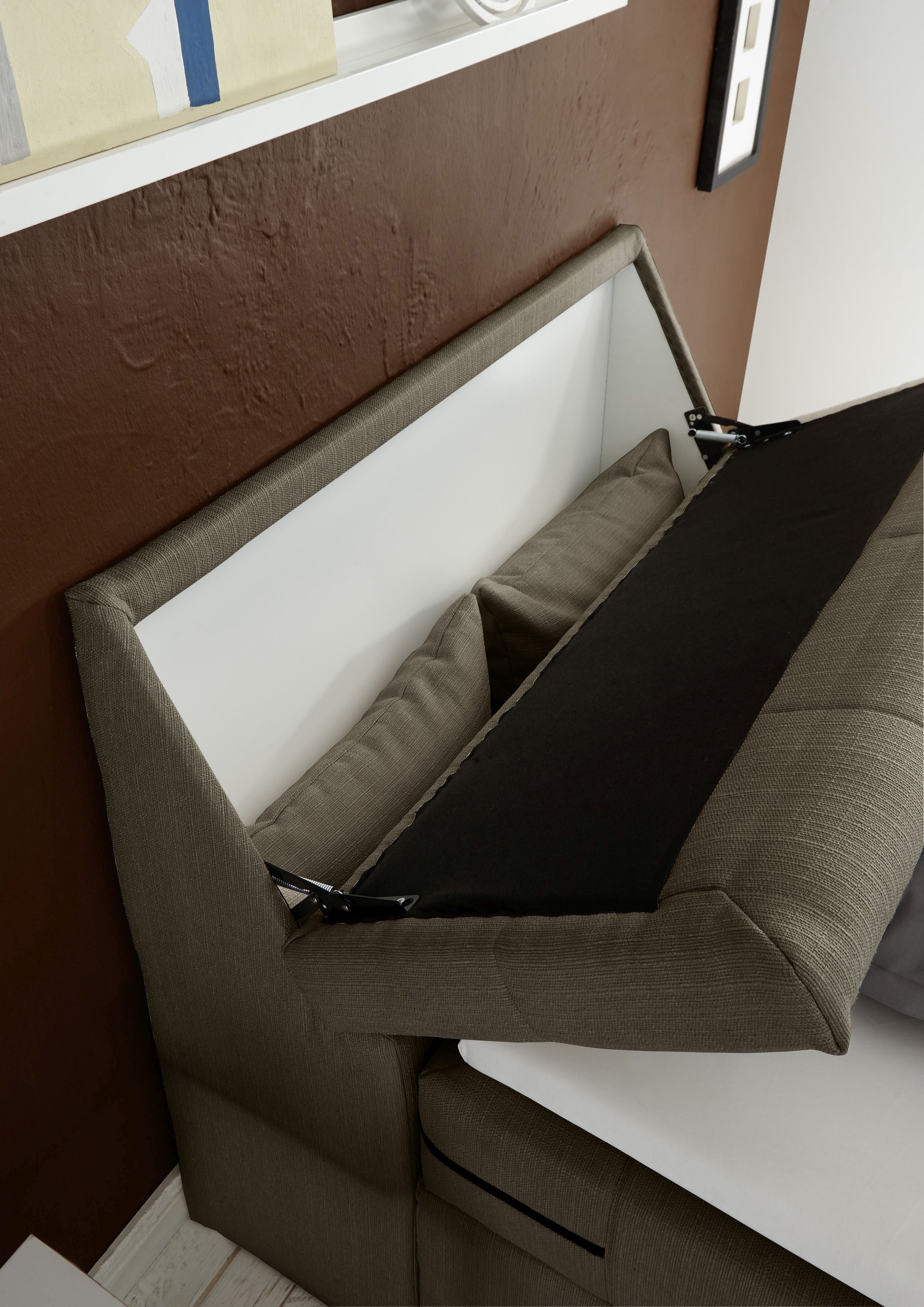 Grâce à cette configuration, le lit boxspring CONCORD 4 dispose d'une sensation de couchage médium et d'un degré de fermeté H2 pouvant supporter jusqu'à 120 kilos. Un détail supplémentaire : la tête de lit rabattable. Il vous suffit de l'ouvrir en un tour de main et d'utiliser l'espace de rangement supplémentaire pour avoir vos pyjamas, plaids, livres ou magazines toujours à portée de main.