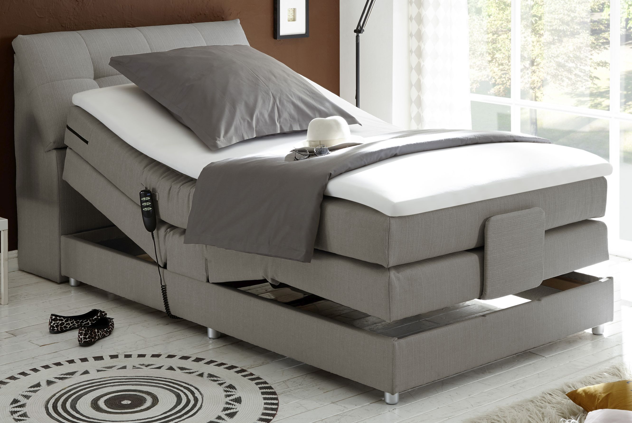 Mais derrière son superbe look se cache une grande technologie, bien visible : la télécommande électrique fixée sur le côté du lit. Elle permet de régler la surface de couchage. En fonction de la manière dont vous souhaitez l'adapter à vos besoins, il vous suffit simplement d'appuyer sur la télécommande. Pas besoin de soulever et de tirer laborieusement la literie, pas même de se lever : c'est le summum du confort !