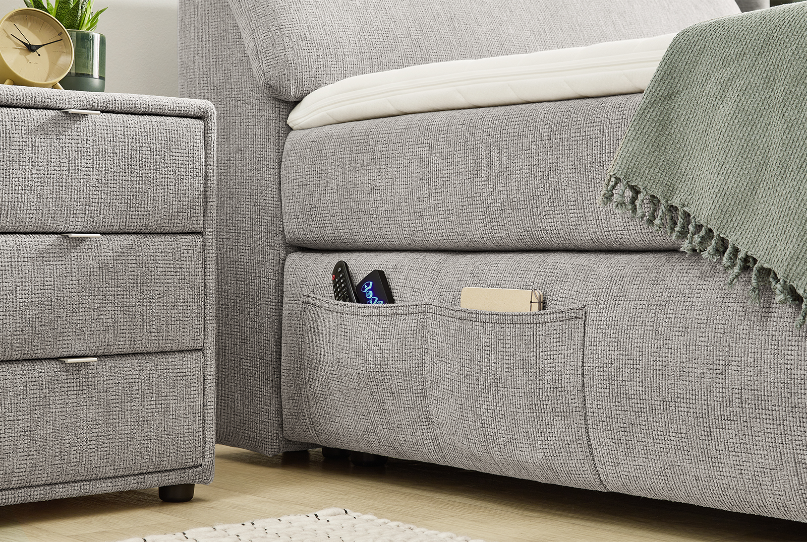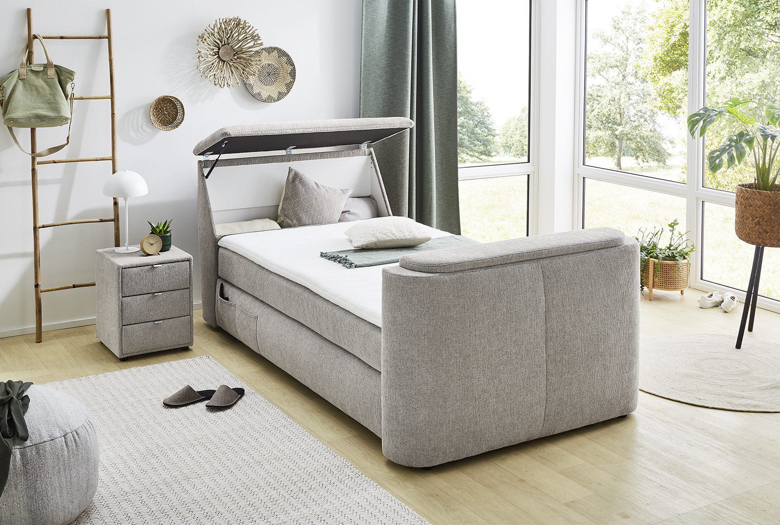 La structure de ce lit boxspring est composée d’un coffre de lit avec garnissage à ressorts bonnell. Sur ce caisson se trouve un matelas à ressorts bonnell. La double suspension ainsi formée crée un confort unique avec une adaptation optimale à la morphologie du dormeur et une réduction de la pression. Le surmatelas en mousse polyuréthane apporte la touche finale à ce lit boxspring. Ce lit boxspring garantit un confort de sommeil extraordinaire grâce à son excellent système individuel de suspension double. Le coffre de lit aéré intégré peut être ouvert facilement à l'aide d'un vérin à gaz et offre ainsi un bel espace de rangement