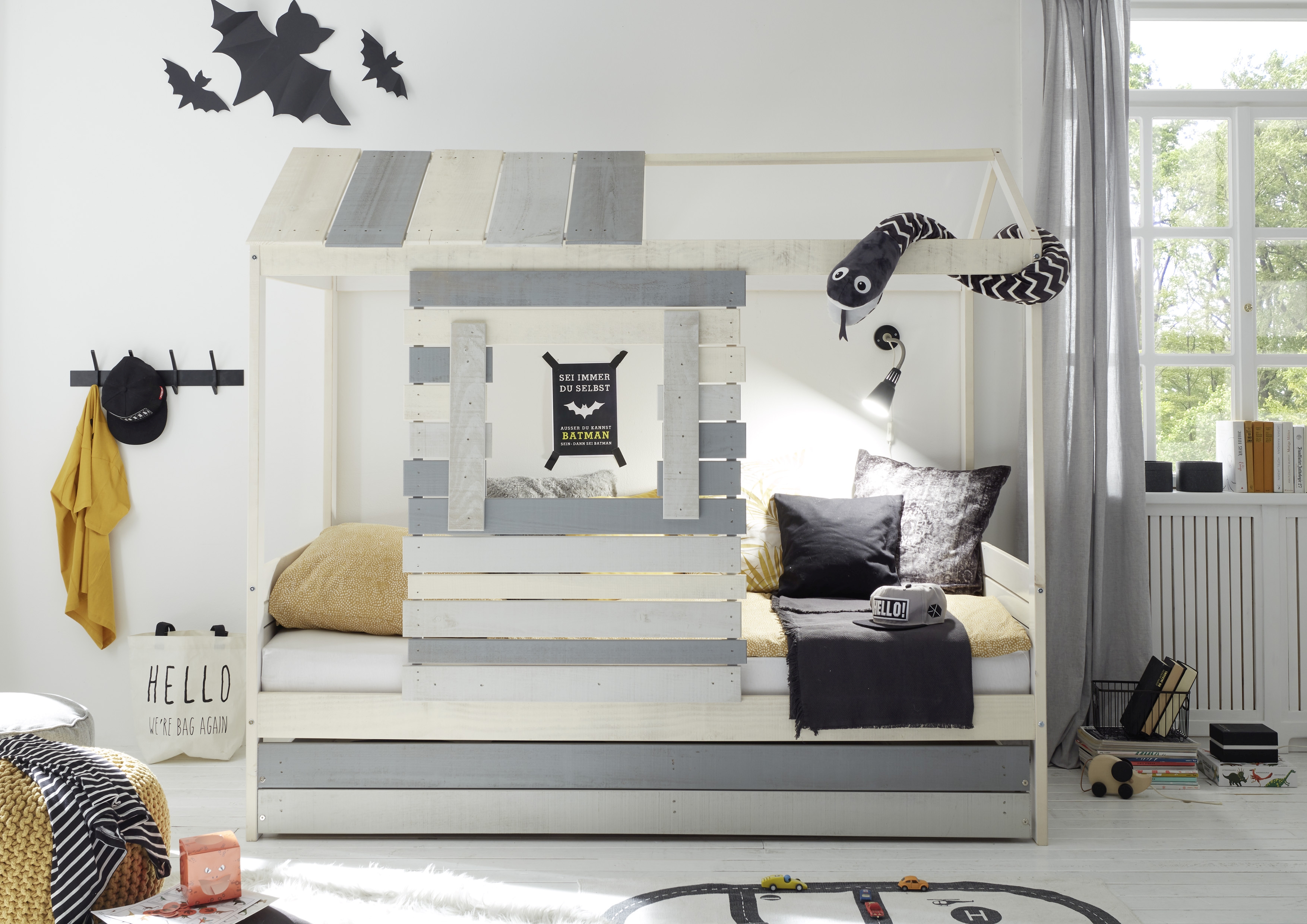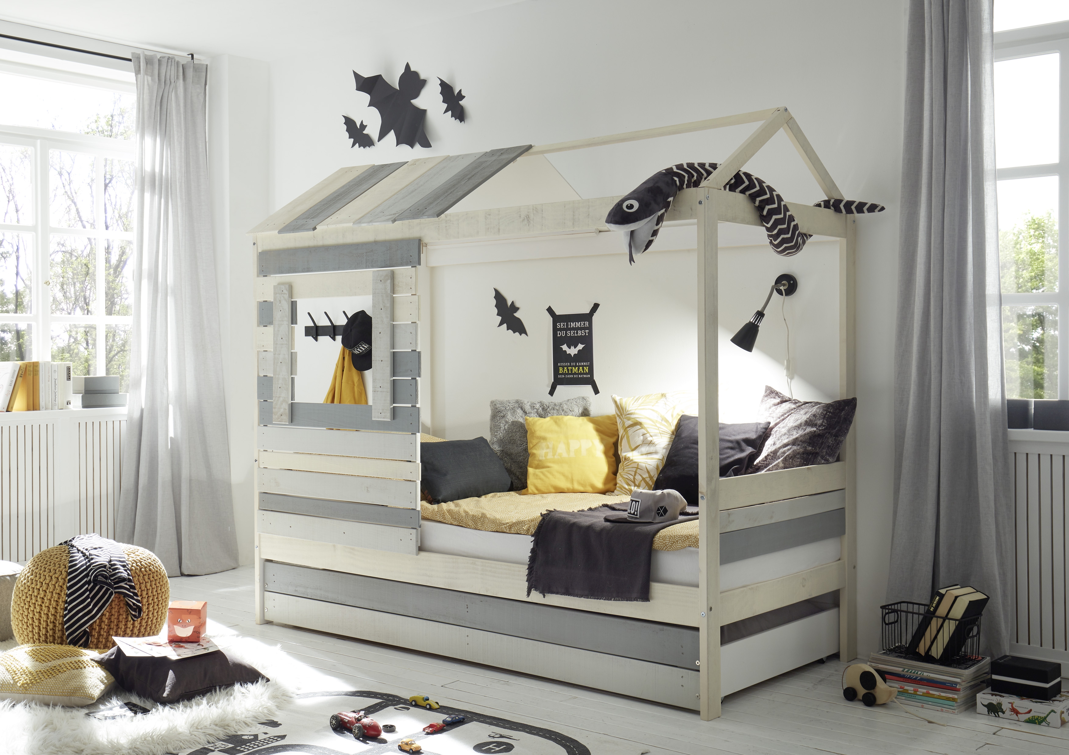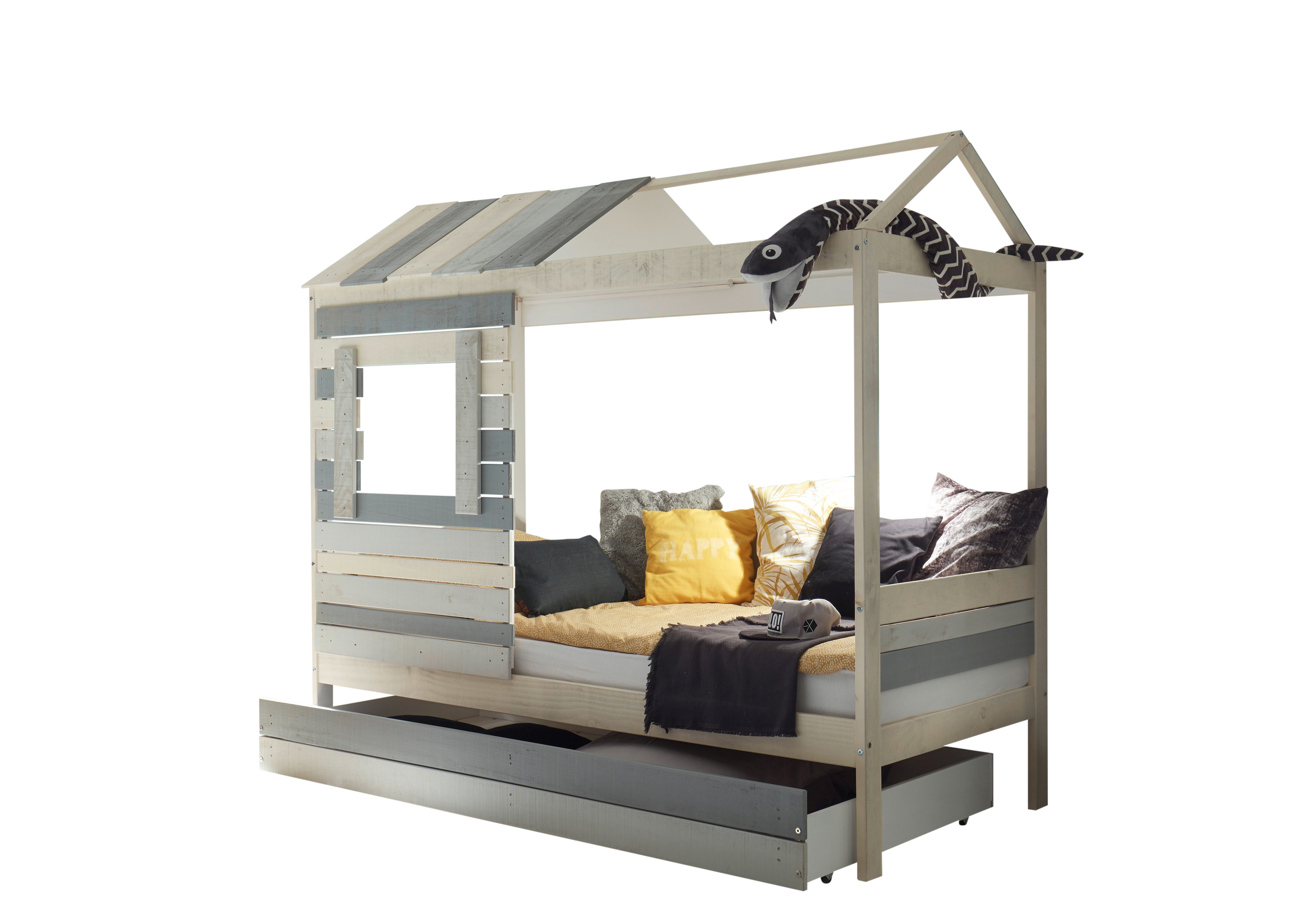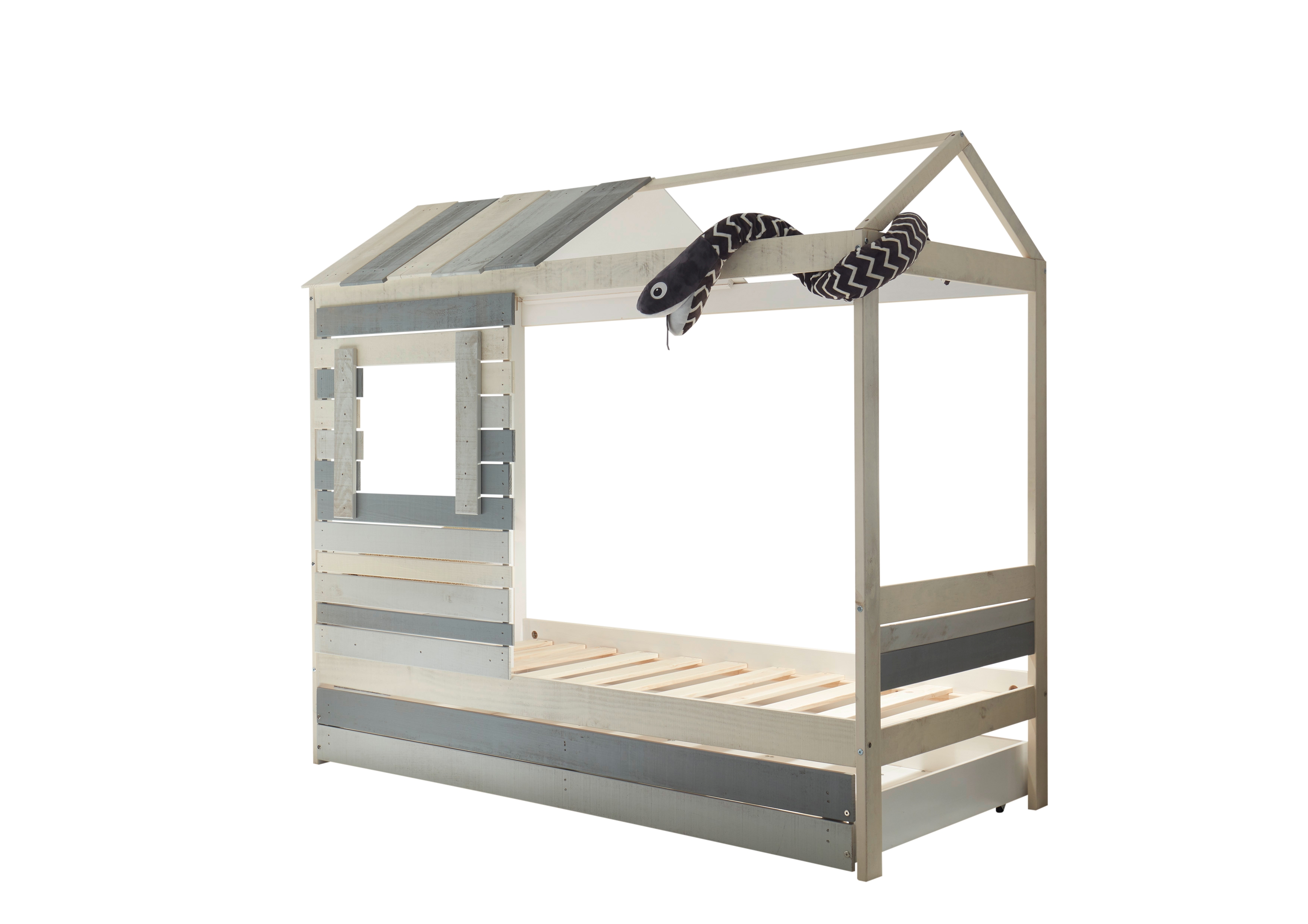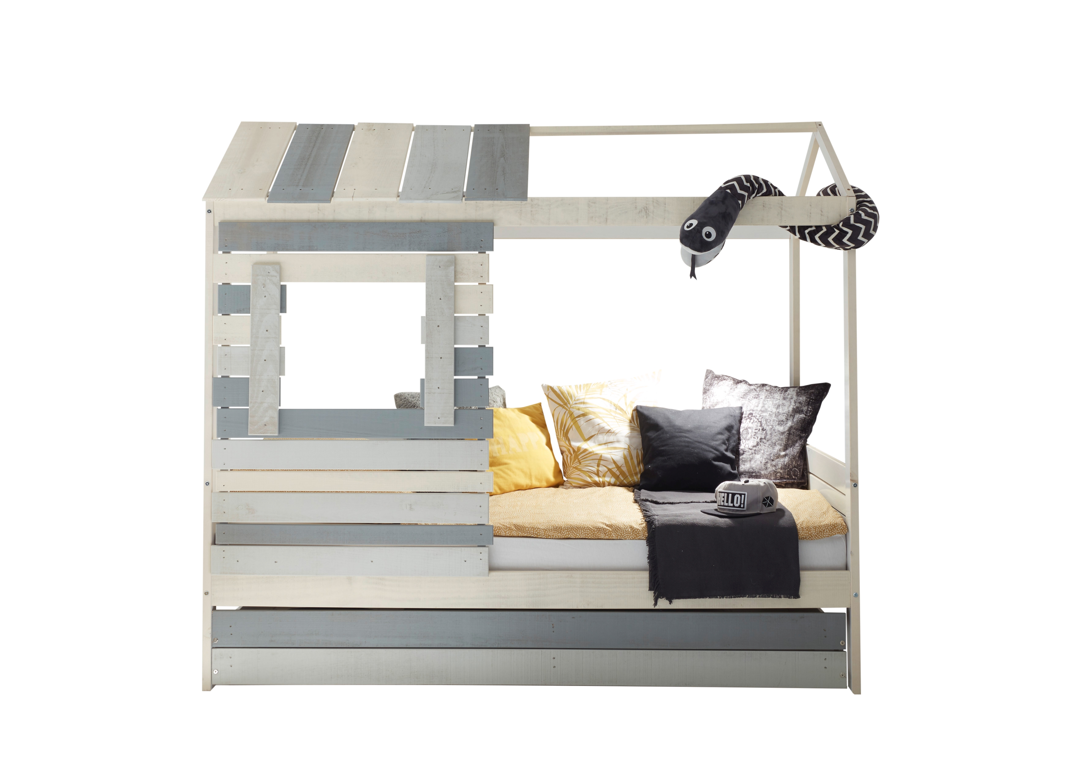 Lit gigogne en forme de maison avec porte coulissante et 2 couchages inclus (lattes fixes)