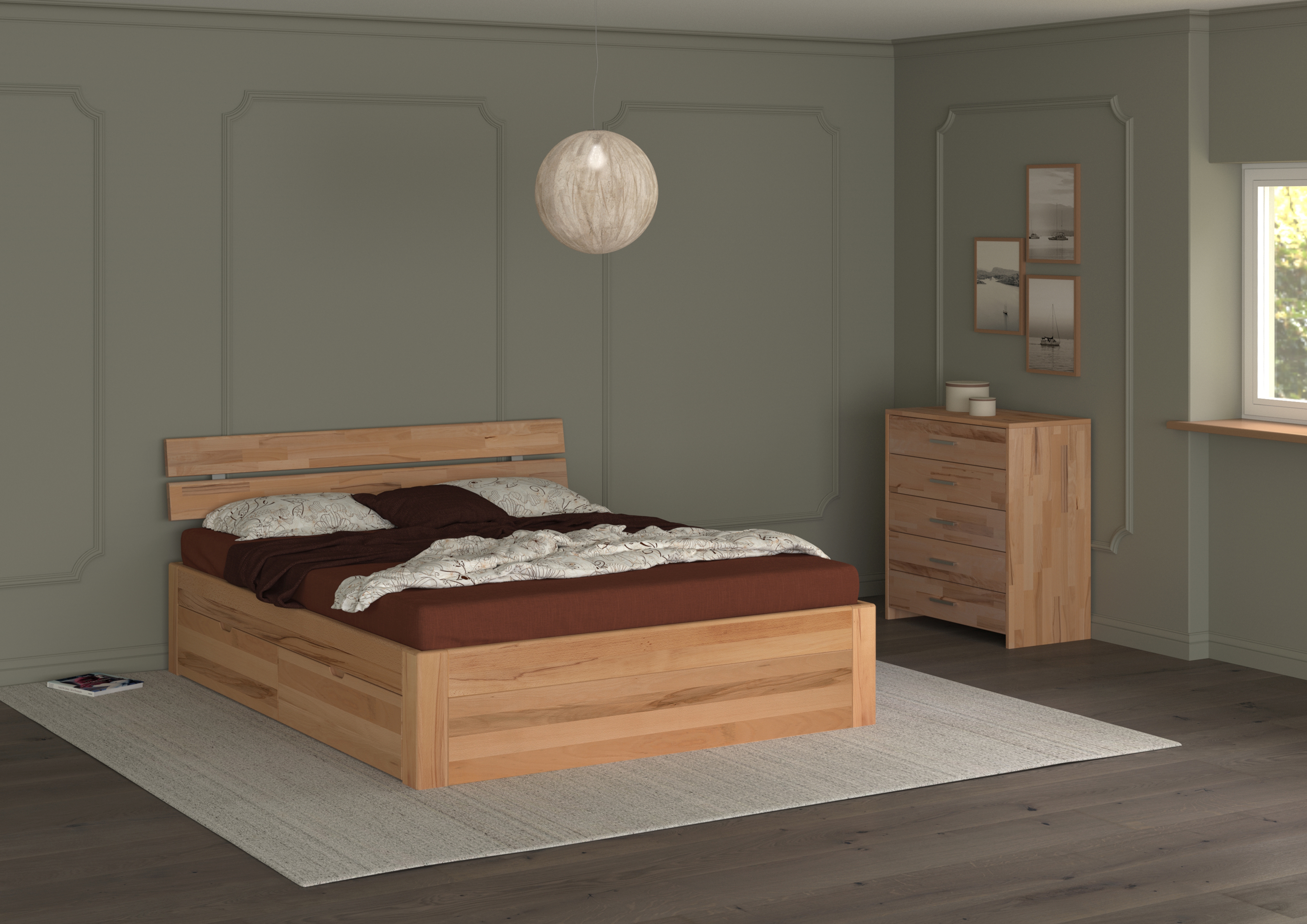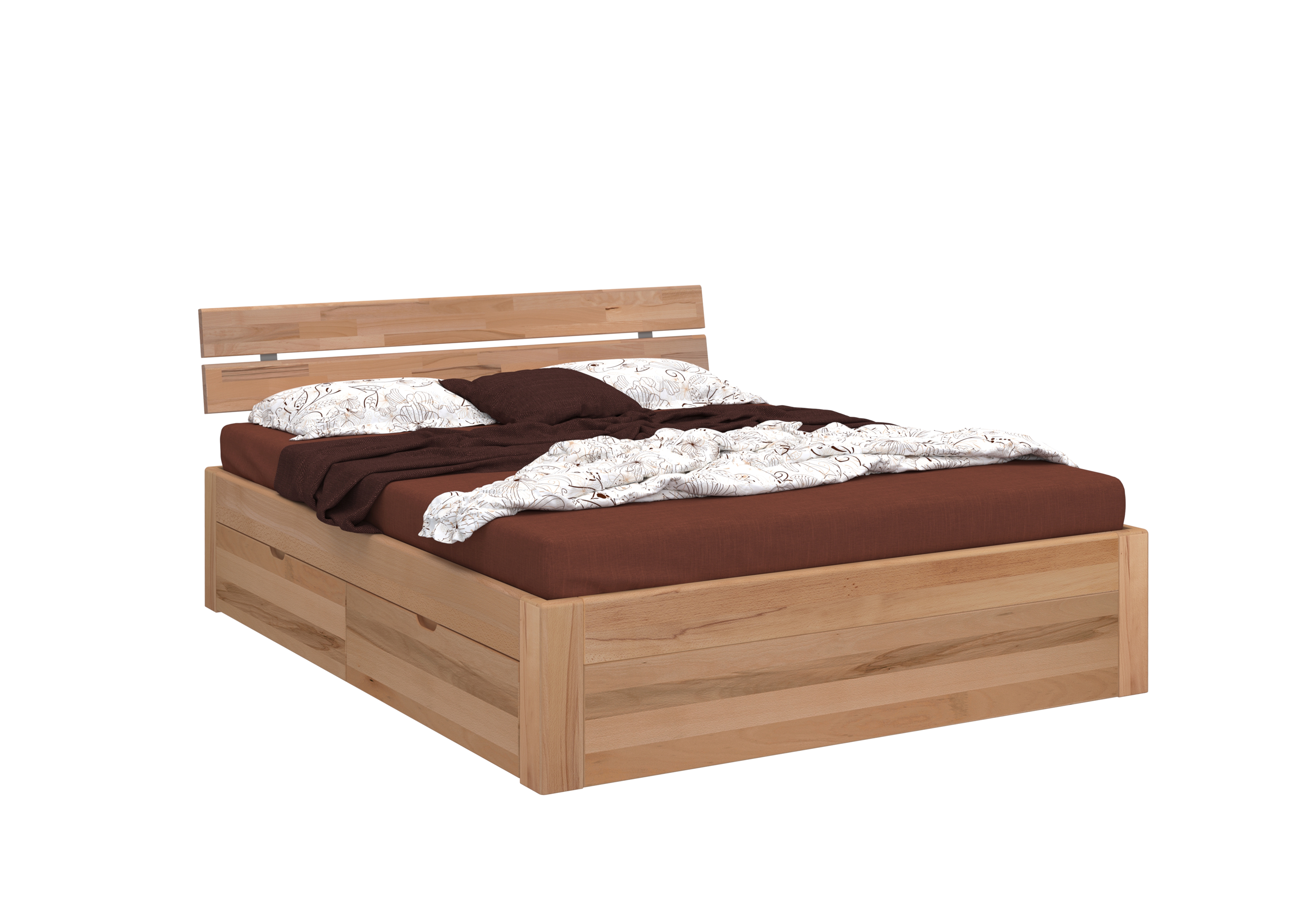 Cadre de lit et tiroirs : cœur de hêtre massif (Pologne) ton naturel, huilé