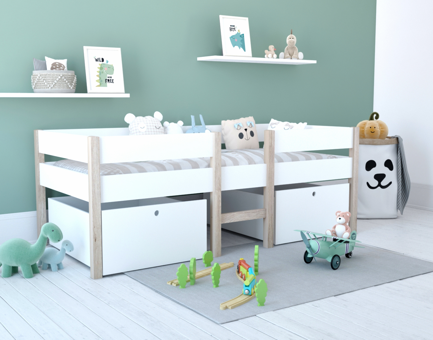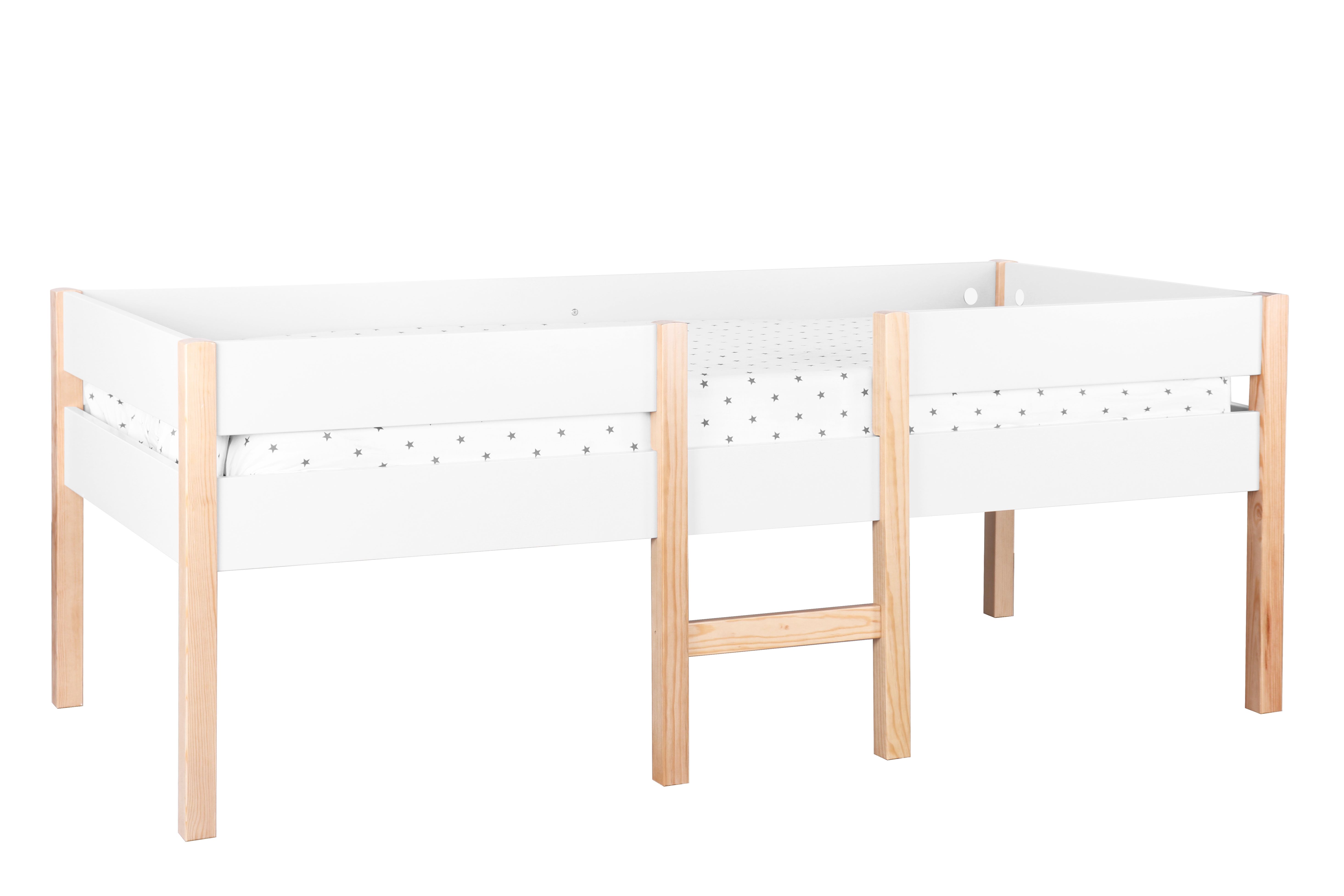 Ce lit mezzanine dans un design scandinave permet d'utiliser la place dans la chambre d'enfant de façon optimale. La barrière anti-chute sur tout le pourtour offre une sécurité supplémentaire pour votre enfant. Le sommier à lattes pour une taille de matelas de 90x200 cm est compris dans la livraison. Le lit est fabriqué en MDF laqué ton blanc et bois de pin. Deux grands tiroirs feront régner l'ordre et garantiront un bel espace de rangement pour les jouets et Cie. Le lit mezzanine avec une touche scandinave sobre et élégante offre une solution unisexe pour de nombreuses possibilités en matière d'aménagement de la chambre d'enfant pour tous les âges.