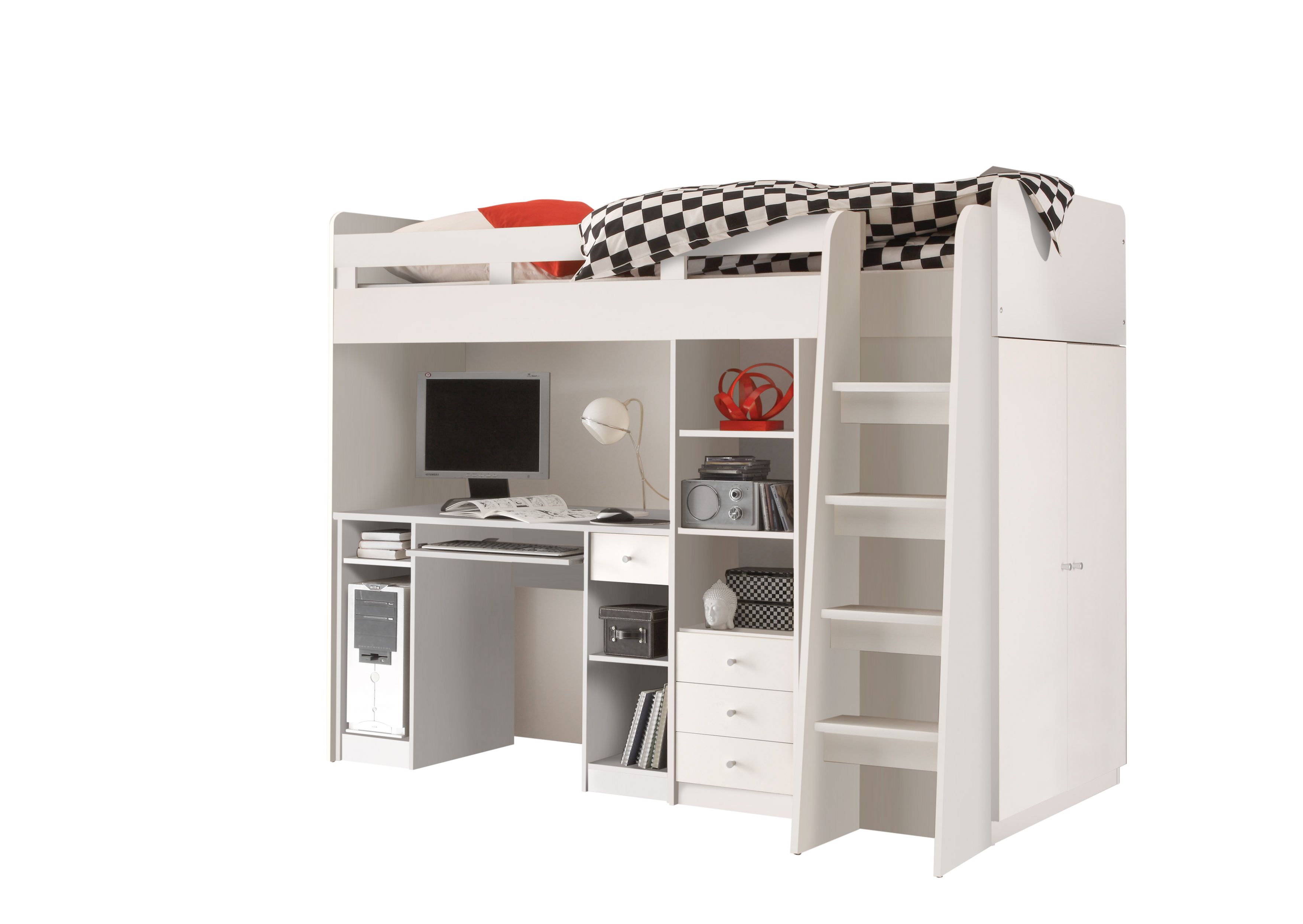 1 bureau avec tablette coulissante pour clavier, à droite 1 tiroir et 2 casiers ouverts, à gauche 2 casiers ouverts