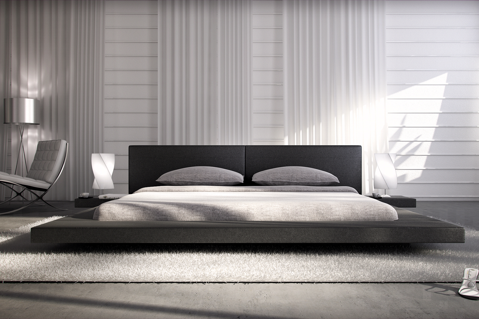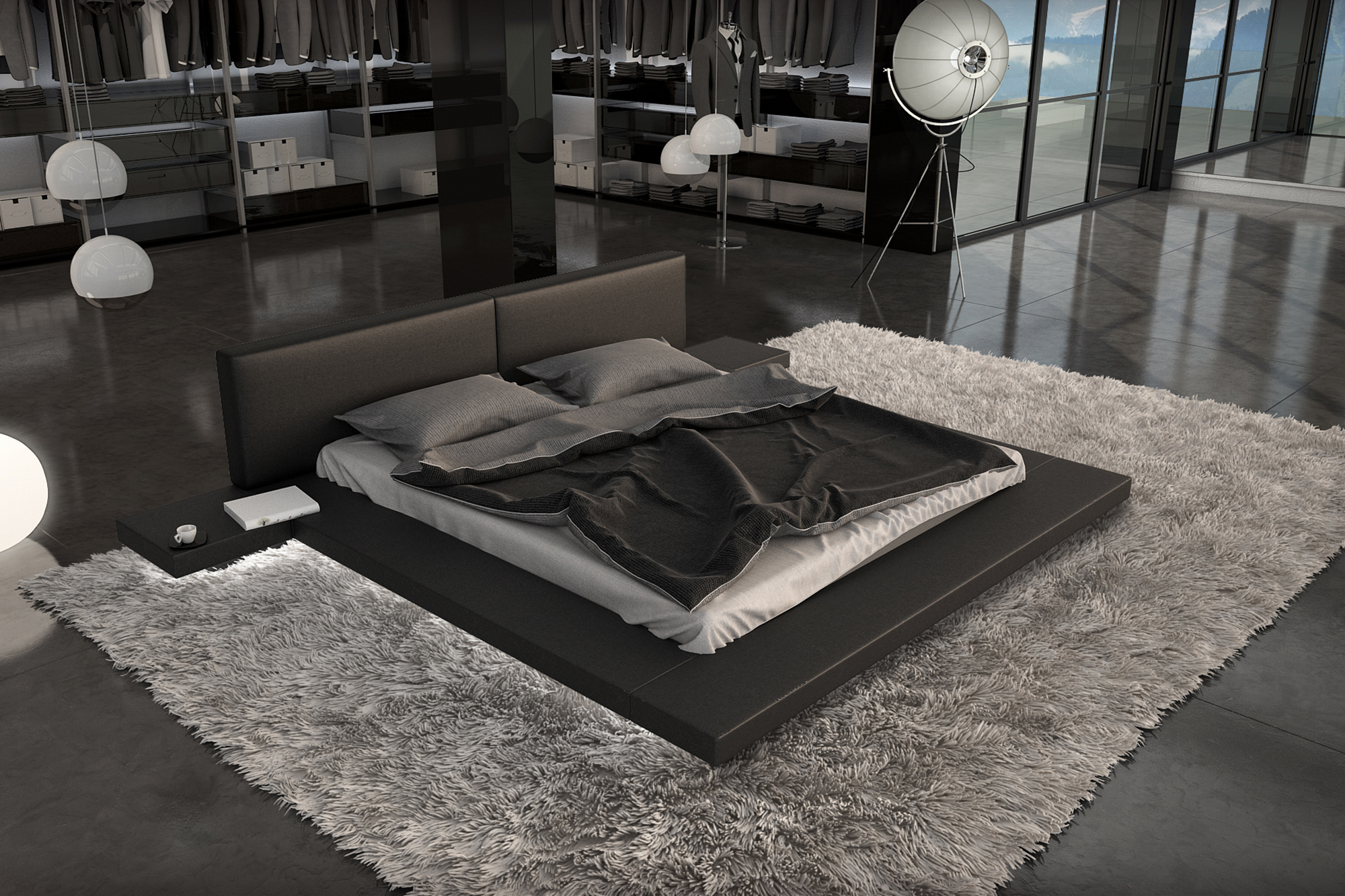 Une véritable perle parmi les lits design. Ce lit rembourré moderne ton noir séduit par ses lignes épurées. Sa faible hauteur et ses pieds décalés plus bas sous le lit, lui confèrent un design aérien. Le revêtement chic est en cuir synthétique facile d’entretien. Le lit est équipé d’une traverse centrale autoportante. Profitez de la possibilité d’utiliser deux petits matelas ou un grand matelas avec des degrés de fermeté différents. C’est un véritable avantage pour les couples qui ont des habitudes de sommeil différentes. Les deux tables de chevet, harmonieusement intégrées dans le design global du lit, sont particulièrement raffinées. Les bandeaux LED créeront une ambiance agréable et chaleureuse dans votre chambre à coucher : la solution idéale pour les longues soirées télé ou lecture. Avec ce petit bijou de design, vous pourrez créer un espace de repos personnalisé dans votre chambre à coucher.