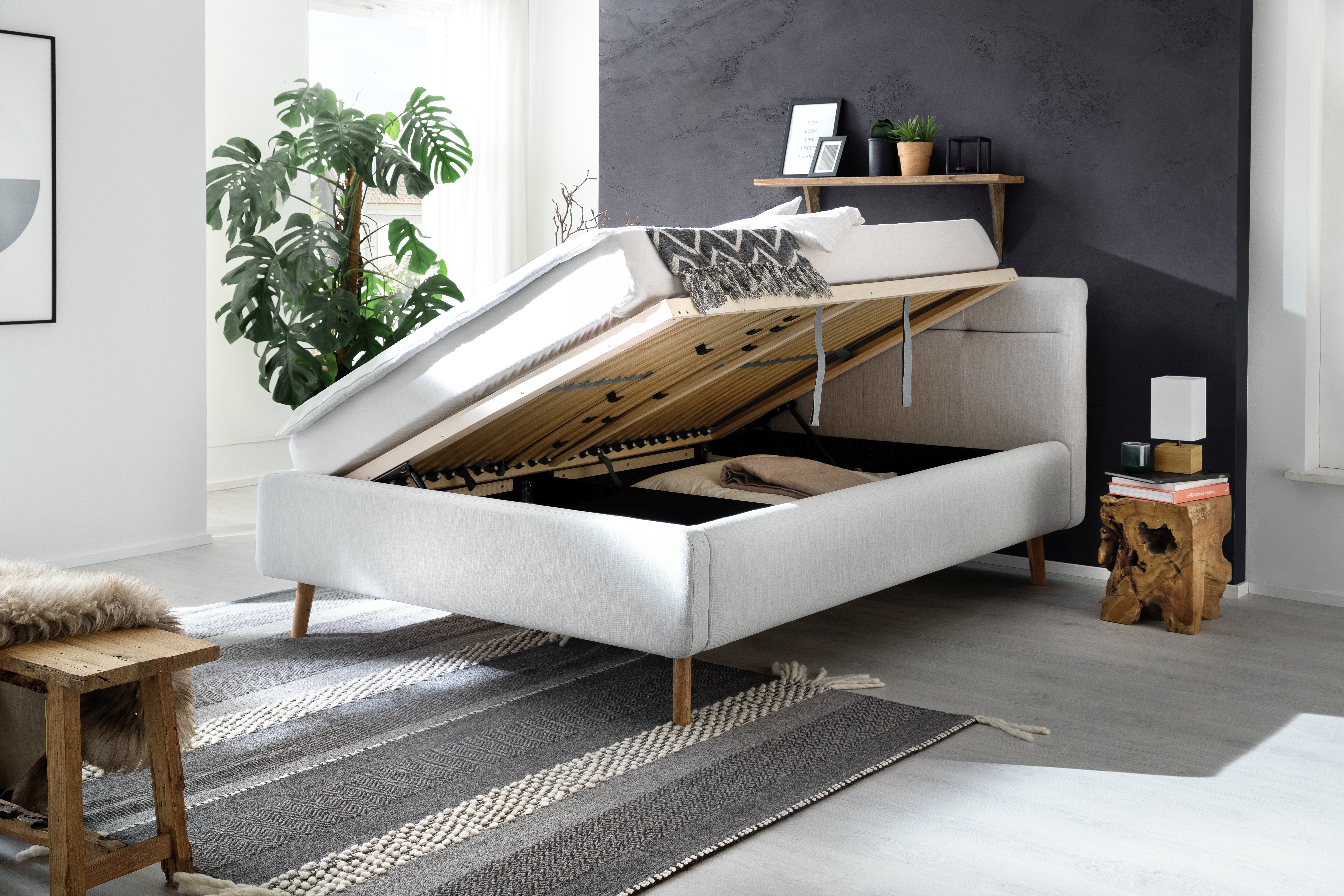Inclus : coffre de lit avec aération et sommiers à lattes en bois multiplis avec ouverture latérale