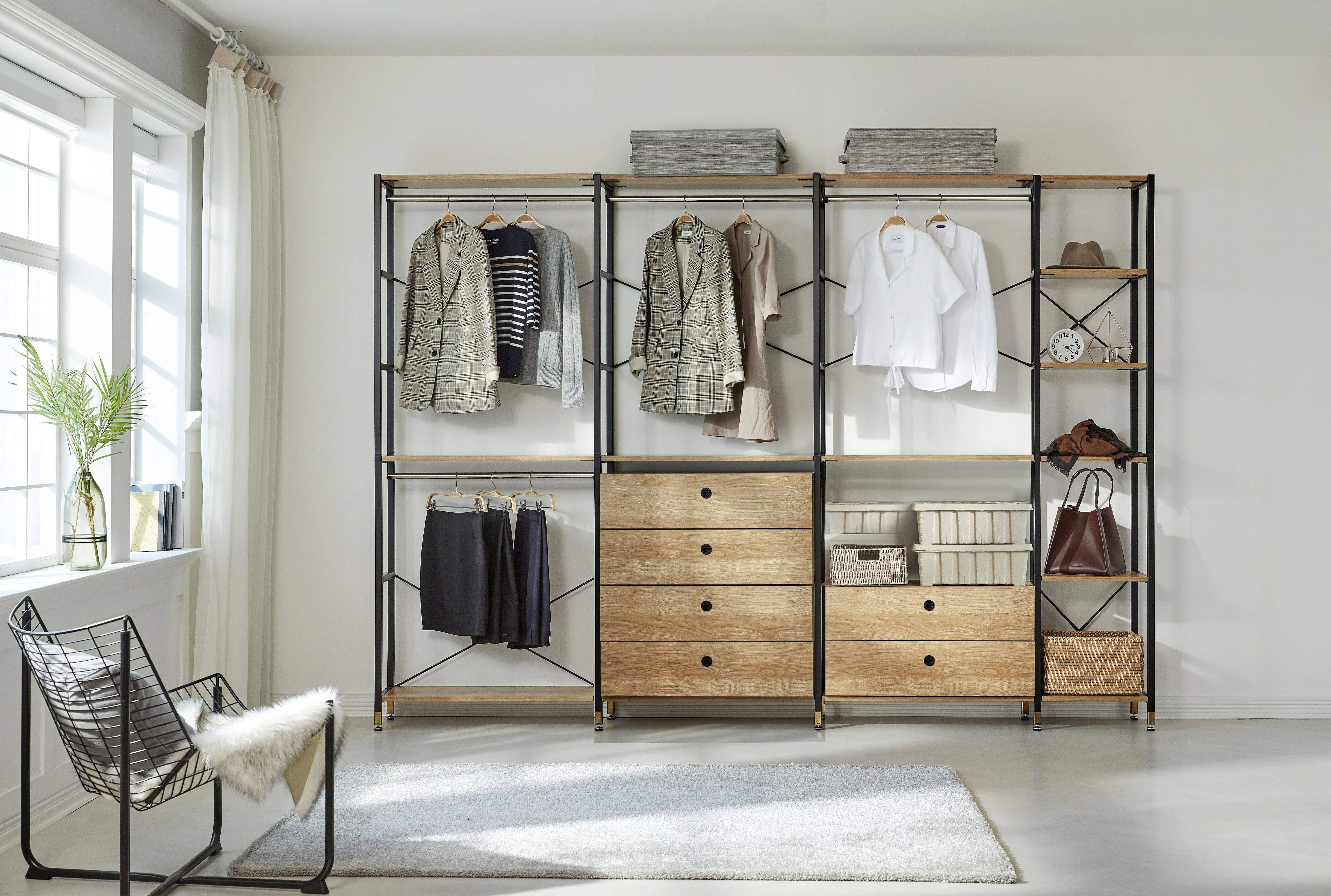 1 étagère large avec 2 tablettes, 4 tiroirs et 1 barre de penderie