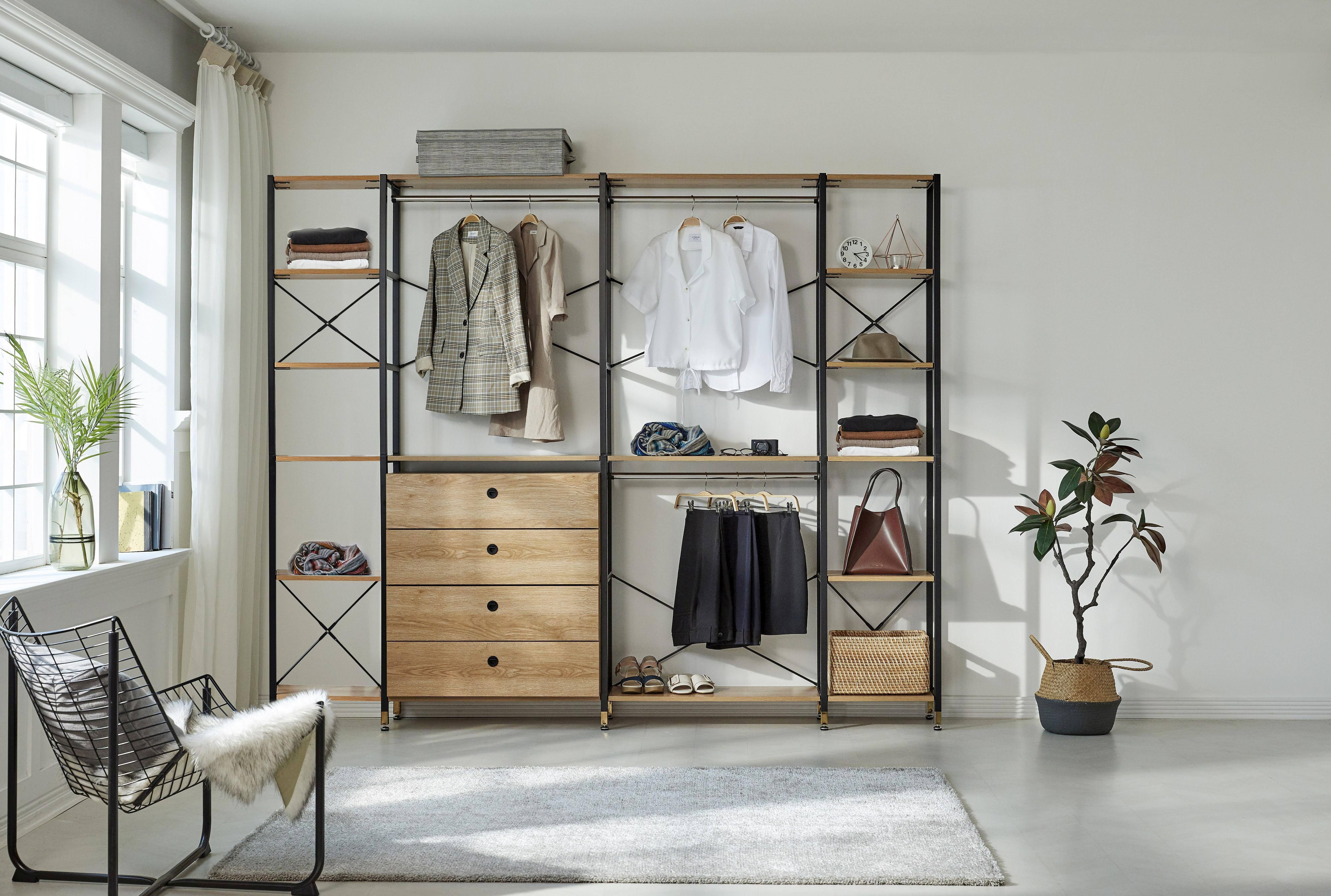 1 étagère large avec 2 tablettes, 1 barre de penderie et 4 tiroirs