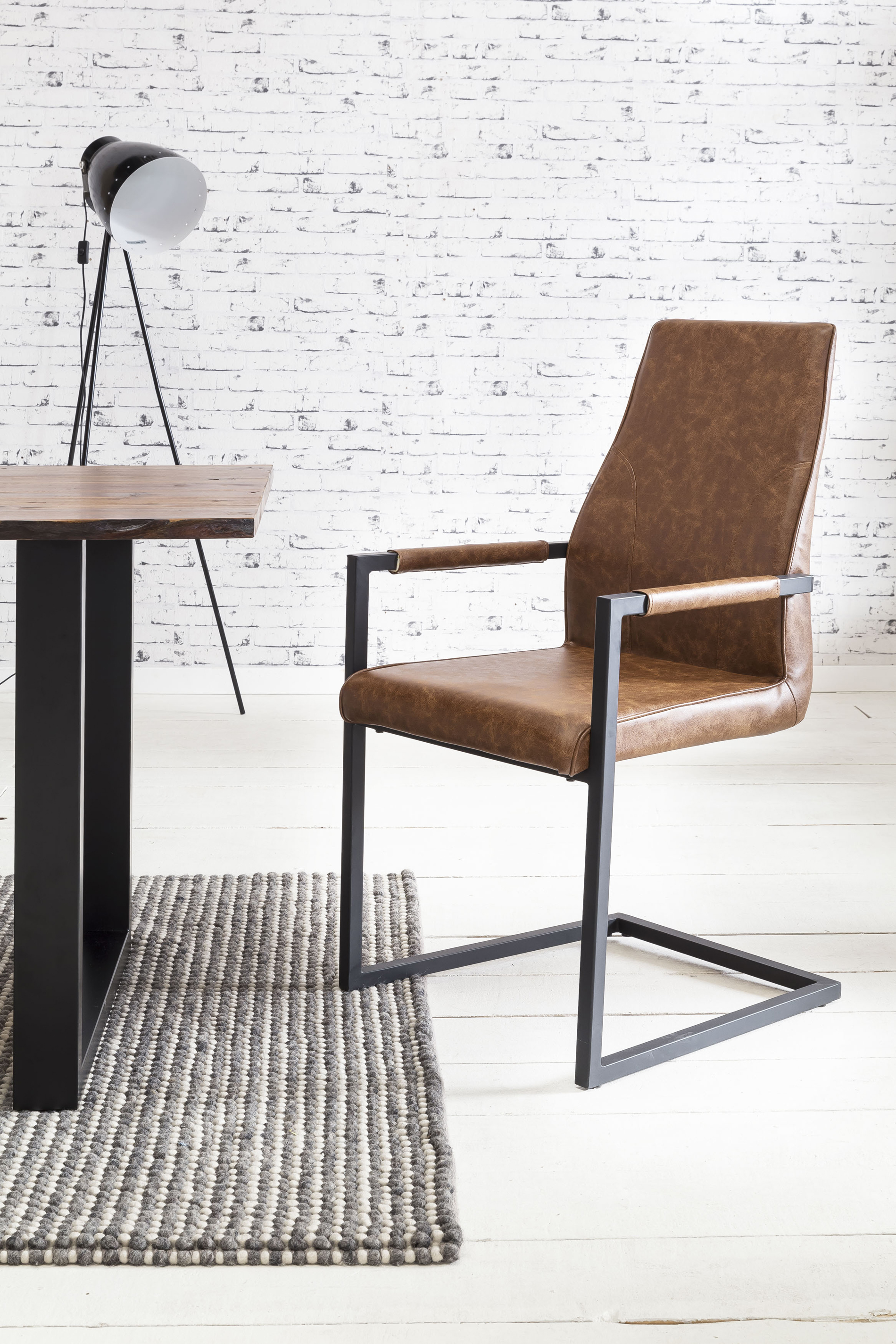 Lot de 2 jolies chaises à piètement luge. Les accoudoirs, ainsi que l'assise et le dossier, sont recouverts d'un revêtement de qualité aspect cuir. Le piètement luge est fabriqué en métal laqué ton noir et garantit une excellente stabilité. Les accoudoirs disposent d'un rembourrage en cuir synthétique et le dossier haut est légèrement incurvé. Grâce au rembourrage confortable, aux accoudoirs et au dossier ergonomique, vous bénéficierez d'un confort d'assise haut de gamme et pourrez vraiment vous détendre.
