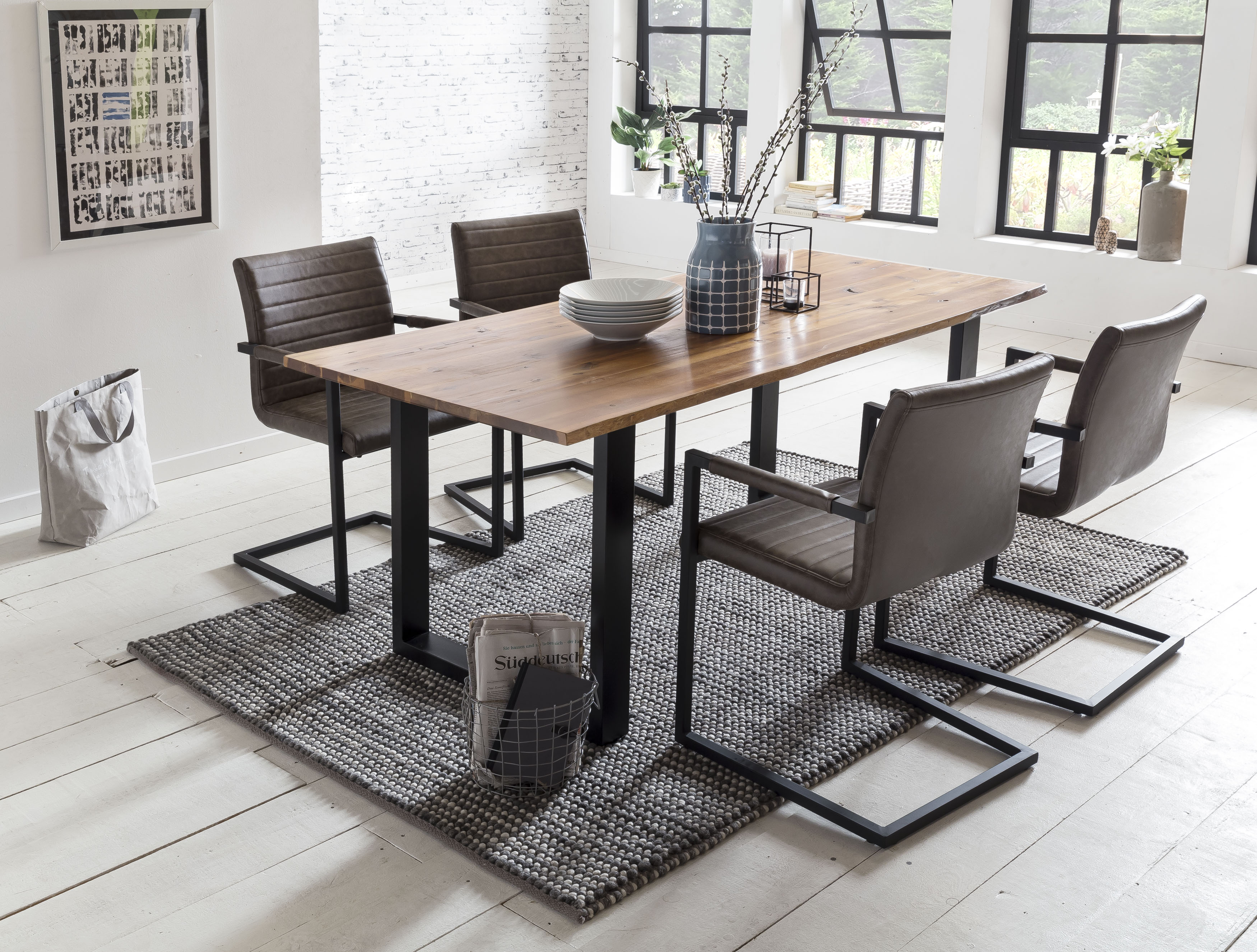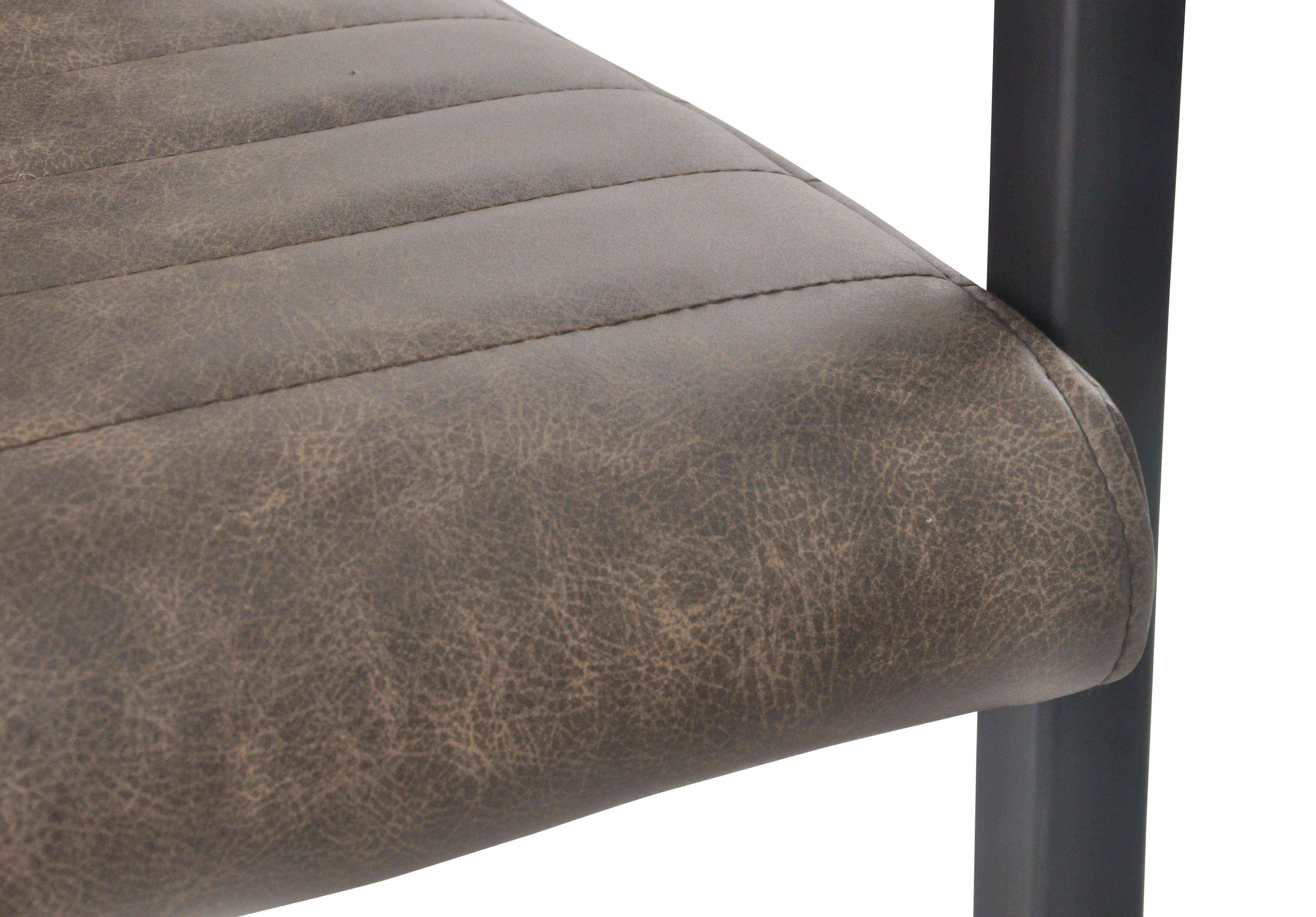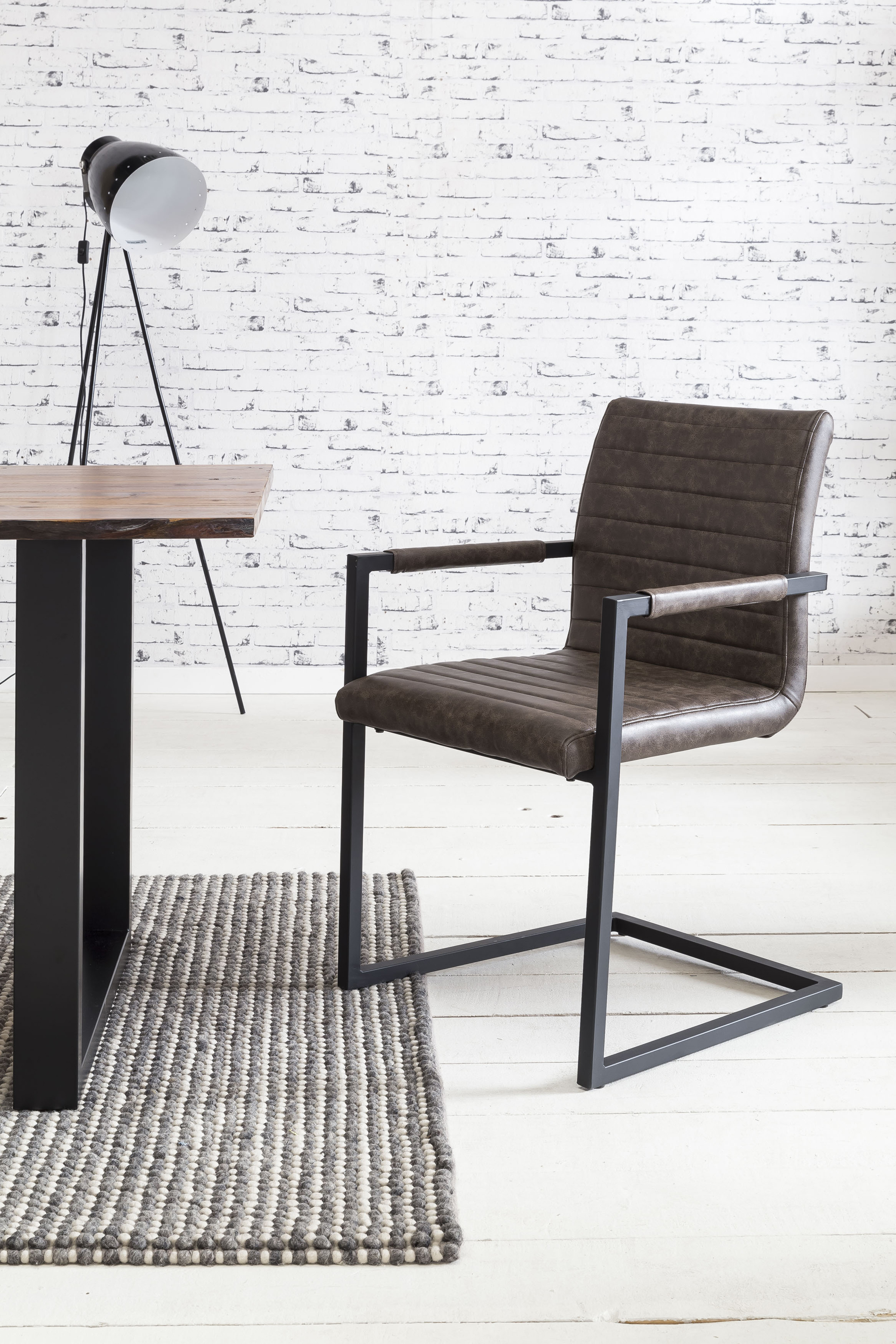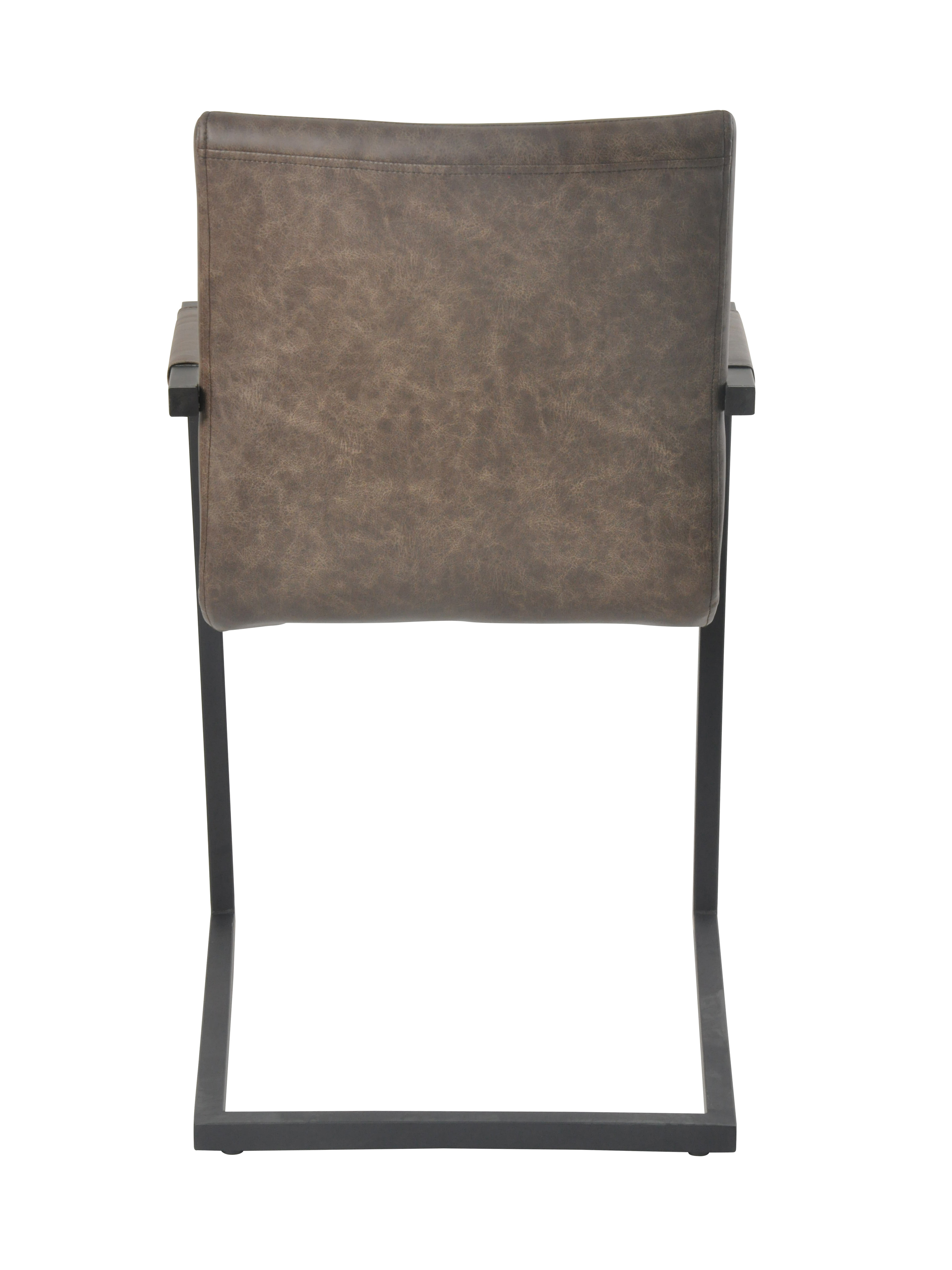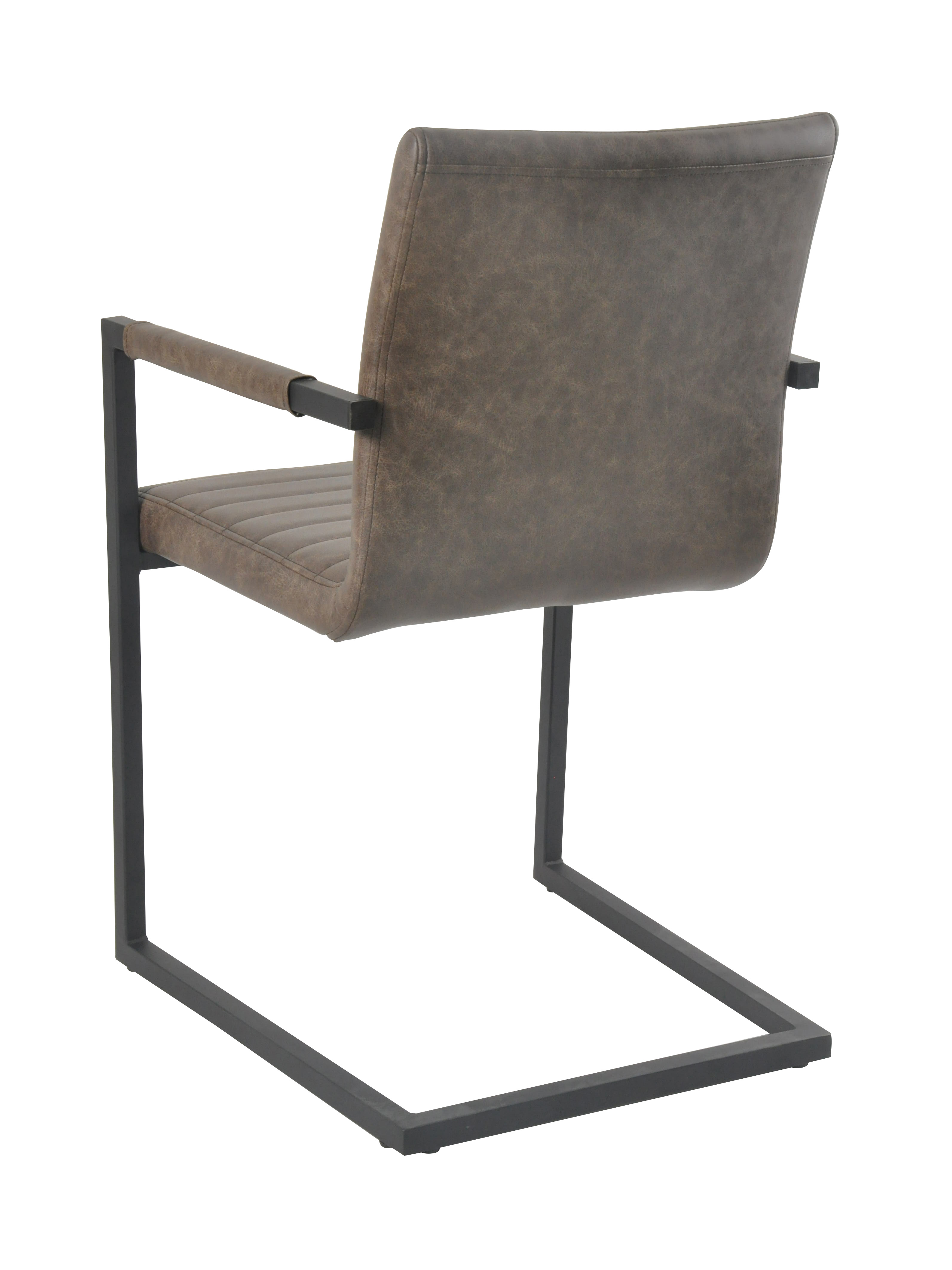 La chaise à piétement luge au design industriel séduit par son revêtement de qualité aspect cuir, son dossier et ses accoudoirs avec un rembourrage en cuir synthétique. Le piètement luge en métal laqué ton noir garantit une excellente stabilité tout en offrant un superbe contraste avec le revêtement de la chaise. L'assise et le dossier sont pourvus de surpiqûres horizontales. Grâce au rembourrage confortable, aux accoudoirs et à la hauteur ergonomique du dossier, vous bénéficierez d'un confort d'assise haut de gamme et pourrez vraiment vous détendre.