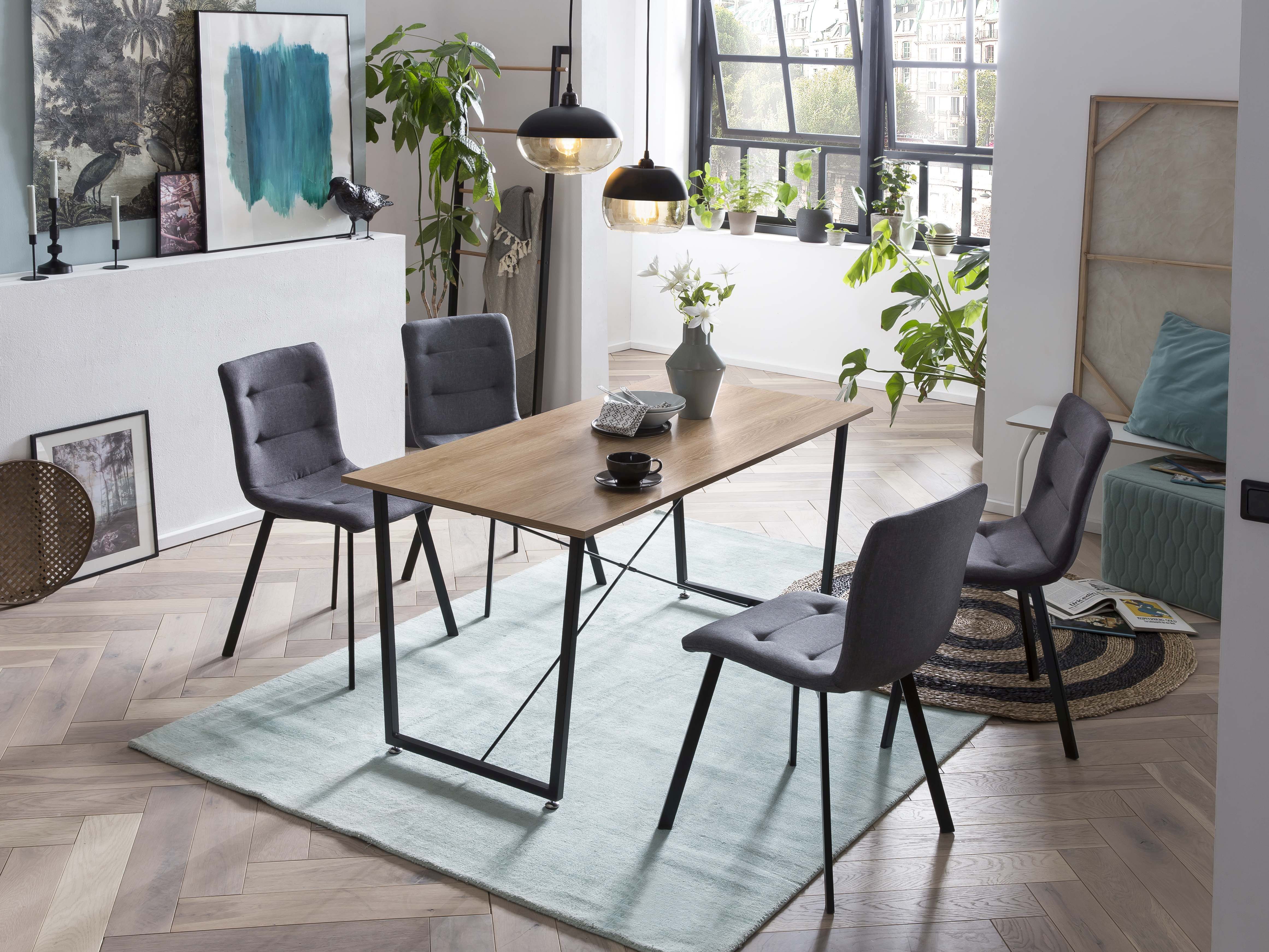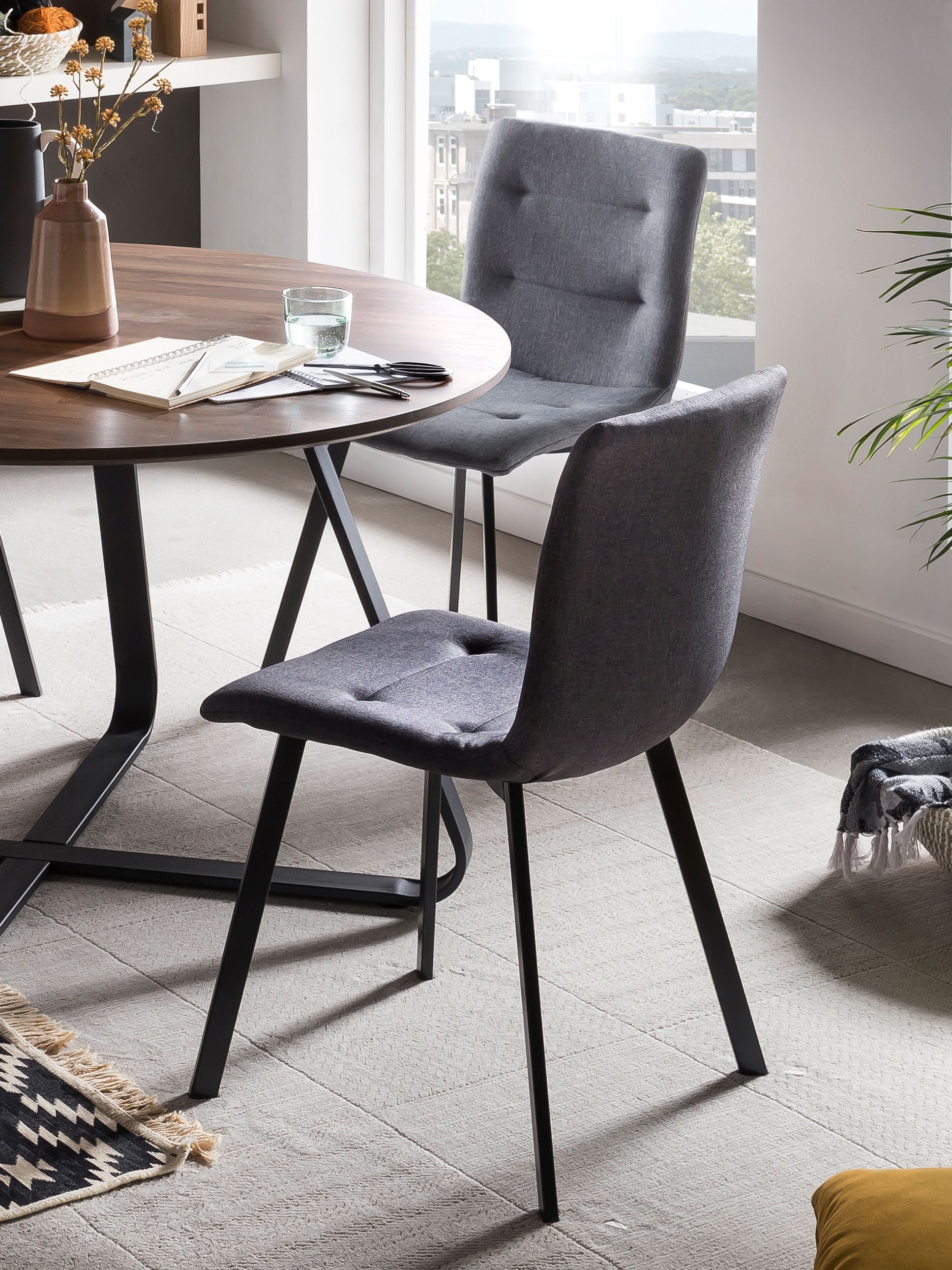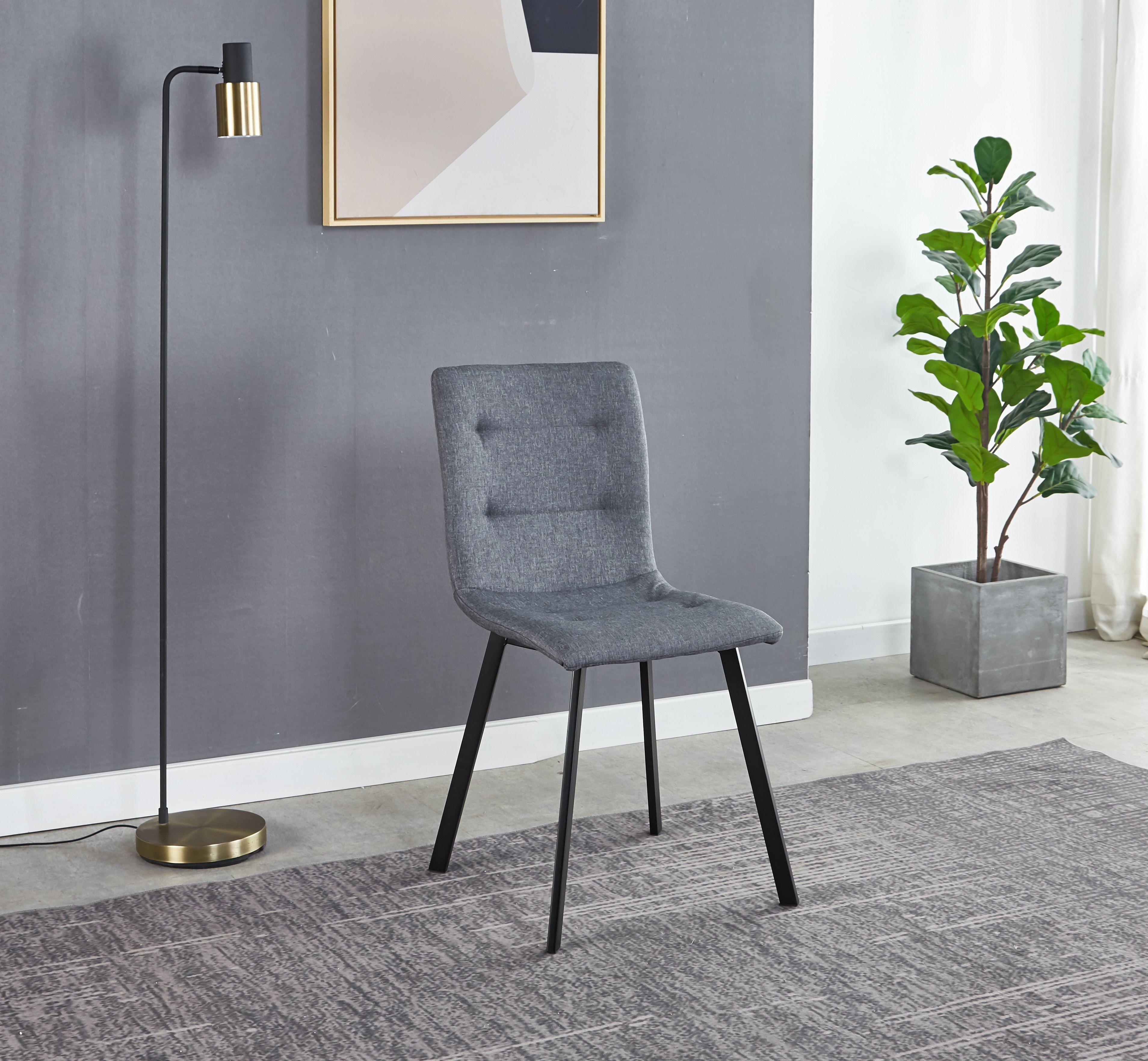 La chaise de salle à manger moderne rend le coin repas encore plus accueillant. Un tissu de qualité a été utilisé pour le revêtement. Grâce au garnissage confortable, rester en position assise pendant longtemps ne pose aucun problème. Le piètement en acier n'offre pas seulement stabilité et sécurité : il s'harmonise également parfaitement avec le revêtement en tissu. Le capitonnage dans l'assise et le dossier attirera tous les regards. Pour prendre le repas du soir en famille, le café avec une amie ou pour le télétravail, vous allez adorer votre nouveau siège. Vous pouvez également détourner cette chaise de son utilisation initiale et la positionner dans une autre pièce : elle sera également du plus bel effet.