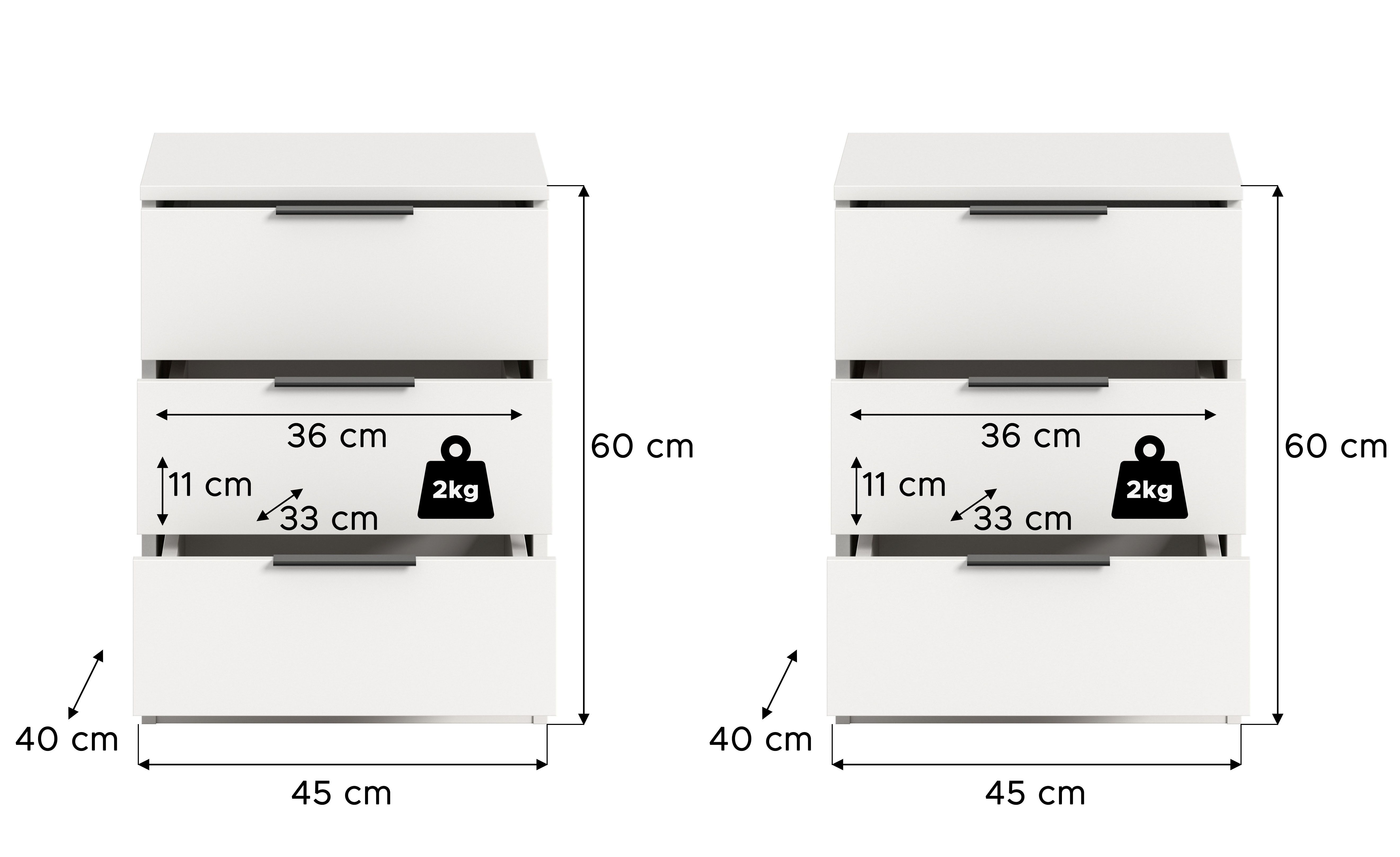 - 3 tiroirs coulissant intégralement pour chaque chevet