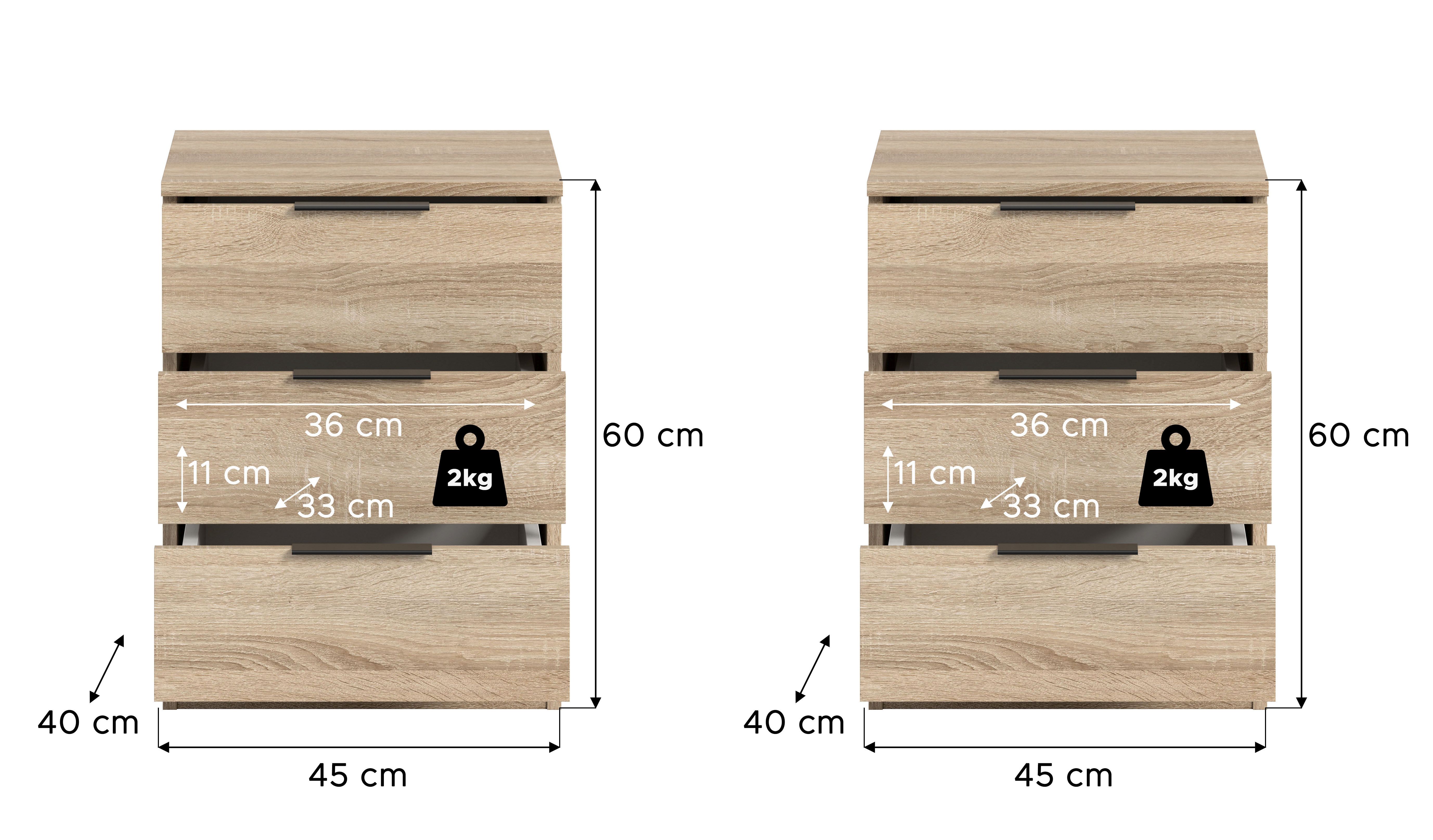 Ce lot de 2 chevets vous offre un espace de rangement pratique tout en créant une atmosphère harmonieuse dans votre chambre à coucher. Chaque chevet dispose de trois tiroirs spacieux à sortie totale : la solution idéale pour ranger vos objets préférés et y accéder facilement. Fabriqués à partir de matériaux de qualité, ces chevets se distinguent par leurs surfaces faciles d’entretien qui se nettoient aisément pour une chambre toujours propre et accueillante. Avec leurs dimensions compactes (45 x 60 x 40 cm), ils s’intègrent parfaitement de chaque côté du lit et peuvent être utilisés de manière polyvalente : pour poser vos livres, une lampe ou vos effets personnels.