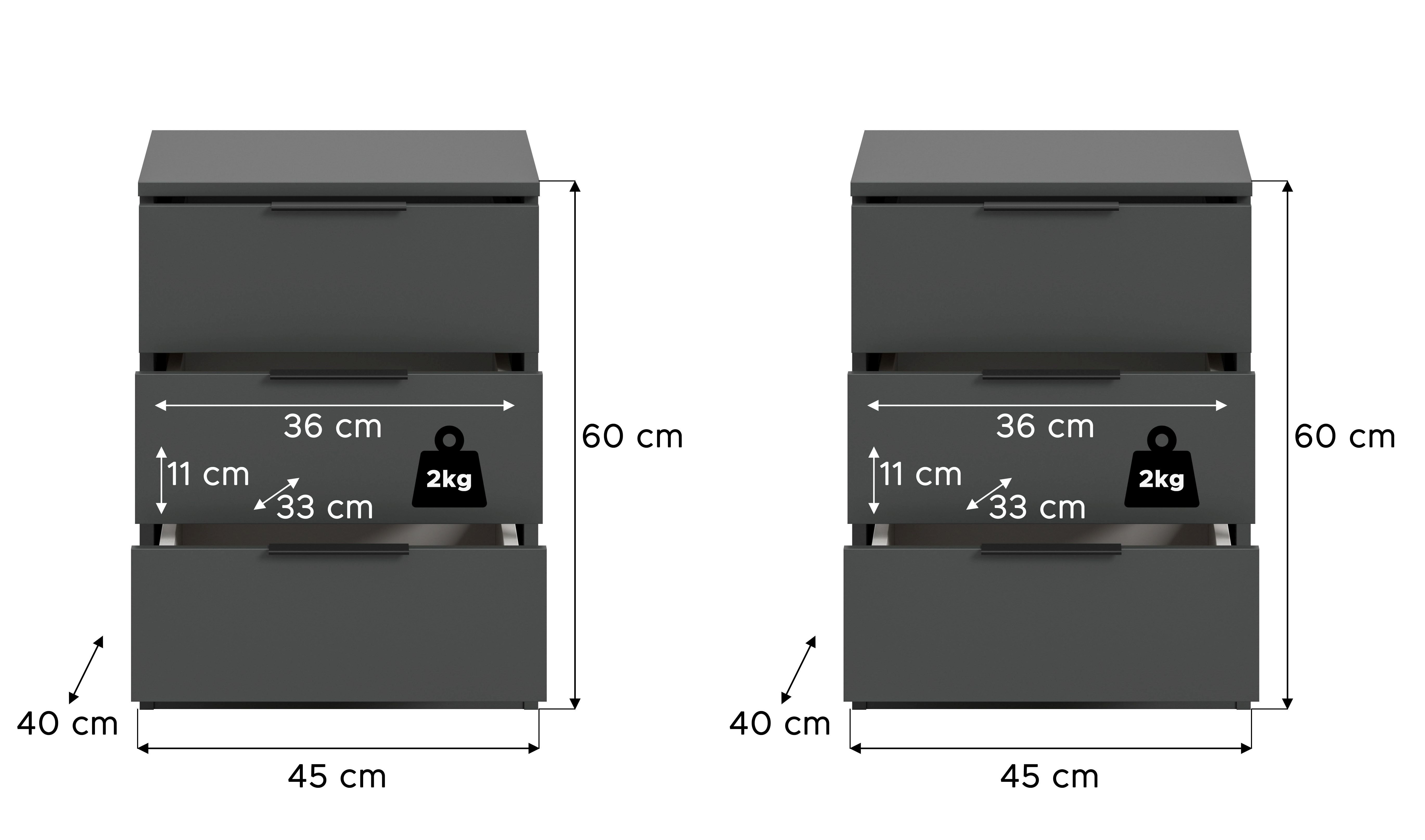 Ce lot de 2 chevets vous offre un espace de rangement pratique tout en créant une atmosphère harmonieuse dans votre chambre à coucher. Chaque chevet dispose de trois tiroirs spacieux à sortie totale : la solution idéale pour ranger vos objets préférés et y accéder facilement. Fabriqués à partir de matériaux de qualité, ces chevets se distinguent par leurs surfaces faciles d’entretien qui se nettoient aisément pour une chambre toujours propre et accueillante. Avec leurs dimensions compactes (45 x 60 x 40 cm), ils s’intègrent parfaitement de chaque côté du lit et peuvent être utilisés de manière polyvalente : pour poser vos livres, une lampe ou vos effets personnels.