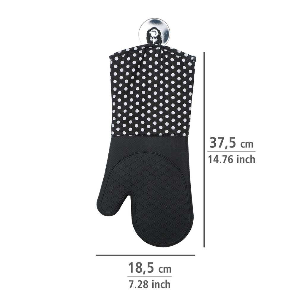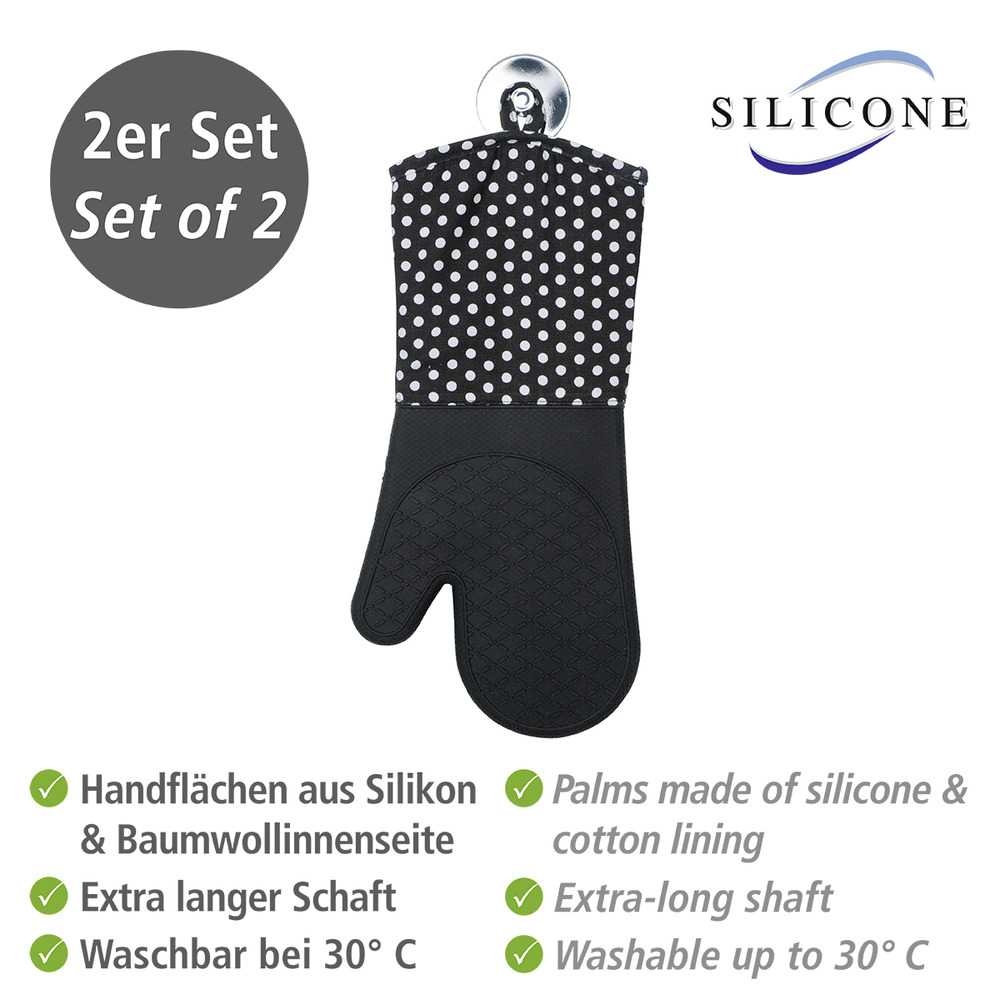 Le lot de 2 gants de cuisine pratiques ton noir à pois blancs offre une protection maximale contre les brûlures et garantit une manipulation sans danger des casseroles, poêles et plats chauds. La manche extra longue garantit une protection sûre contre la chaleur, même lors des grillades. Les paumes sont entièrement en silicone. L'intérieur en coton offre un grand confort. Ces gants pleins de peps sont un indispensable pour la saison des barbecues et sont même lavables à 30°.