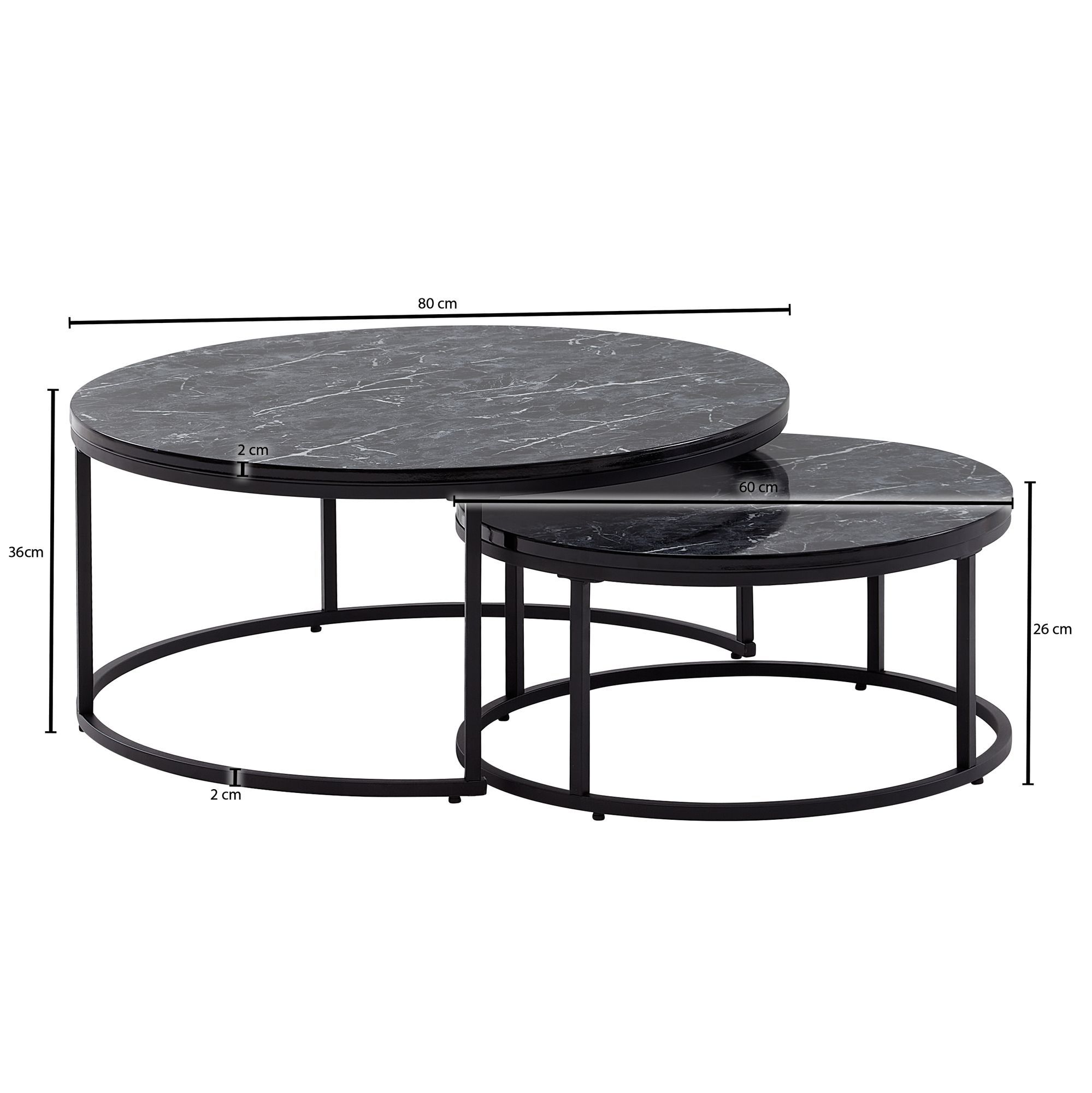 DIMENSIONS ✔ Grande table (LxPxH) : 80 x 80 x 36 cm // Petite table (LxHxP) : 60 x 60 x 26 cm // Épaisseur plateau : 2 cm // Vous trouverez d'autres dimensions sur l'image correspondante