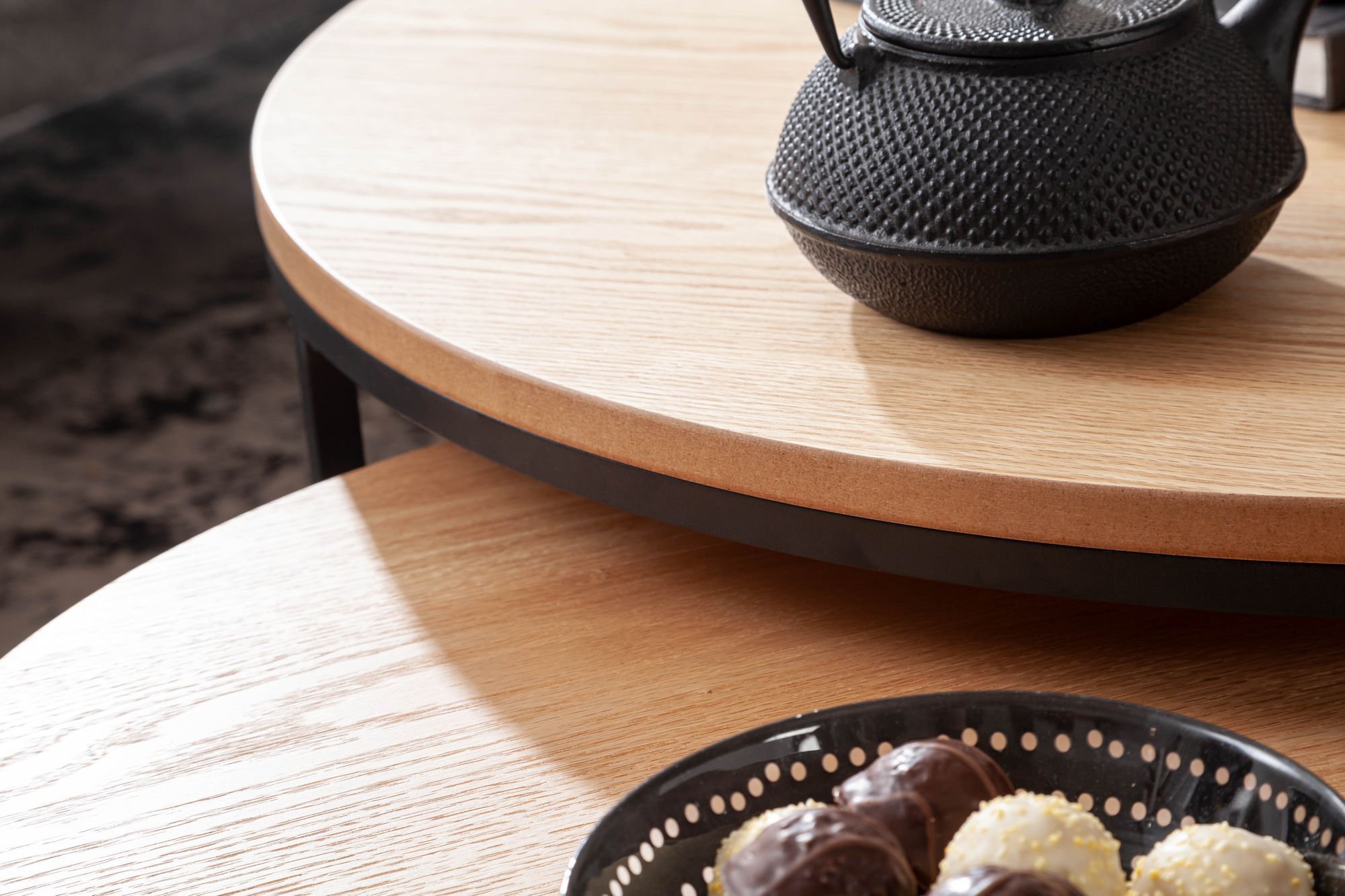 COMPOSITION ✔ Plateaux : MDF avec placage en chêne véritable // Piètements : acier finition époxy