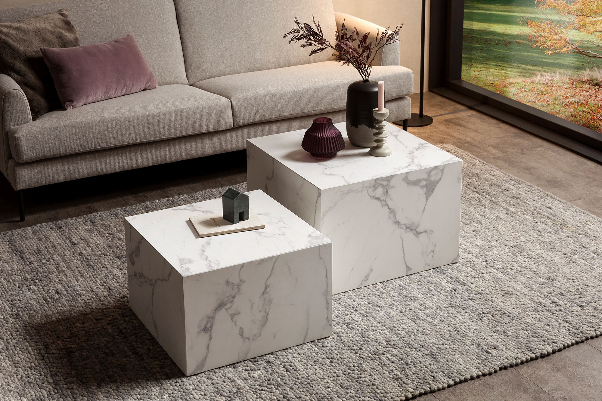 Ces tables basses chics en deux tailles confèreront instantanément un aspect élégant à votre salon. La forme simple en cube avec une grande surface de rangement met particulièrement en valeur le superbe aspect marbré. La faible hauteur donnera un côté lounge à votre intérieur.