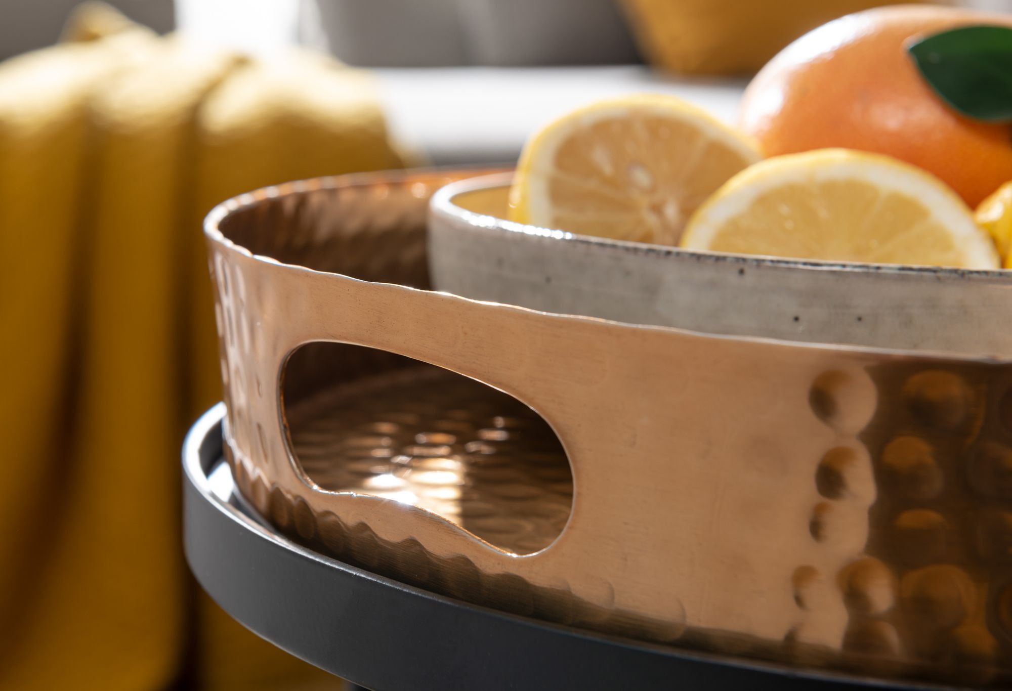 TABLES D'APPOINT PRATIQUES ✔ Cet ensemble marque des points grâce à la surface martelée, mais aussi à son côté pratique ! Préparez les snacks, sauces et boissons dans la cuisine et apportez-les dans le salon à l'aide des deux plateaux. La soirée cinéma idéale peut commencer !