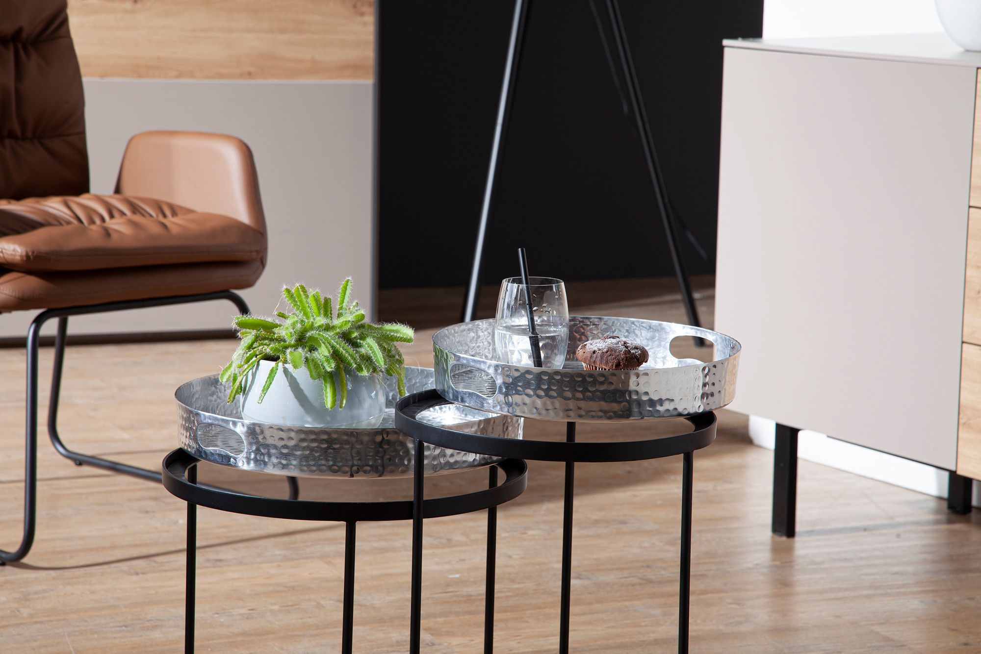 TABLES D'APPOINT PRATIQUES ✔ Cet ensemble marque des points grâce à la surface martelée, mais aussi à son côté pratique ! Préparez les snacks, sauces et boissons dans la cuisine et apportez-les dans le salon à l'aide des deux plateaux. La soirée cinéma idéale peut commencer !