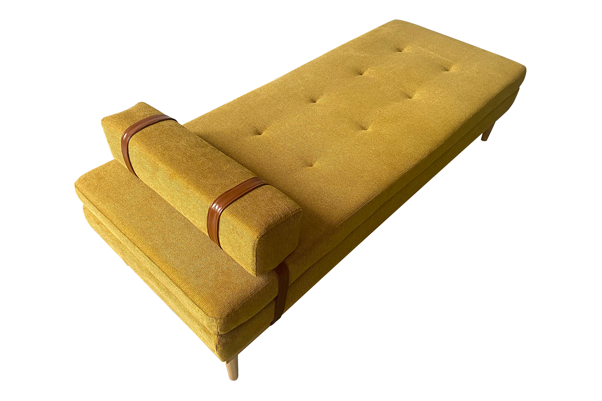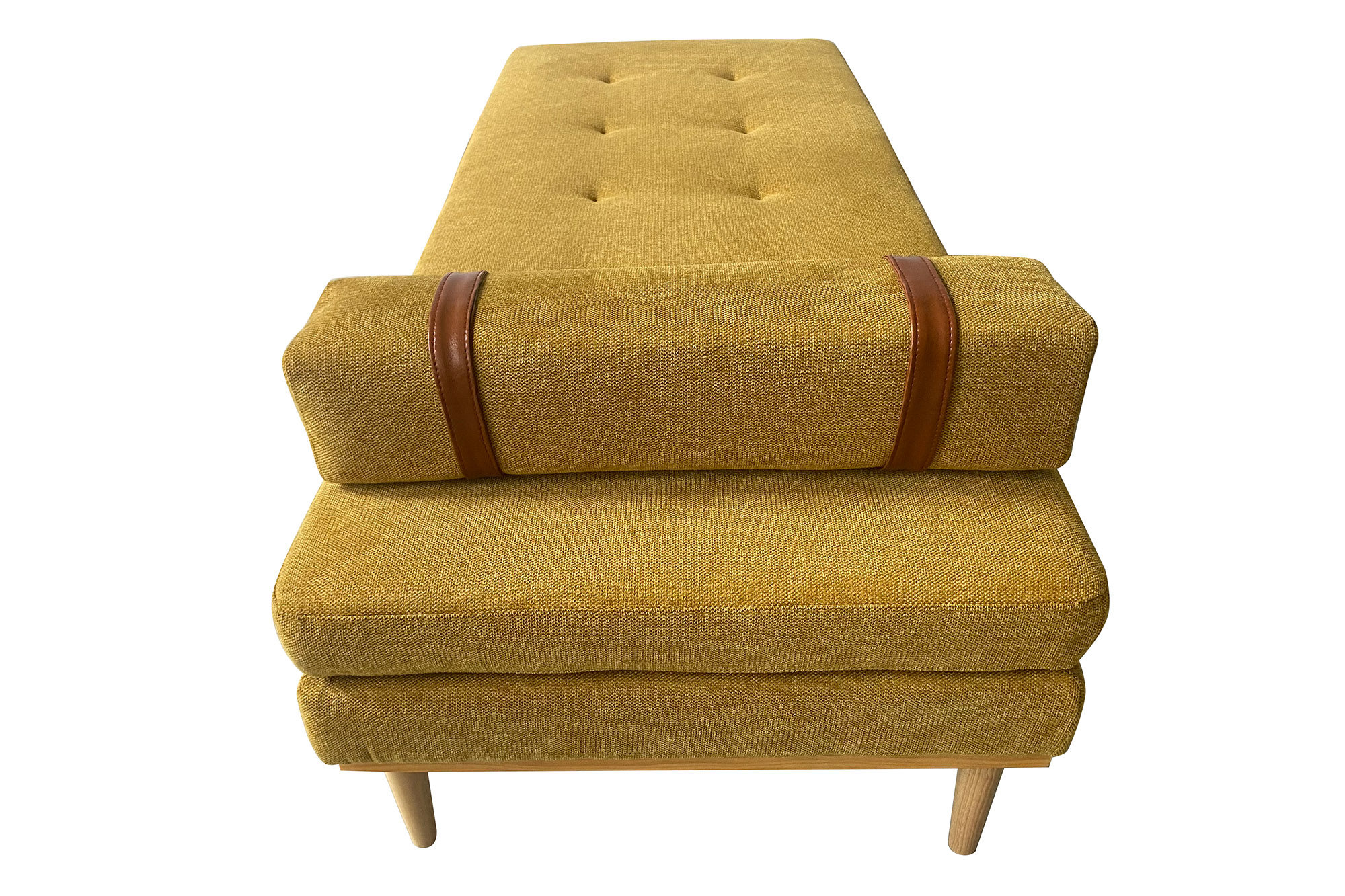 Ce lit de jour est habillé d’un élégant tissu chiné ton jaune. Le cadre et les pieds sont en bois naturel avec une finition laquée aspect clair ; ceci garantit une bonne stabilité et offre un superbe contraste avec le revêtement en tissu. Grâce au rembourrage de la méridienne, vous bénéficiez d'un confort de couchage haut de gamme. L’appuie-tête/cale-nuque est particulièrement remarquable. Vous serez ainsi dans une position confortable pour dormir ou vous reposer. Ce petit bijou en matière de design deviendra rapidement un élément phare de votre intérieur ainsi que votre nouvel espace de bien-être pour profiter de vos heures de détente.