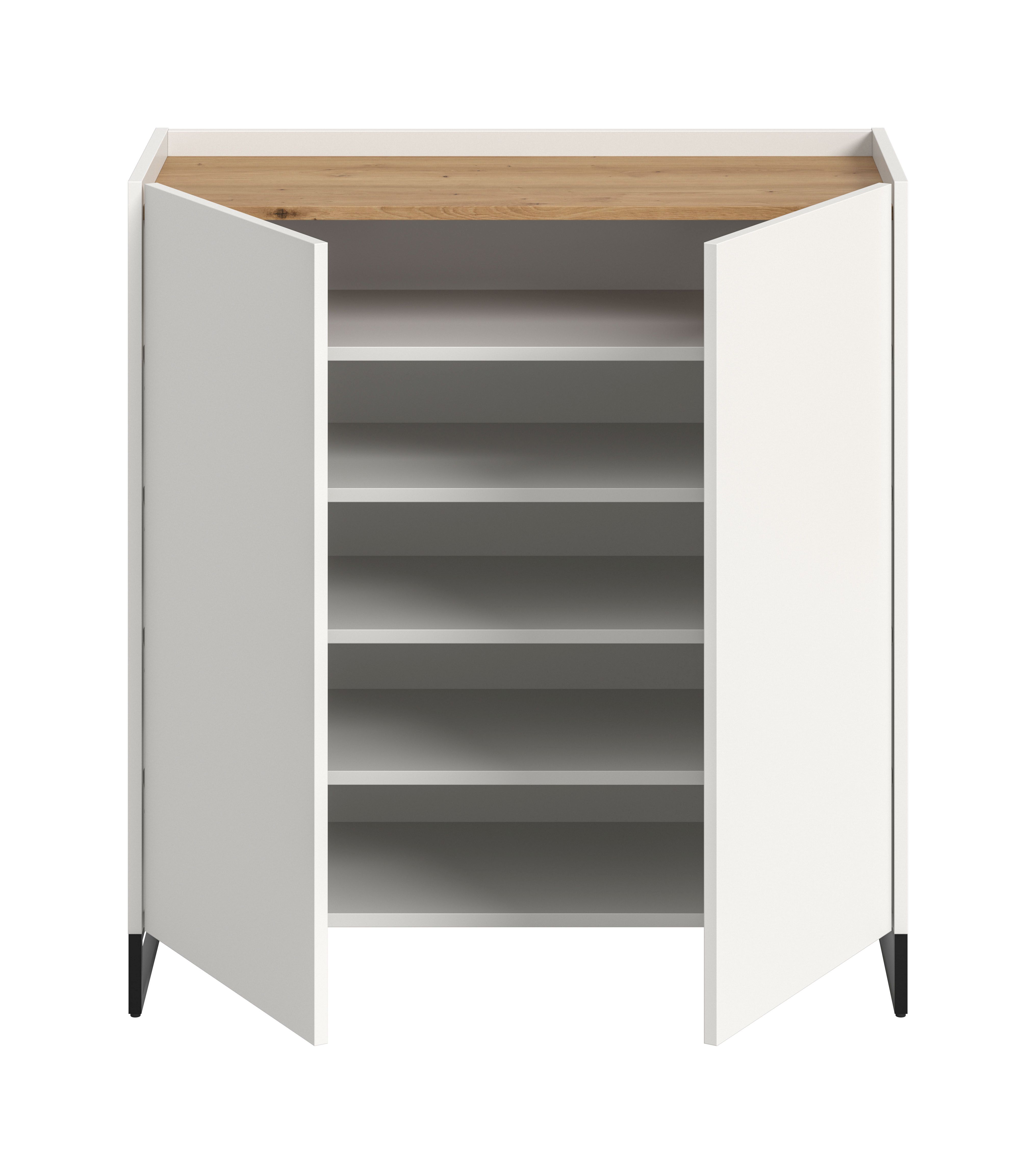 Ce meuble à chaussures (LxHxP) 90 x 97 x 38 cm en décor blanc et chêne Artisan offre de la place pour environ 18 paires de chaussures grâce à ses 2 portes, 4 tablettes réglables en hauteur et 5 compartiments fermés. Fabriqué en bois composite certifié FSC®, il contribue à la protection des forêts et s’inscrit dans une démarche de durabilité. Sa surface facile d’entretien et son montage rapide en font un meuble particulièrement pratique au quotidien. Associez-le à d’autres éléments de la même série pour créer une entrée harmonieuse et bien organisée. La solution idéale pour faire régner ordre et style dans votre couloir.