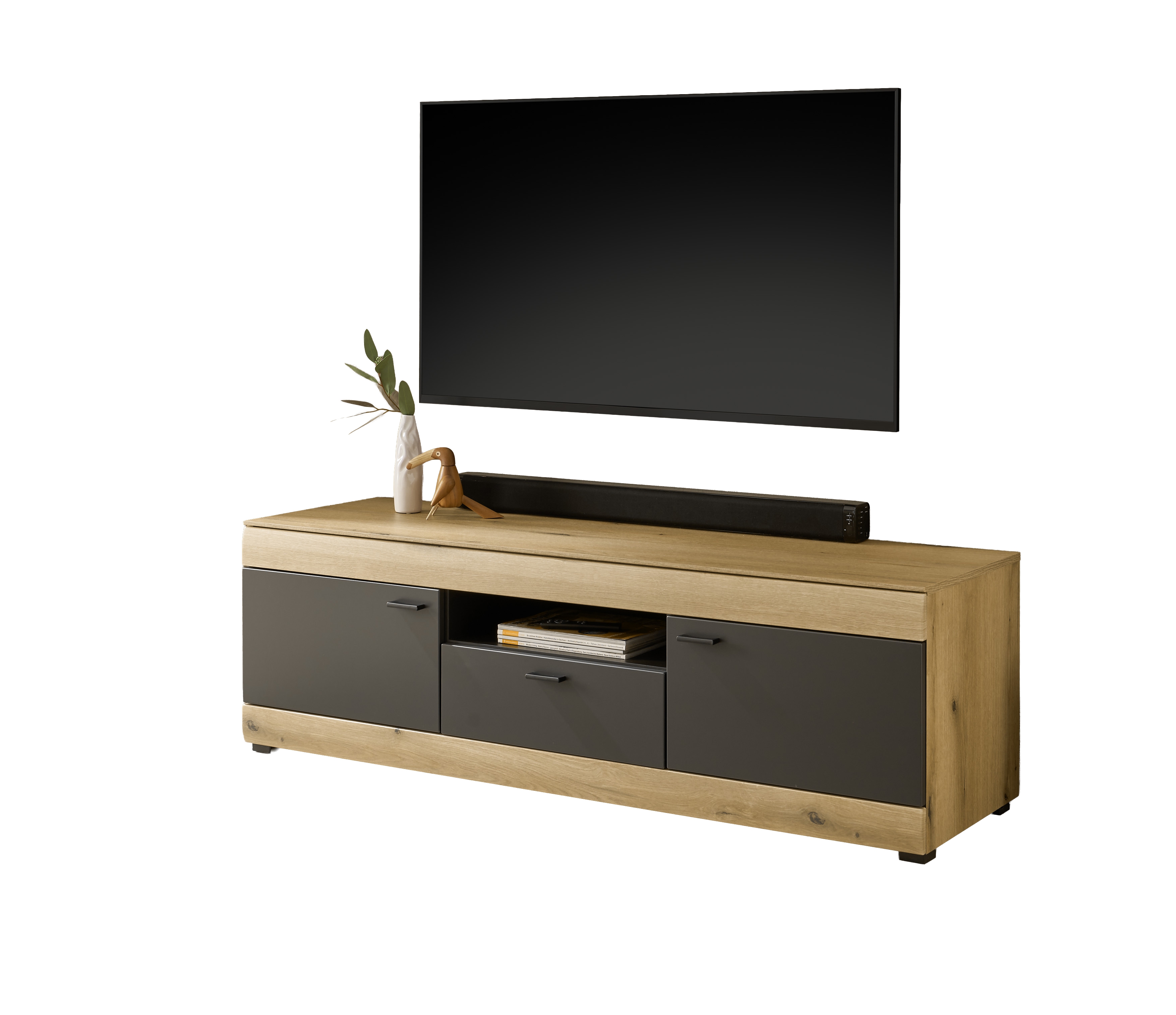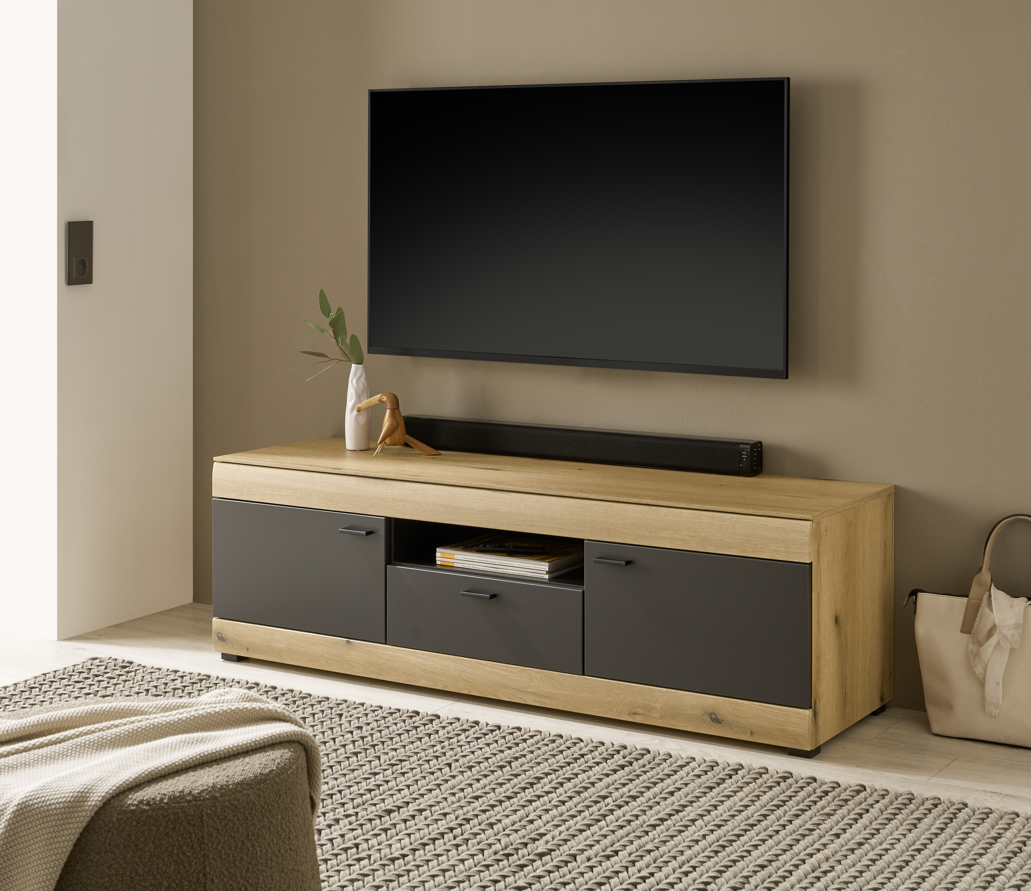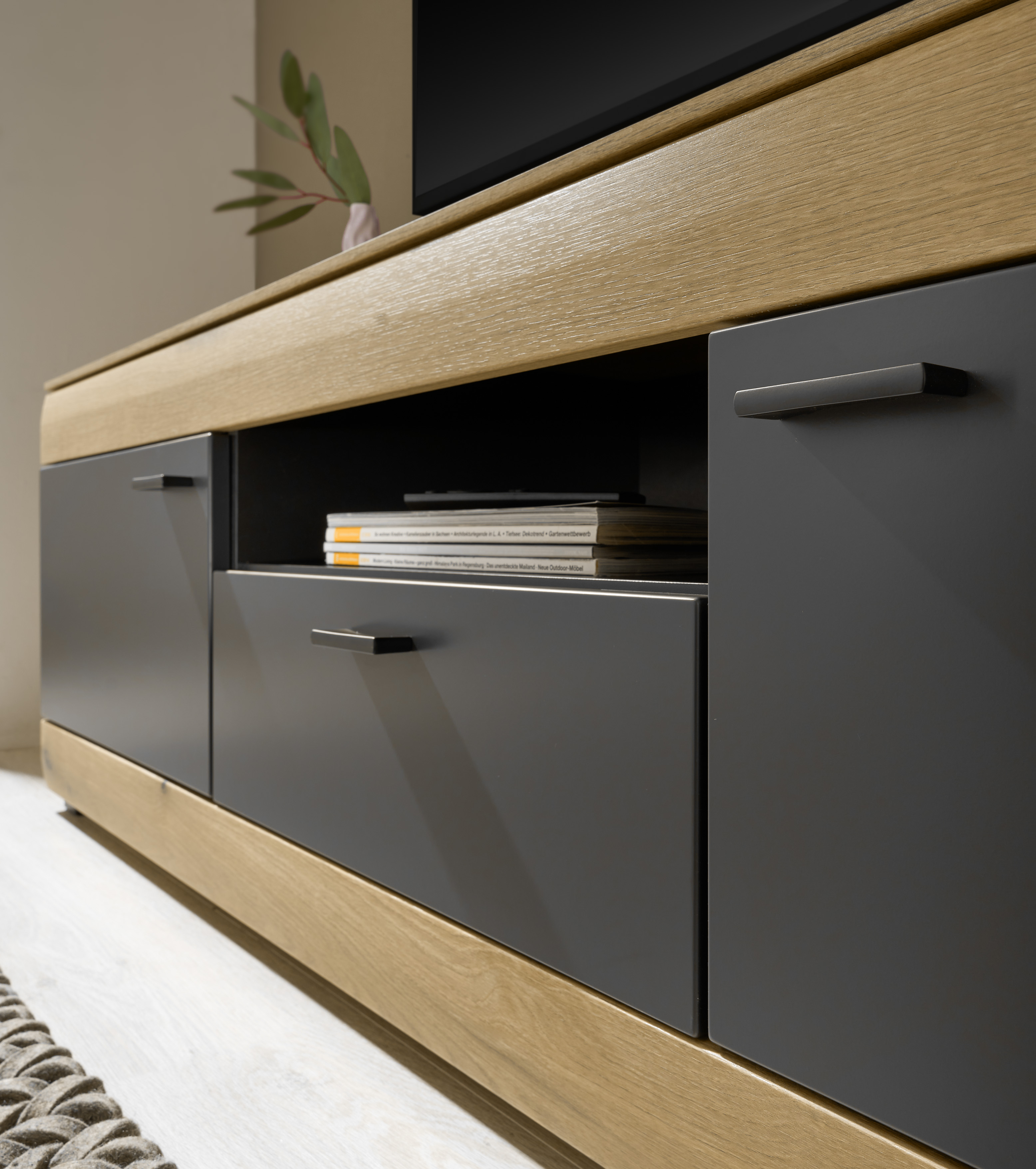 Le programme de mobilier allie design moderne, fabrication de haute qualite et fonctionnalite polyvalente. Les facades en MDF Evoke Chene thermoforme creent une apparence naturelle et chaleureuse, sintegrant harmonieusement dans differents concepts damenagement. Le corps et les appliques en imitations bois Evoke Chene, associes a des details gris graphite mats, apportent des accents elegants, tandis que les poignees metalliques noires completent le design. Le meuble offre un rangement bien pense et des possibilites dutilisation flexibles pour le salon, la salle a manger ou le couloir. Lassociation de materiaux durables et dun style intemporel fait de chaque piece un veritable point fort dans la piece.