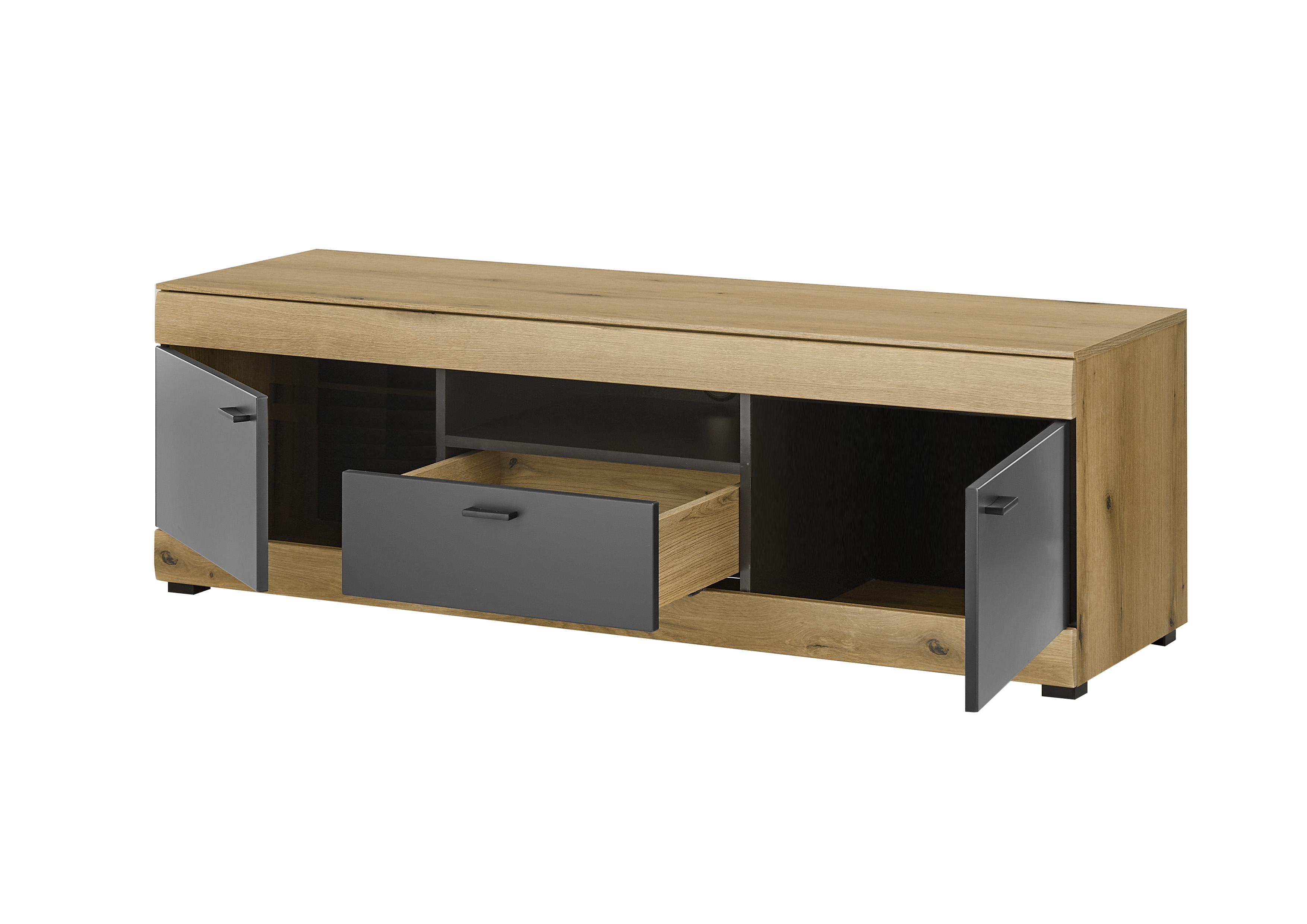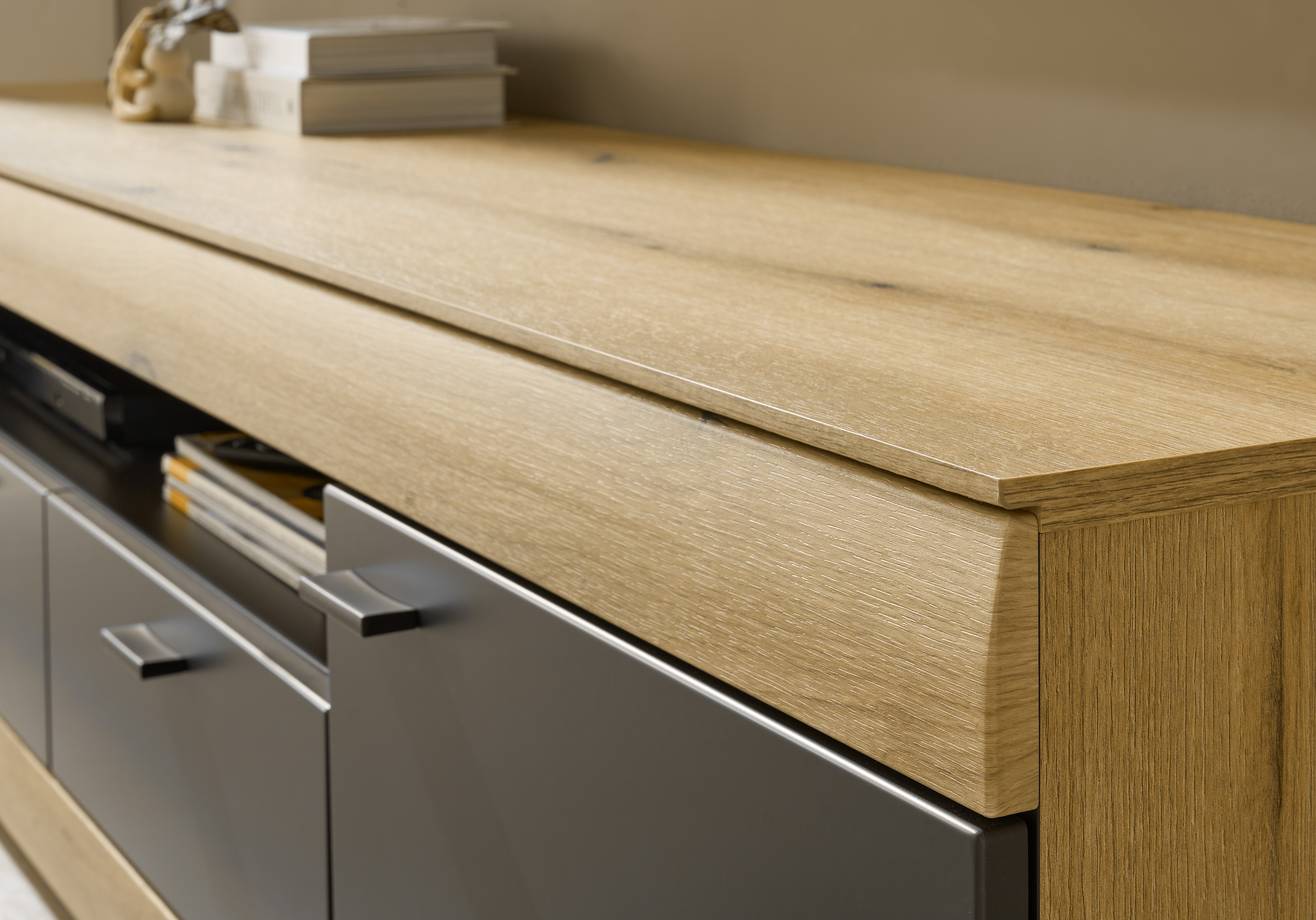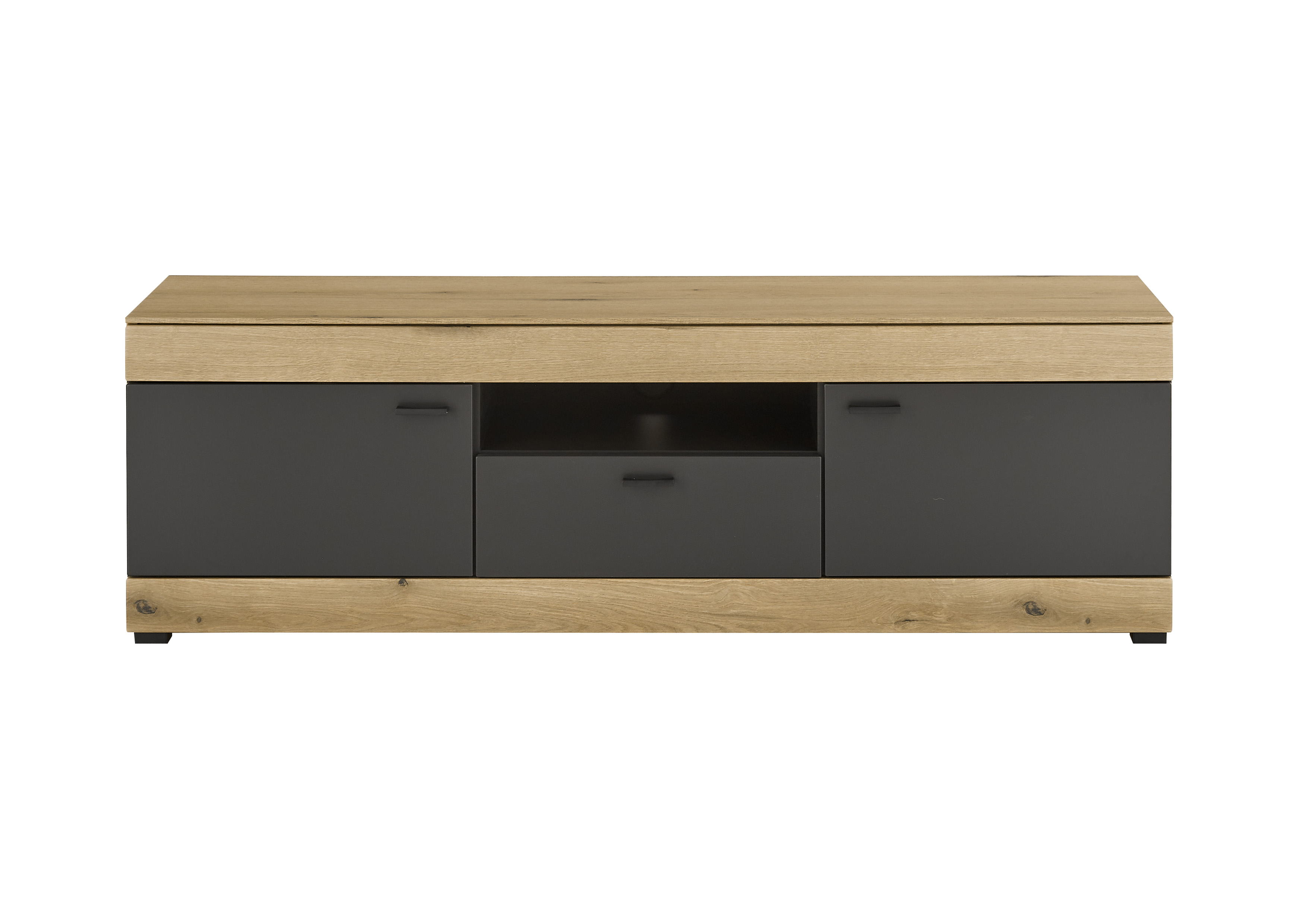 Le programme de mobilier allie design moderne, fabrication de haute qualite et fonctionnalite polyvalente. Les facades en MDF Evoke Chene thermoforme creent une apparence naturelle et chaleureuse, sintegrant harmonieusement dans differents concepts damenagement. Le corps et les appliques en imitations bois Evoke Chene, associes a des details gris graphite mats, apportent des accents elegants, tandis que les poignees metalliques noires completent le design. Le meuble offre un rangement bien pense et des possibilites dutilisation flexibles pour le salon, la salle a manger ou le couloir. Lassociation de materiaux durables et dun style intemporel fait de chaque piece un veritable point fort dans la piece.