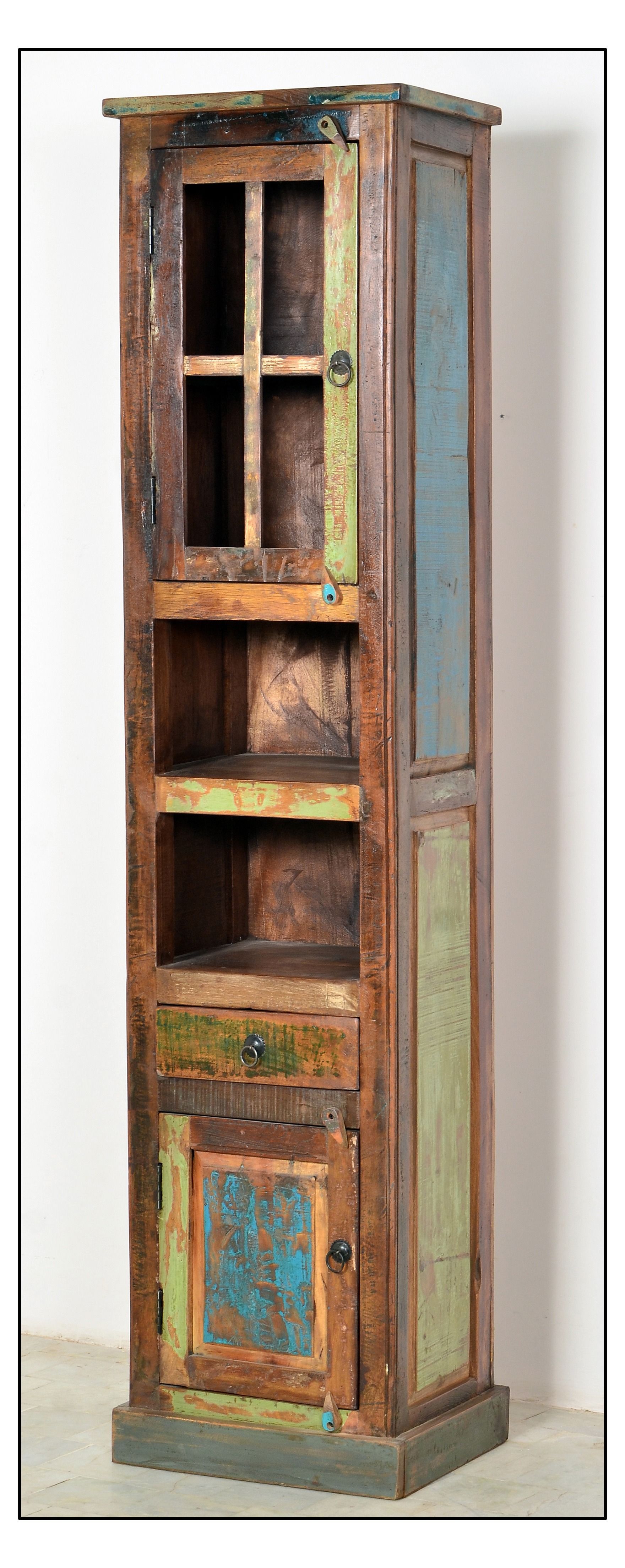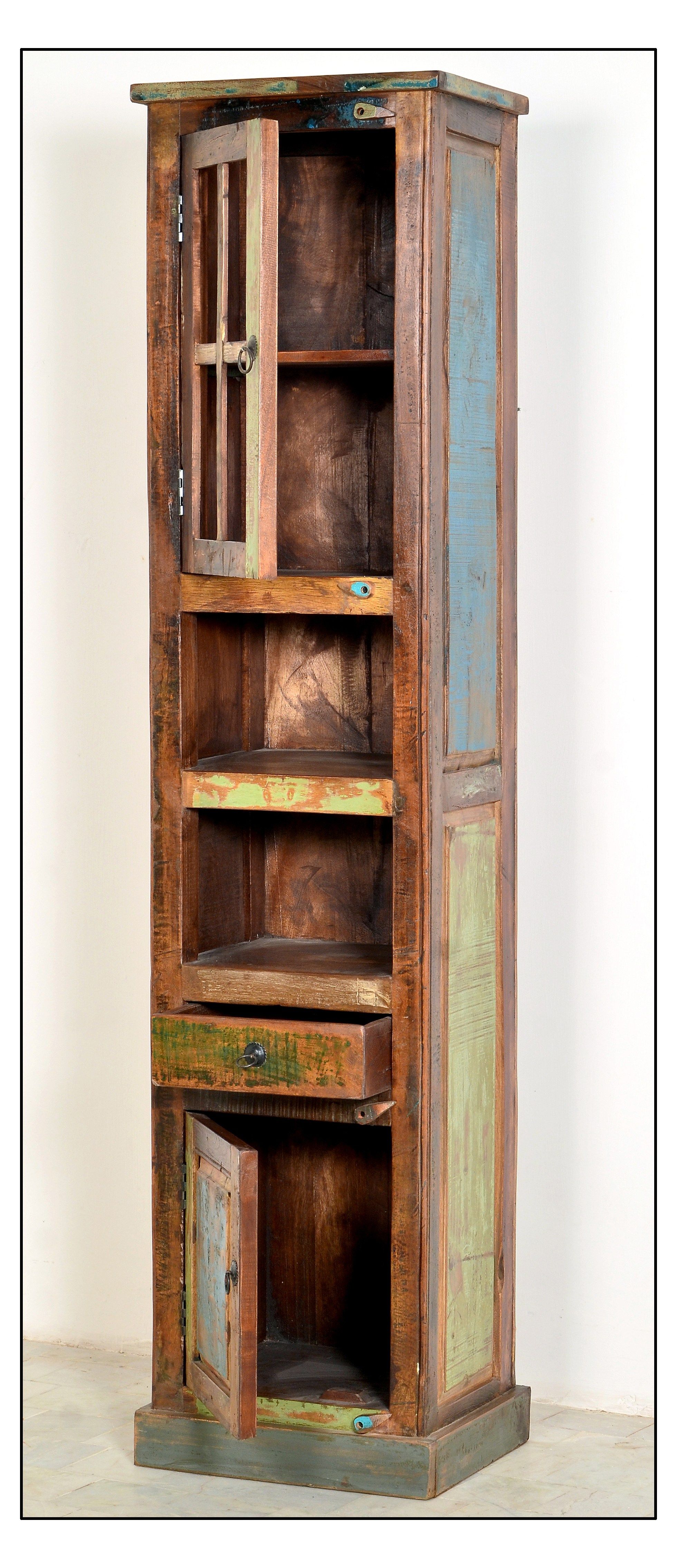 Vieux bois véritable massif (Inde), laqué ton multicolore / verre
