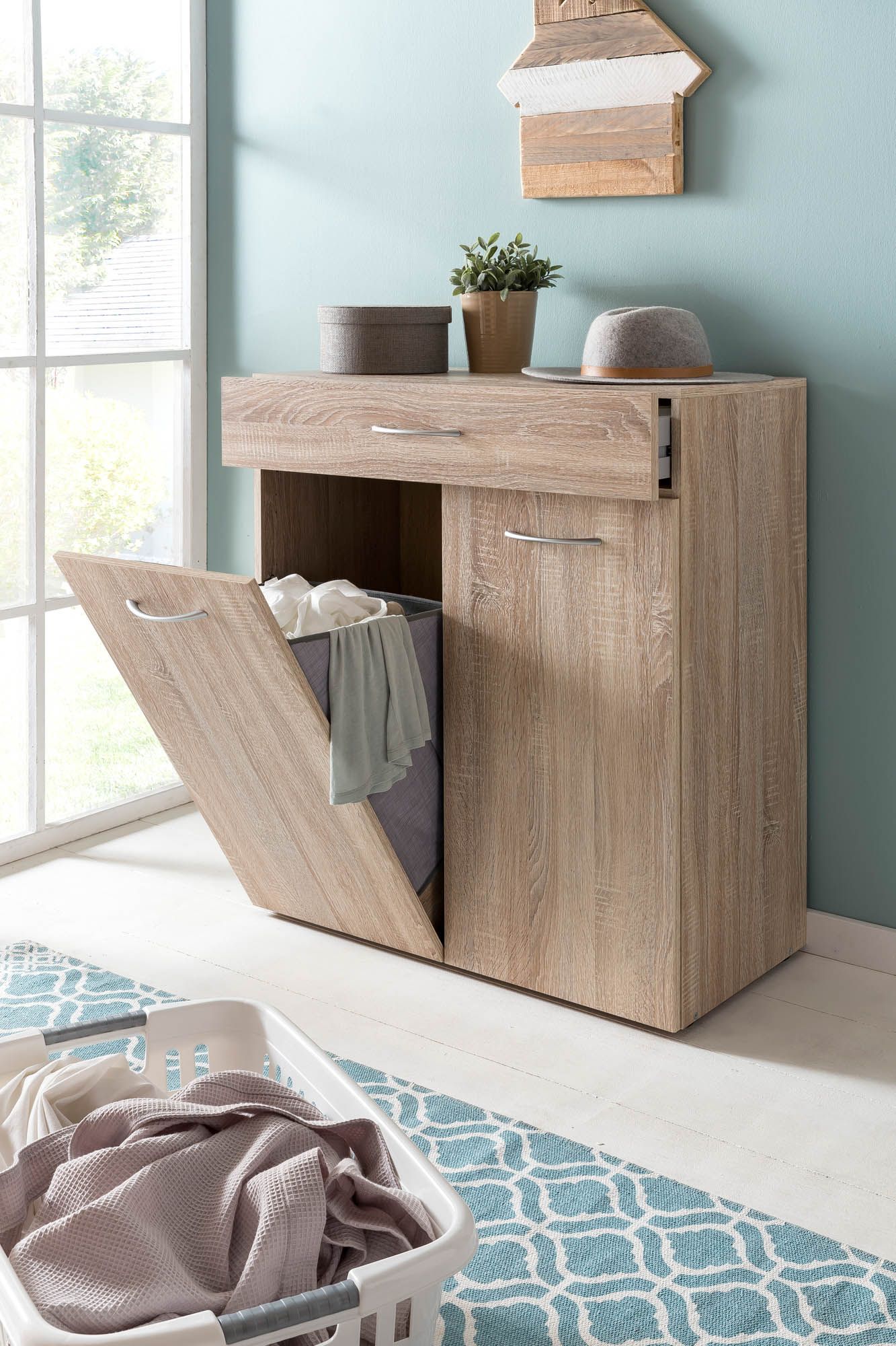 2 portes abattants avec, derrière elles, 2 paniers à linge amovibles