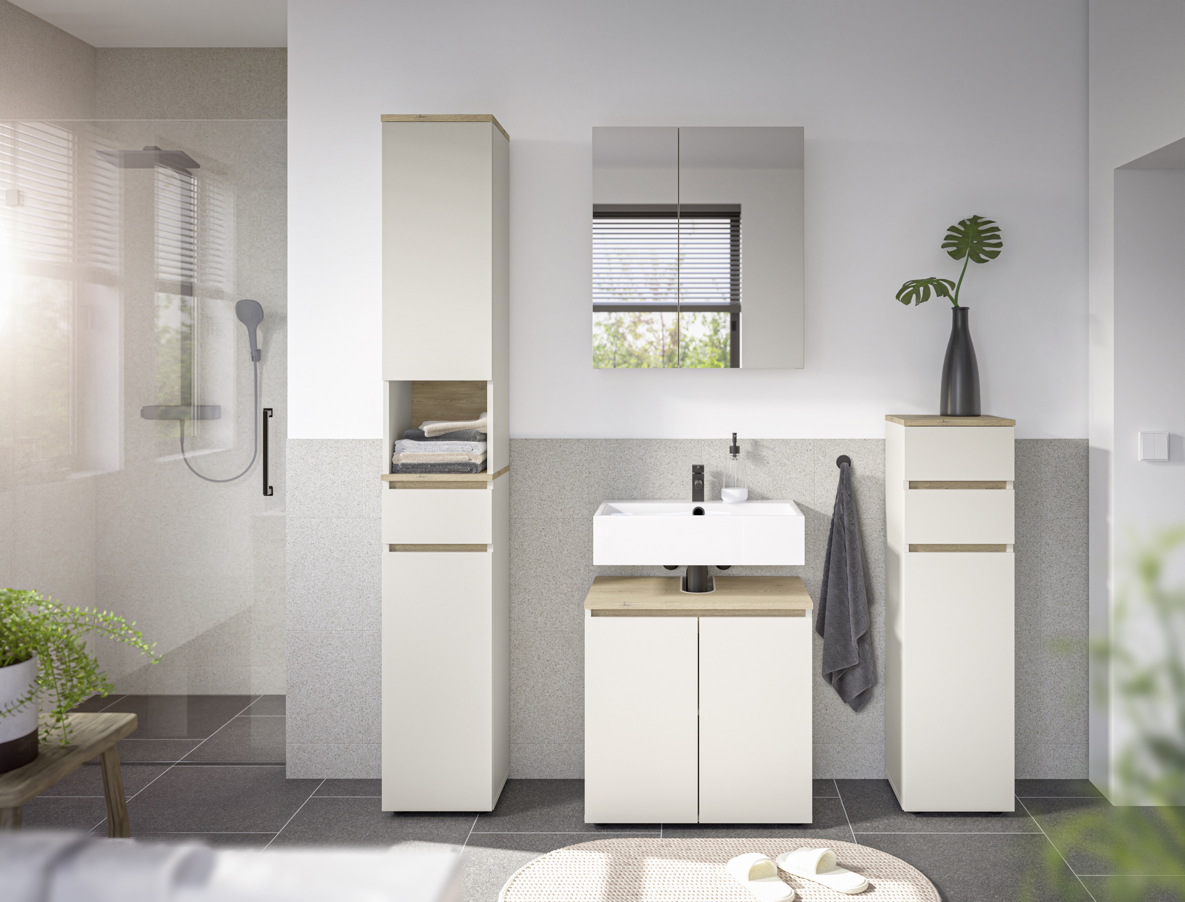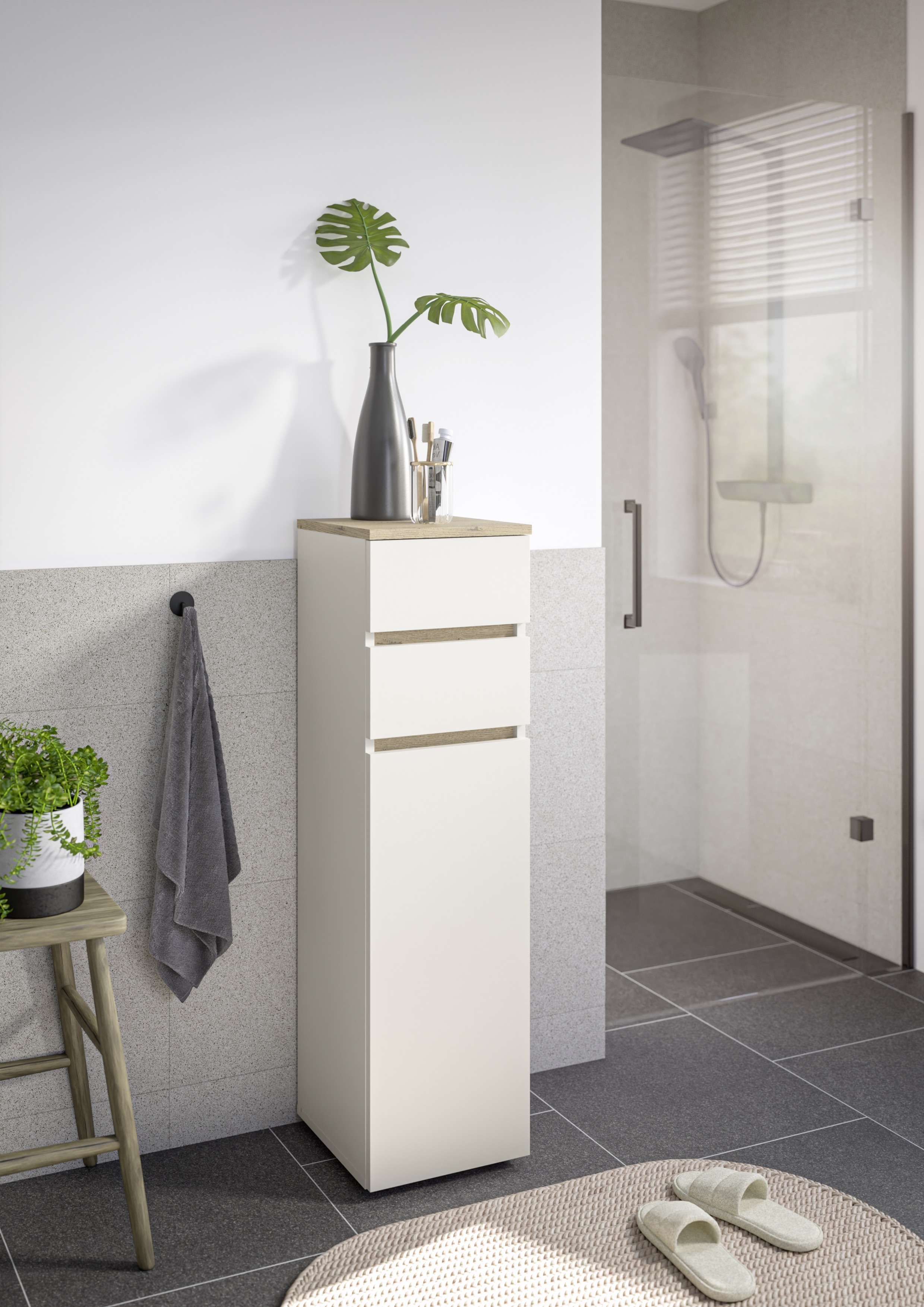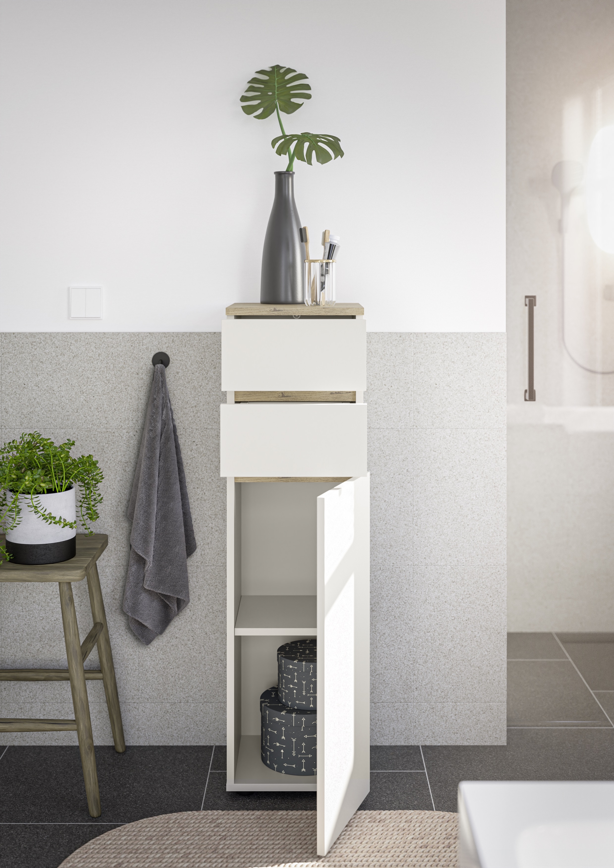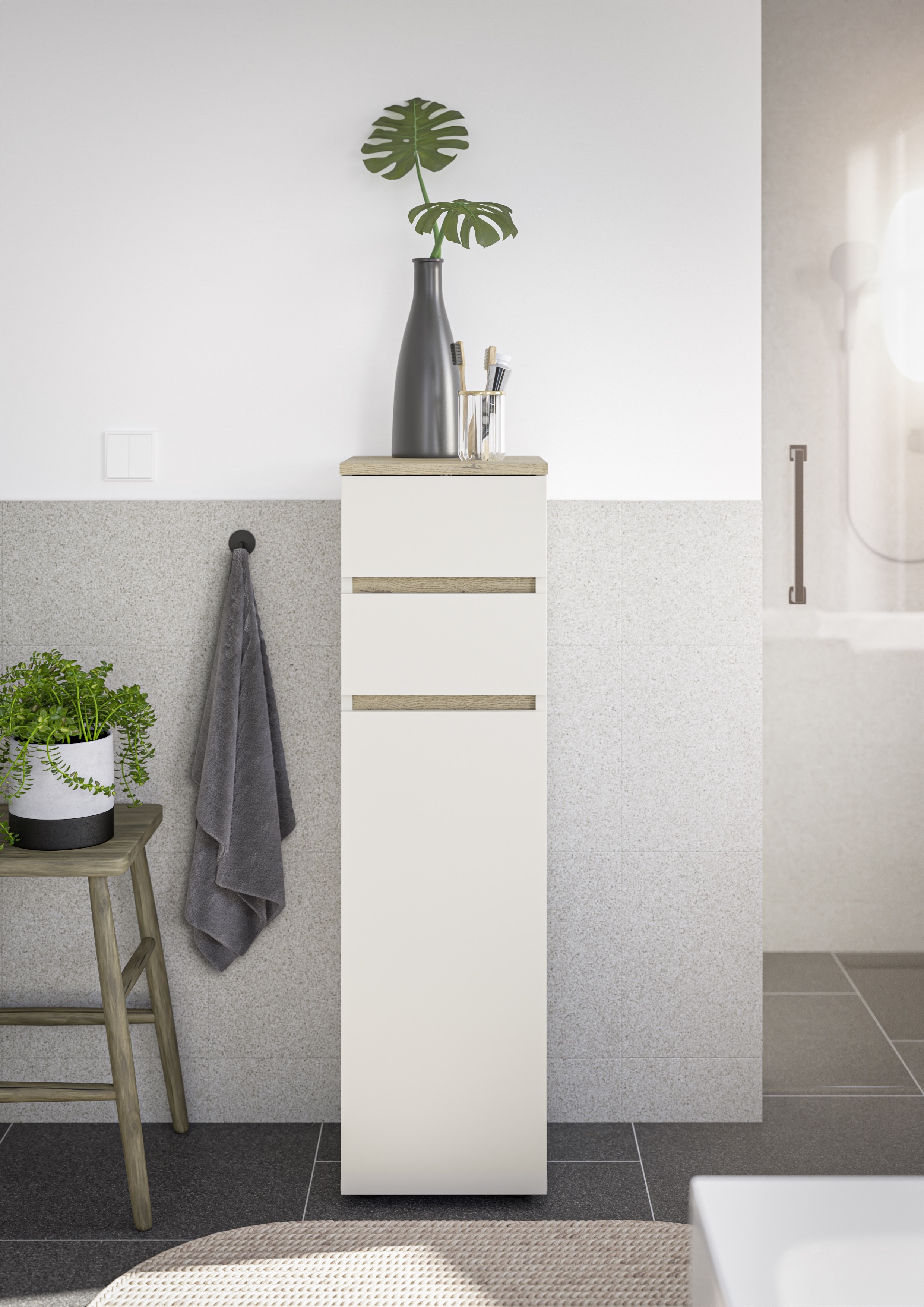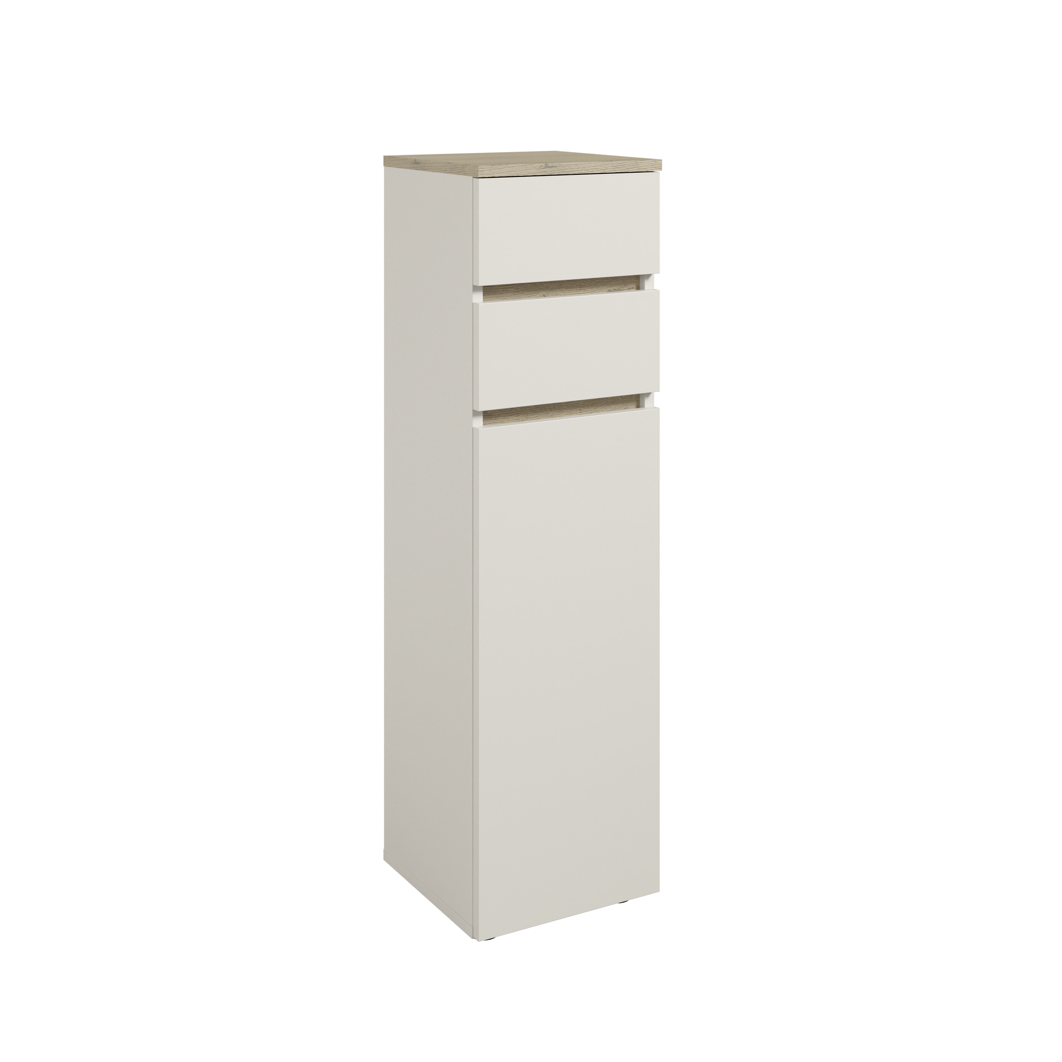 Cette commode de salle de bain séduit par son agencement pratique et sa surface facile d'entretien. Le corps et la façade sont déclinés dans un coloris cachemire discret et sont rehaussés par des contrastes en imitation bois de chêne Cremona. Derrière la porte avec étagère, vous pouvez ranger facilement vos serviettes ou vos produits d'entretien, tandis que deux tiroirs à roulettes faciles à ouvrir offrent de la place pour les petits articles de salle de bain. La surface est recouverte de mélamine et donc particulièrement résistante à l'humidité. Des patins en plastique noir assurent une bonne stabilité. Idéal pour tous ceux qui recherchent une solution de rangement compacte et économique pour la salle de bains.
