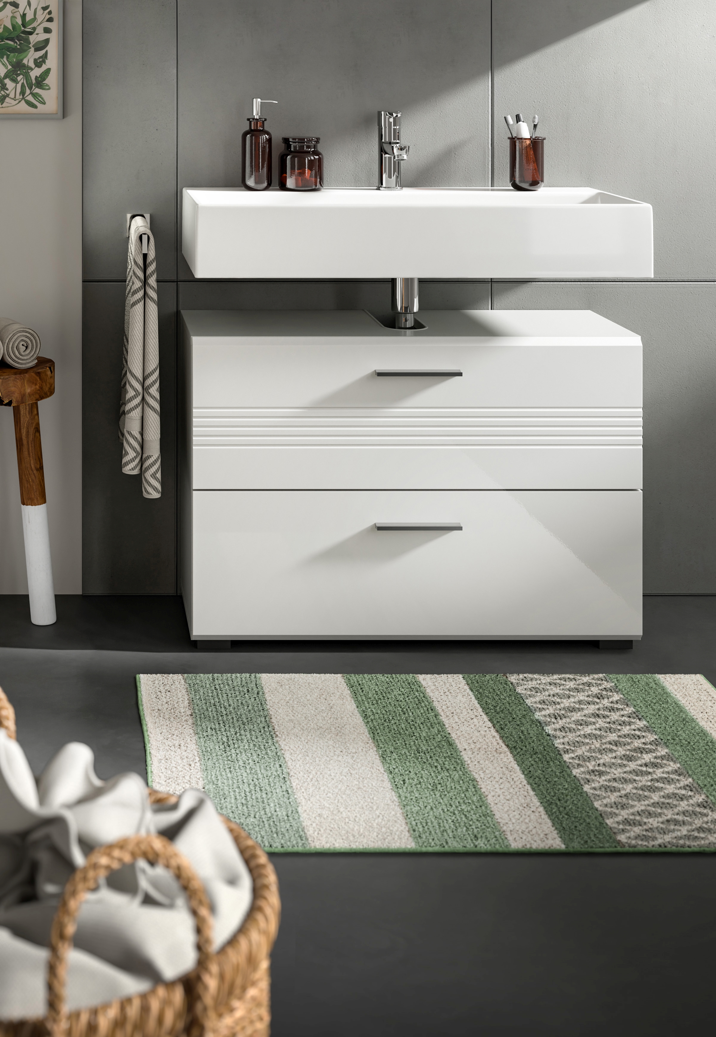 - Fonctionnalité : le large meuble sous vasque offre un espace de rangement spacieux pour les accessoires de bain et les produits d’entretien ; grâce à sa forme ample et à sa taille compacte, il s’intègre parfaitement sous le lavabo et permet d’utiliser l’espace disponible de façon optimale.