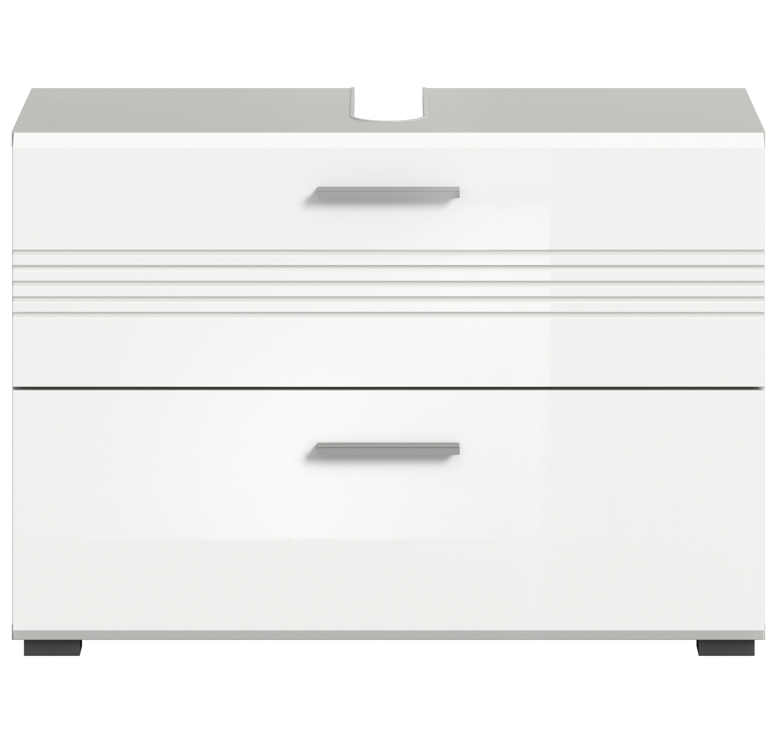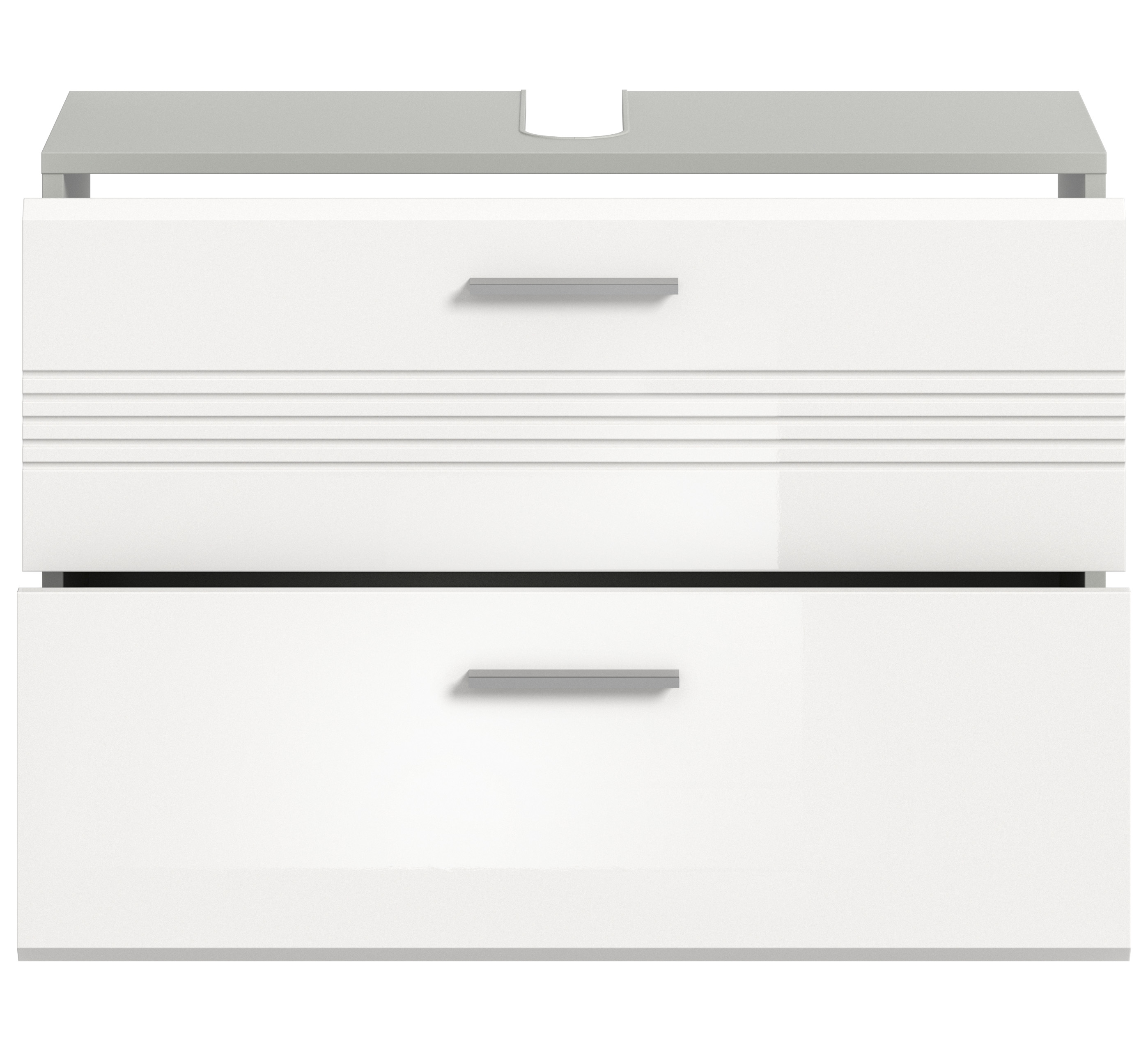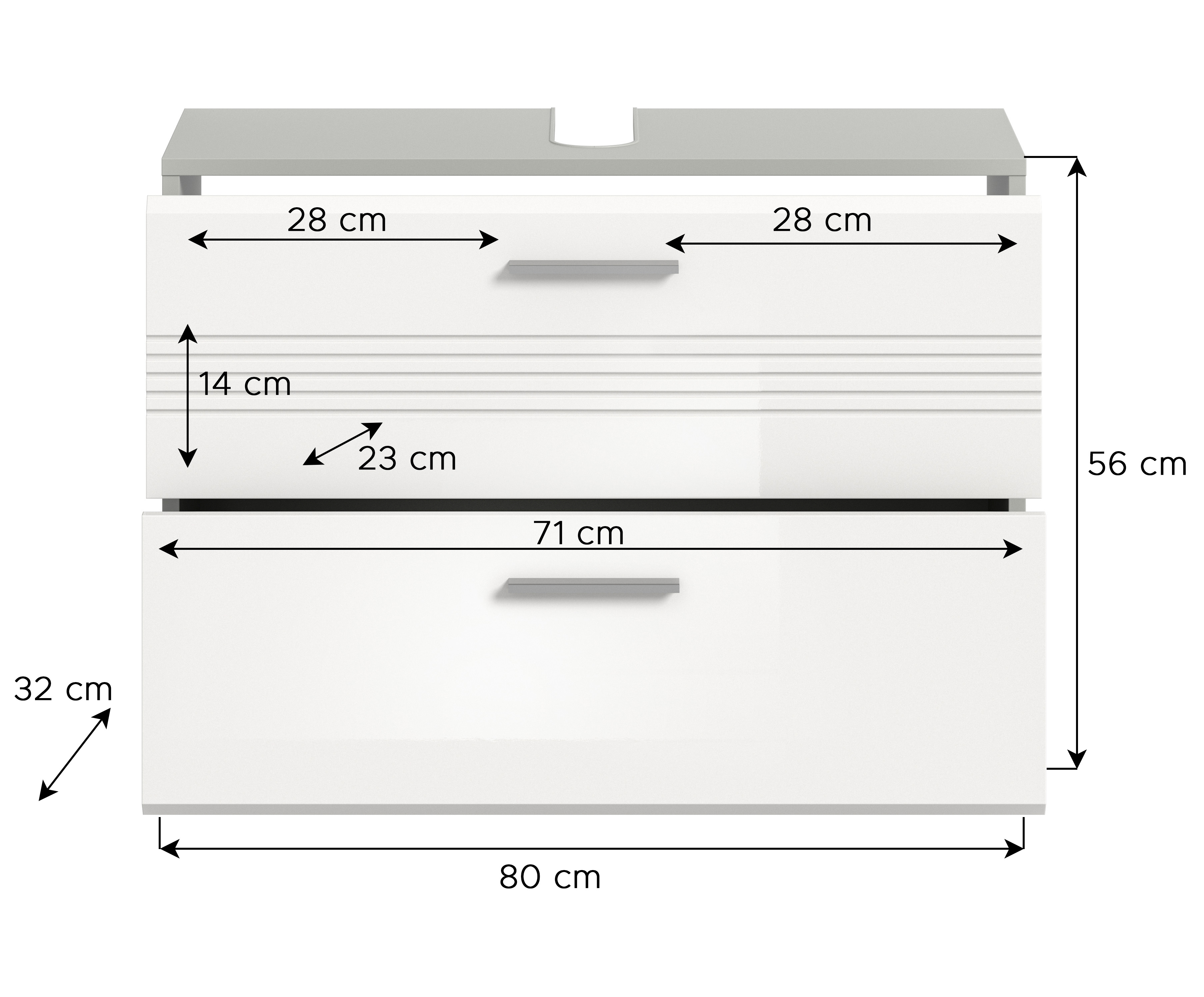 Découvrez notre meuble de salle de bains de qualité dans un élégant décor ton gris clair et ton blanc ultra brillant thermoformé à la finition étincelante. Grâce à ses dimensions (L/H/P: 80x56x32 cm), ce meuble n’offre pas seulement un bel espace de rangement : il conférera également à votre salle de bains une touche tendance. Ce meuble est la solution idéale pour associer style et fonctionnalité dans votre salle de bains.