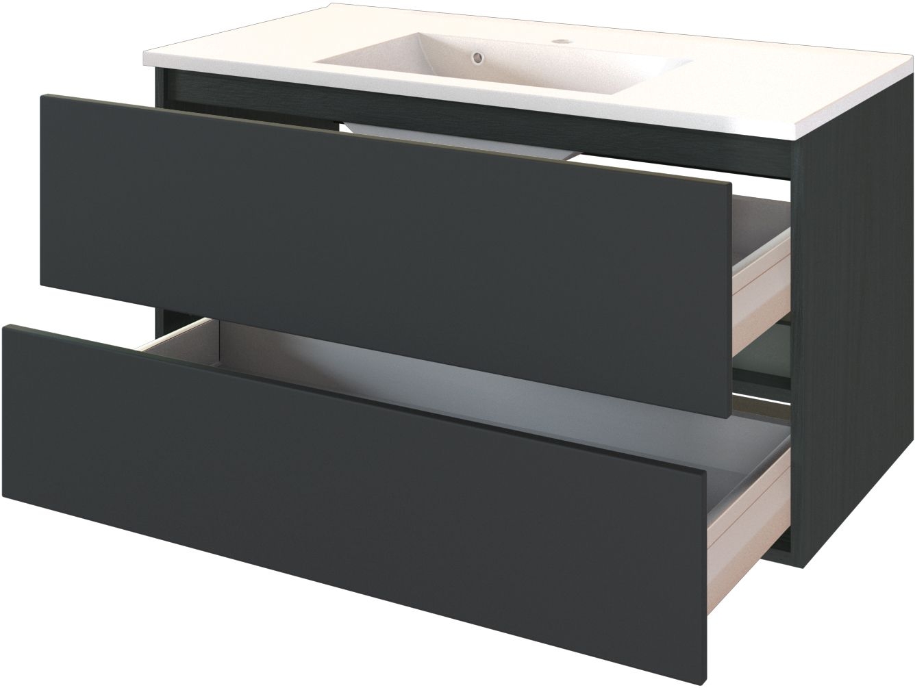 1 meuble sous vasque avec 2 tiroirs hauts sur rails métalliques, fermeture amortie et barre