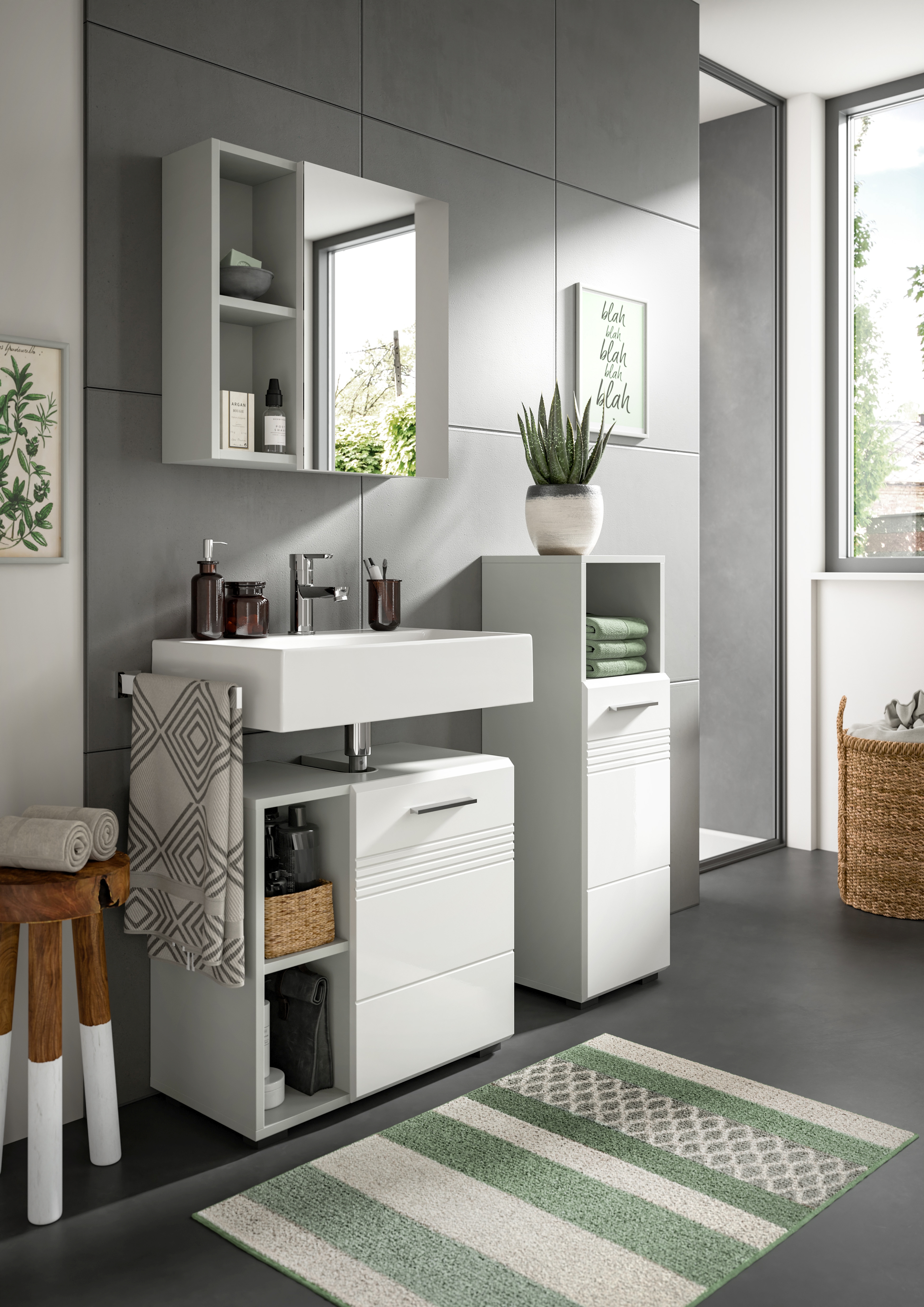 Découvrez notre meuble de salle de bains de qualité dans un élégant décor ton gris clair et ton blanc ultra brillant thermoformé à la finition étincelante. Grâce à ses dimensions (L/H/P: 60x56x32 cm), ce meuble n’offre pas seulement un bel espace de rangement : il conférera également à votre salle de bains une touche tendance. Ce meuble est la solution idéale pour associer style et fonctionnalité dans votre salle de bains.
