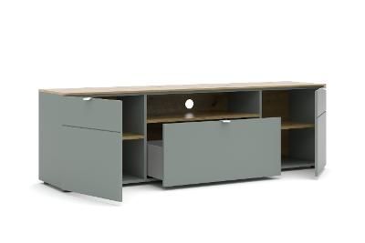 Le compartiment ouvert est parfait pour les recepteurs ou les consoles de jeux et permet un acheminement optimal des cables. Derriere les portes, les objets peuvent etre ranges de maniere ordonnee et a l'abri des regards, tandis que le tiroir offre un acces rapide aux ustensiles frequemment utilises.