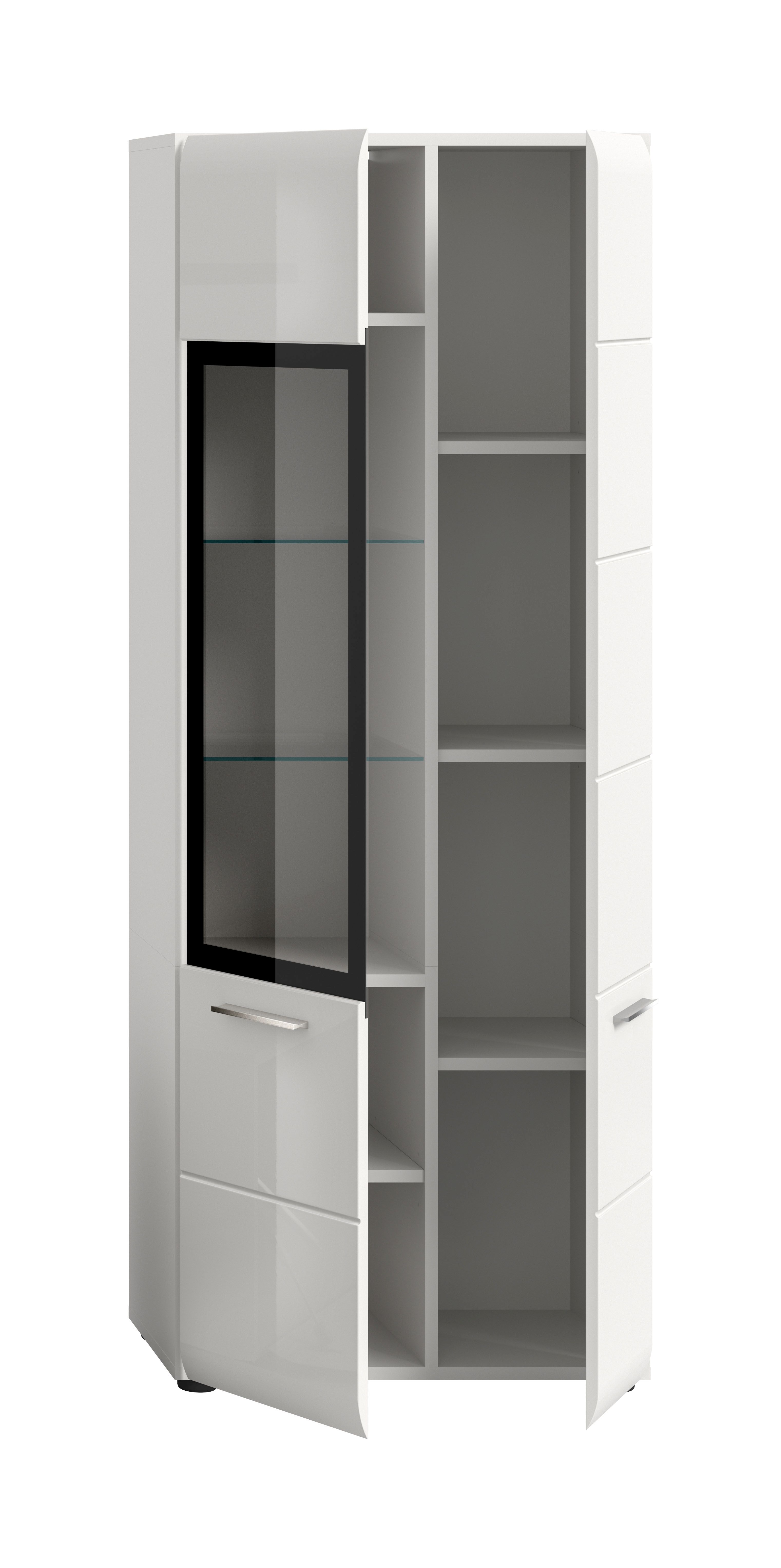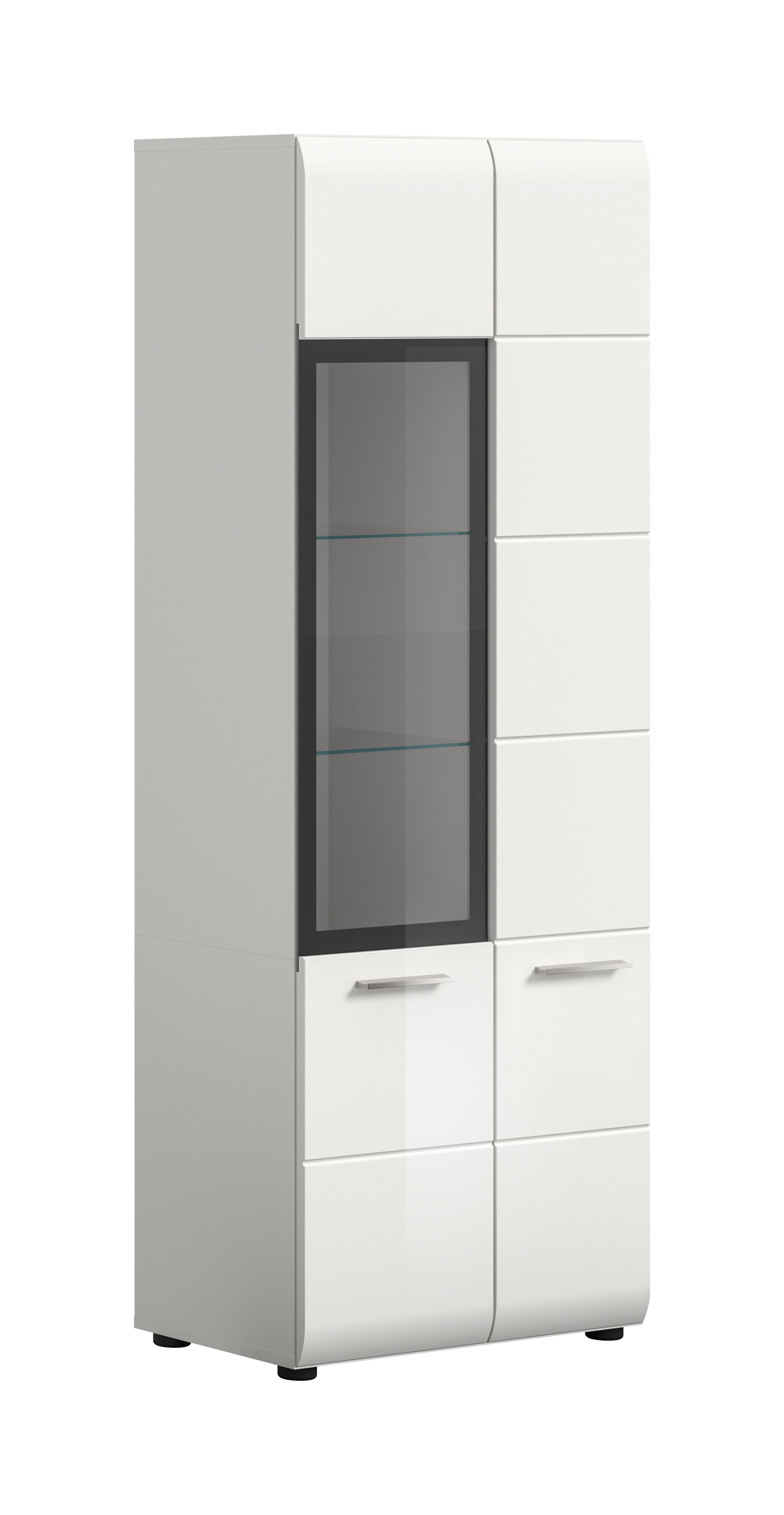 - 1 porte, 1 porte en verre, 4 tablettes amovibles et réglables en hauteur, 2 tablettes fixes,2 tablettes en verre, 10 compartiments