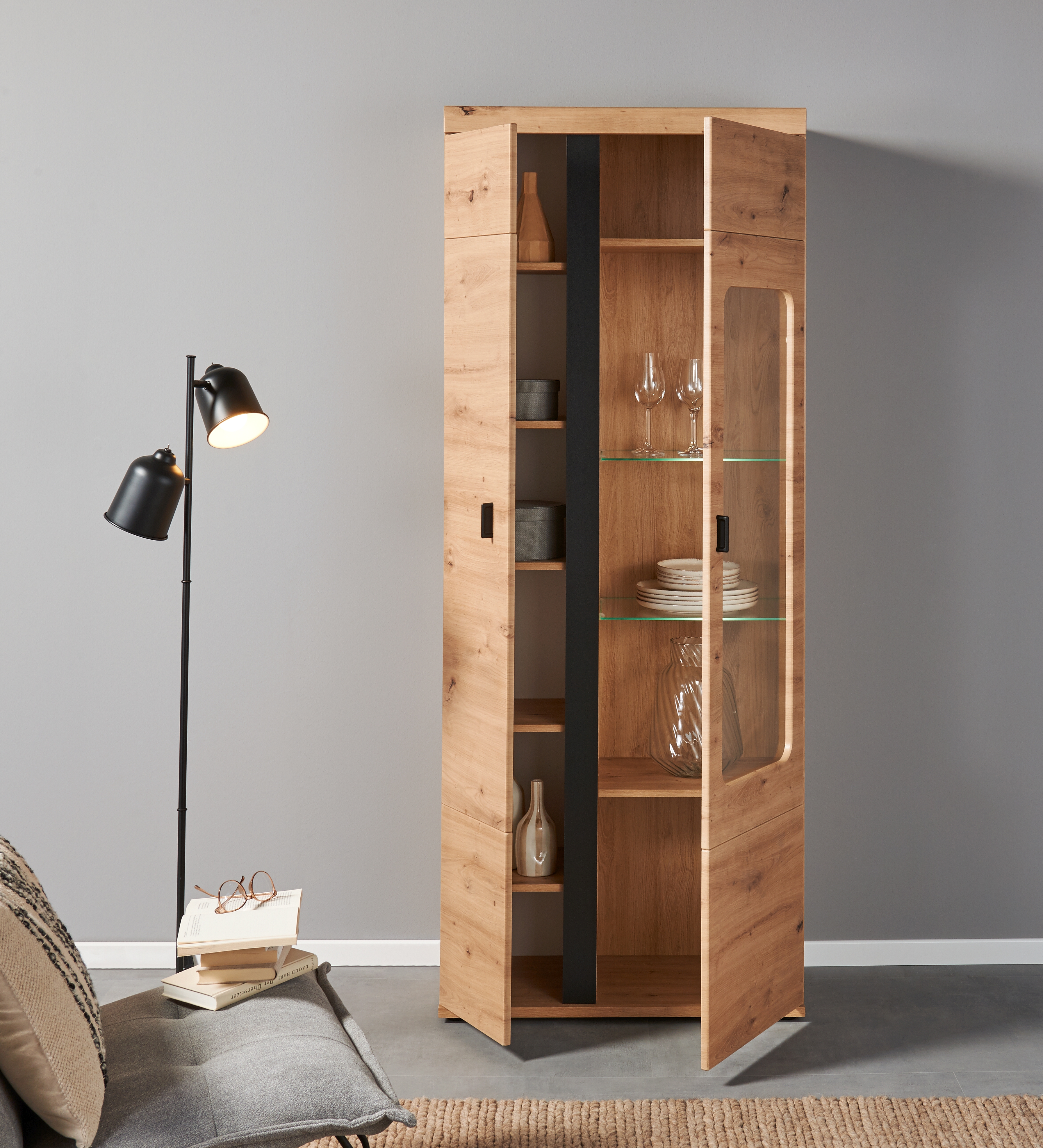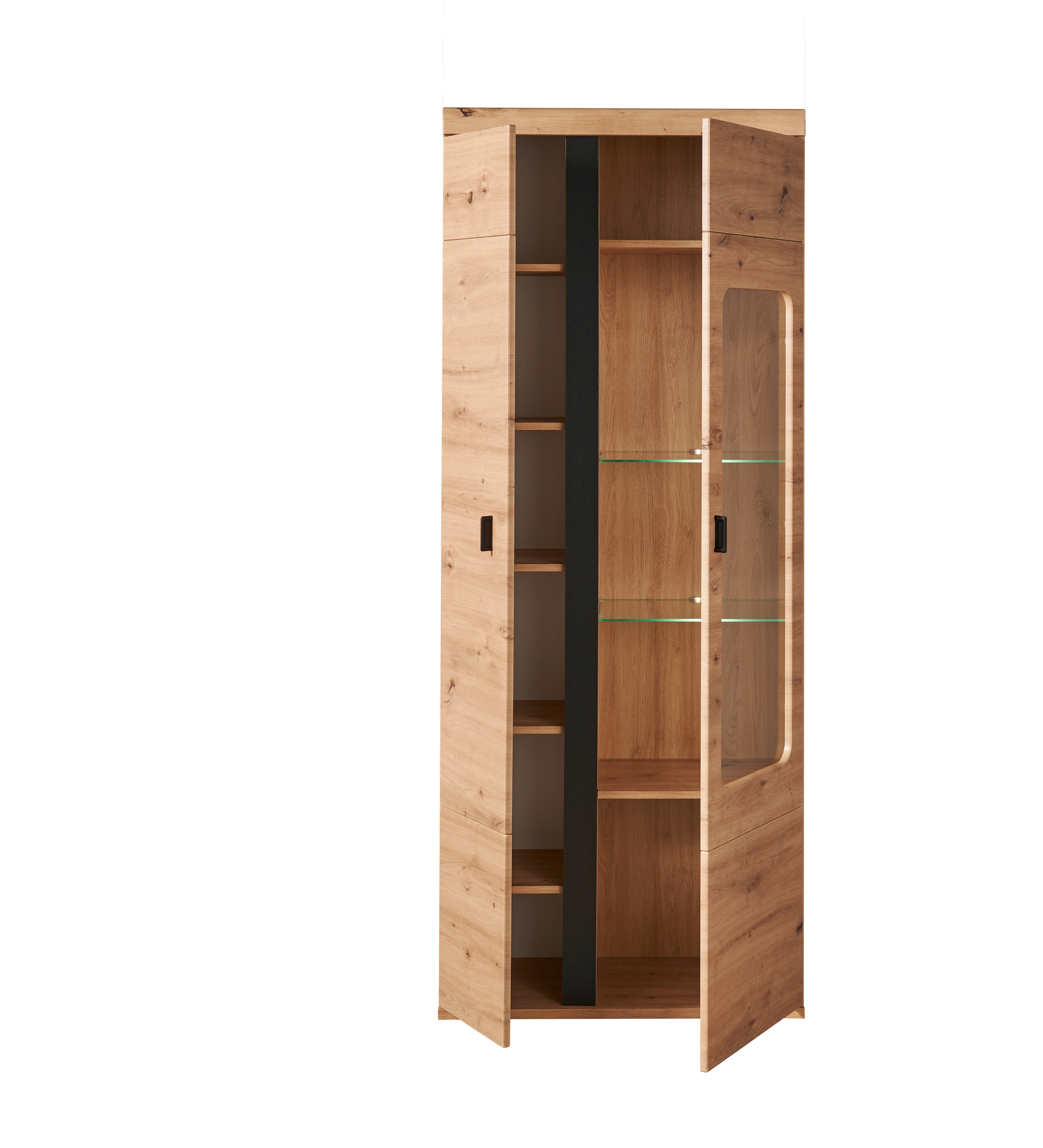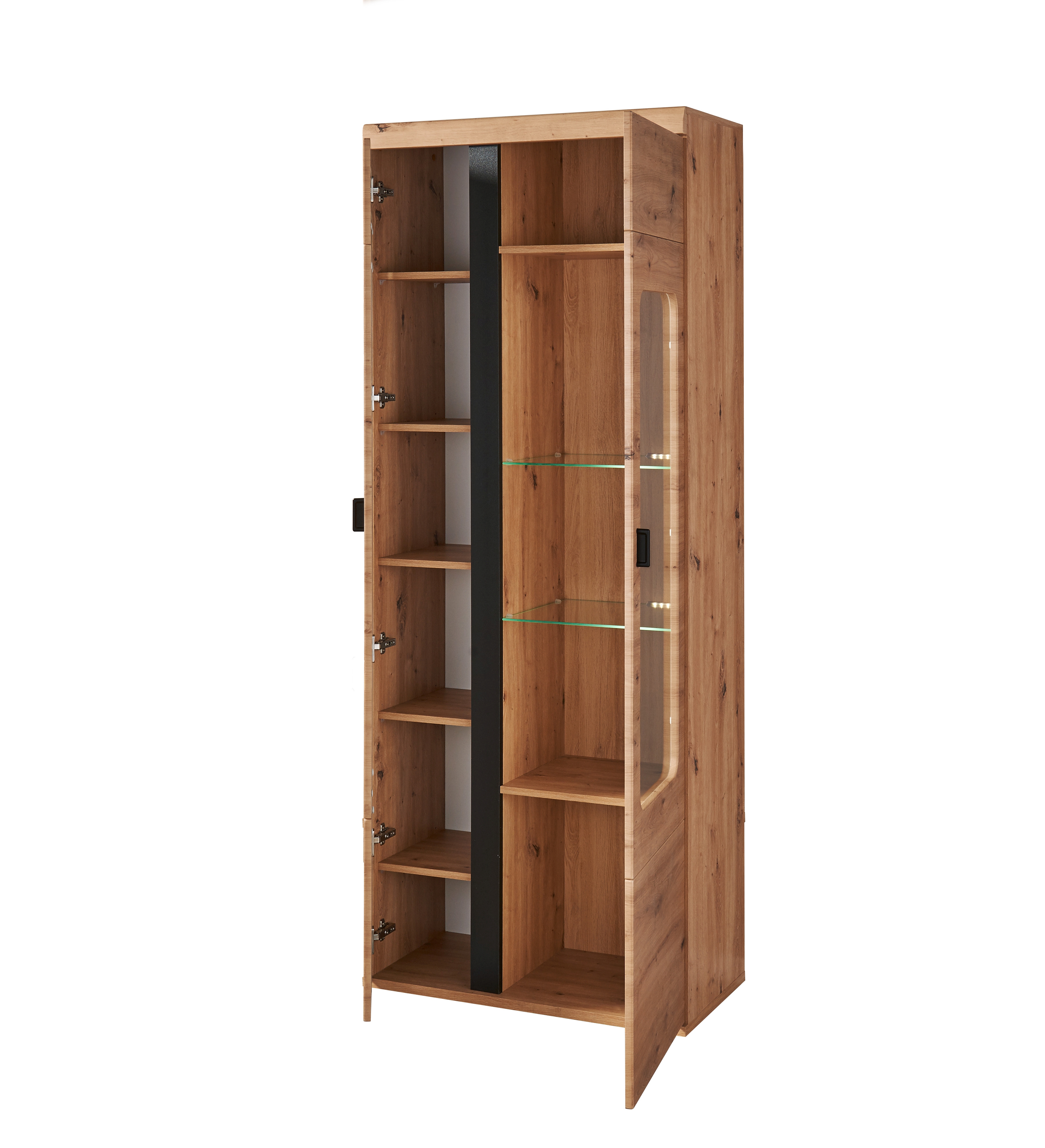 Façade : décor chêne Artisan, MDF (panneau de fibres de bois de densité moyenne) pelliculé avec contrastes ton noir (panneau de particules surfacé mélaminé (PPSM))/ verre