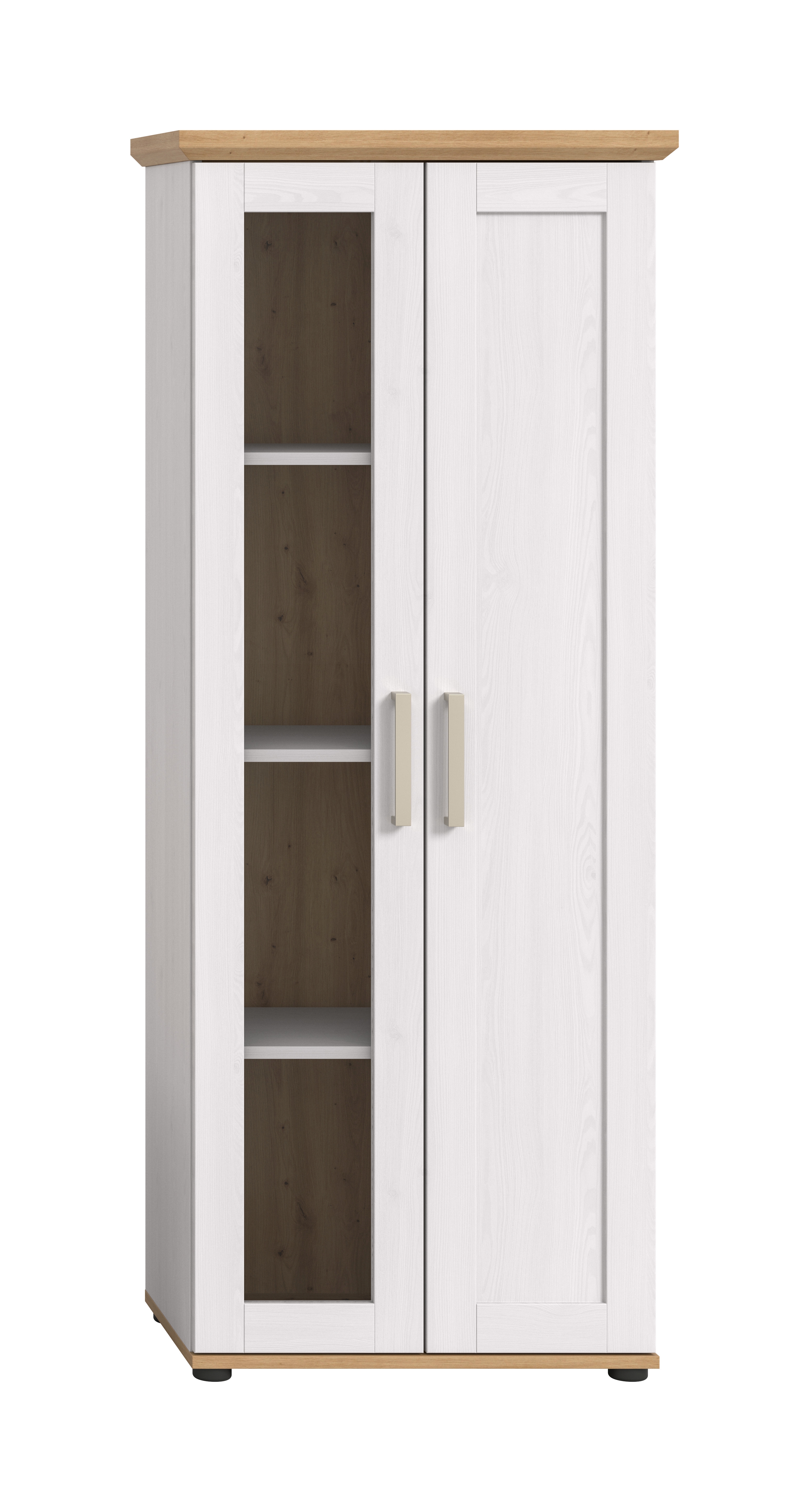 Exposez vos objets préférés avec style grâce à notre élégante vitrine au look maison de campagne ! Dotée d’une porte en bois et d’une porte vitrée, elle dispose de trois tablettes amovibles réglables en hauteur et de quatre compartiments, offrant ainsi à la fois un espace de rangement pratique et une belle surface de présentation. Le socle et le dessus apportent un contraste coloré et viennent parfaire son design moderne.