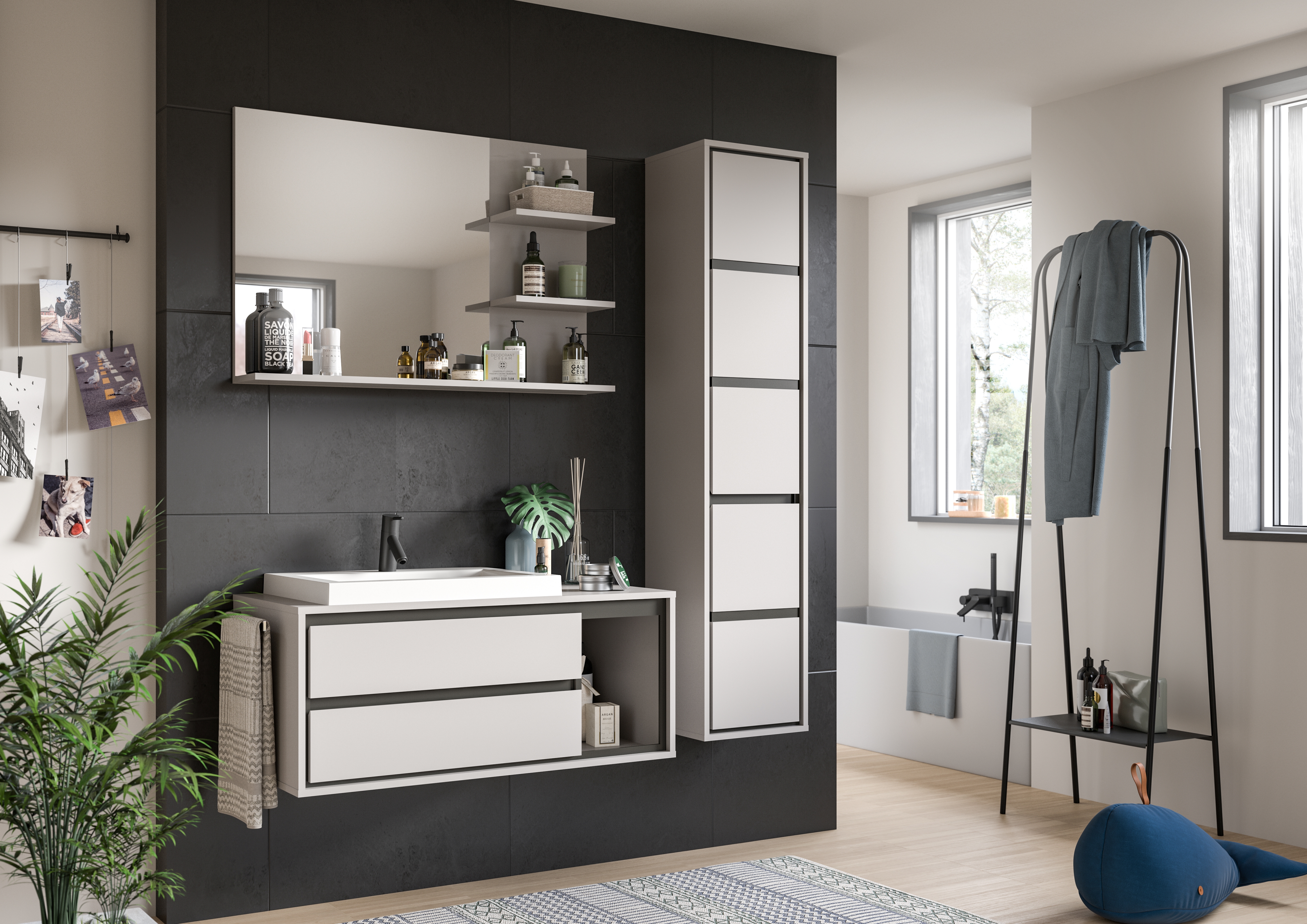 - Design/style : design moderne et élégant dans un décor gris et façade miroir pour une esthétique moderne et stylée dans la salle de bains.