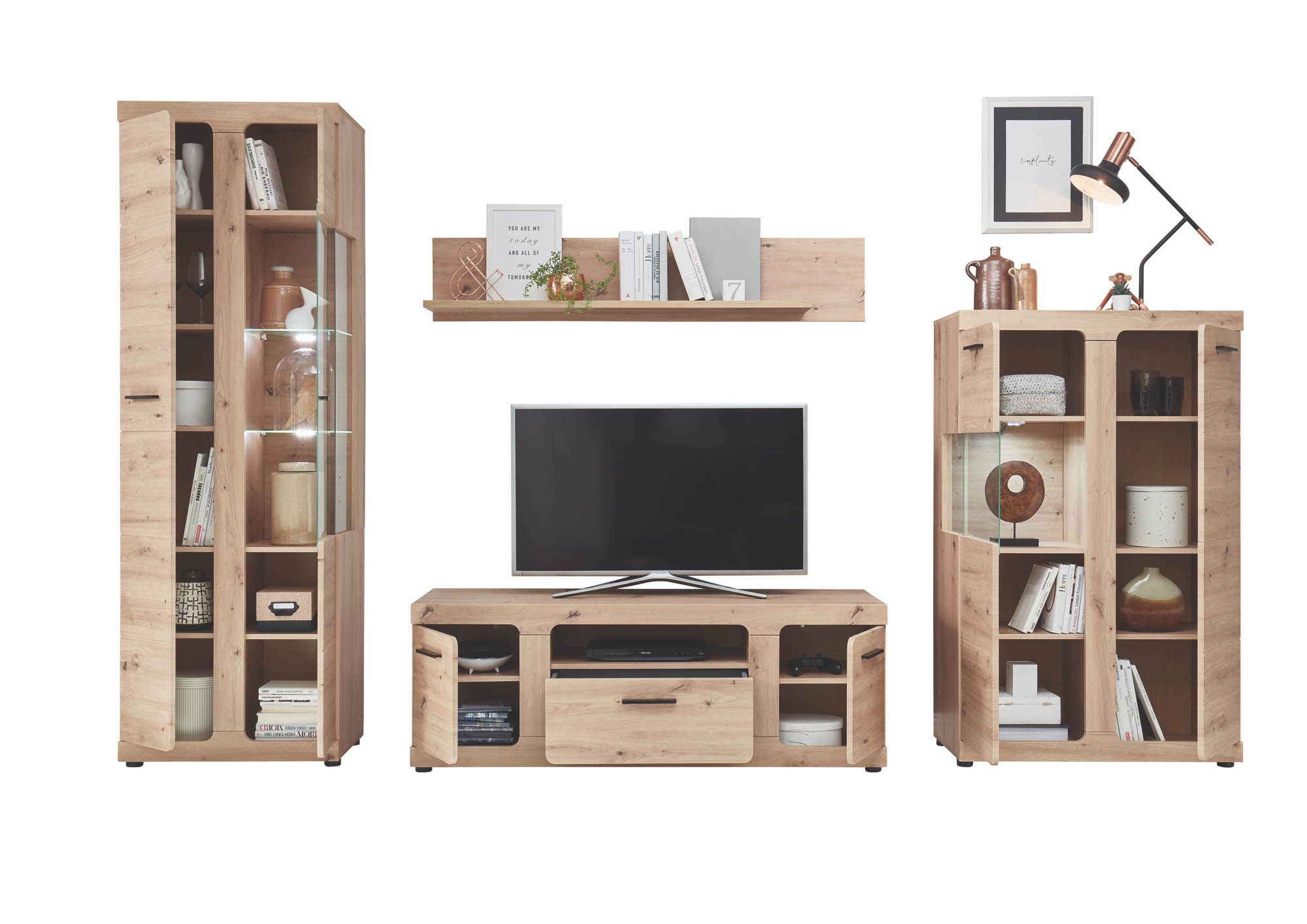 1 banc TV avec 2 portes, 2 tablettes en bois, 1 casier ouvert et 1 tiroir
