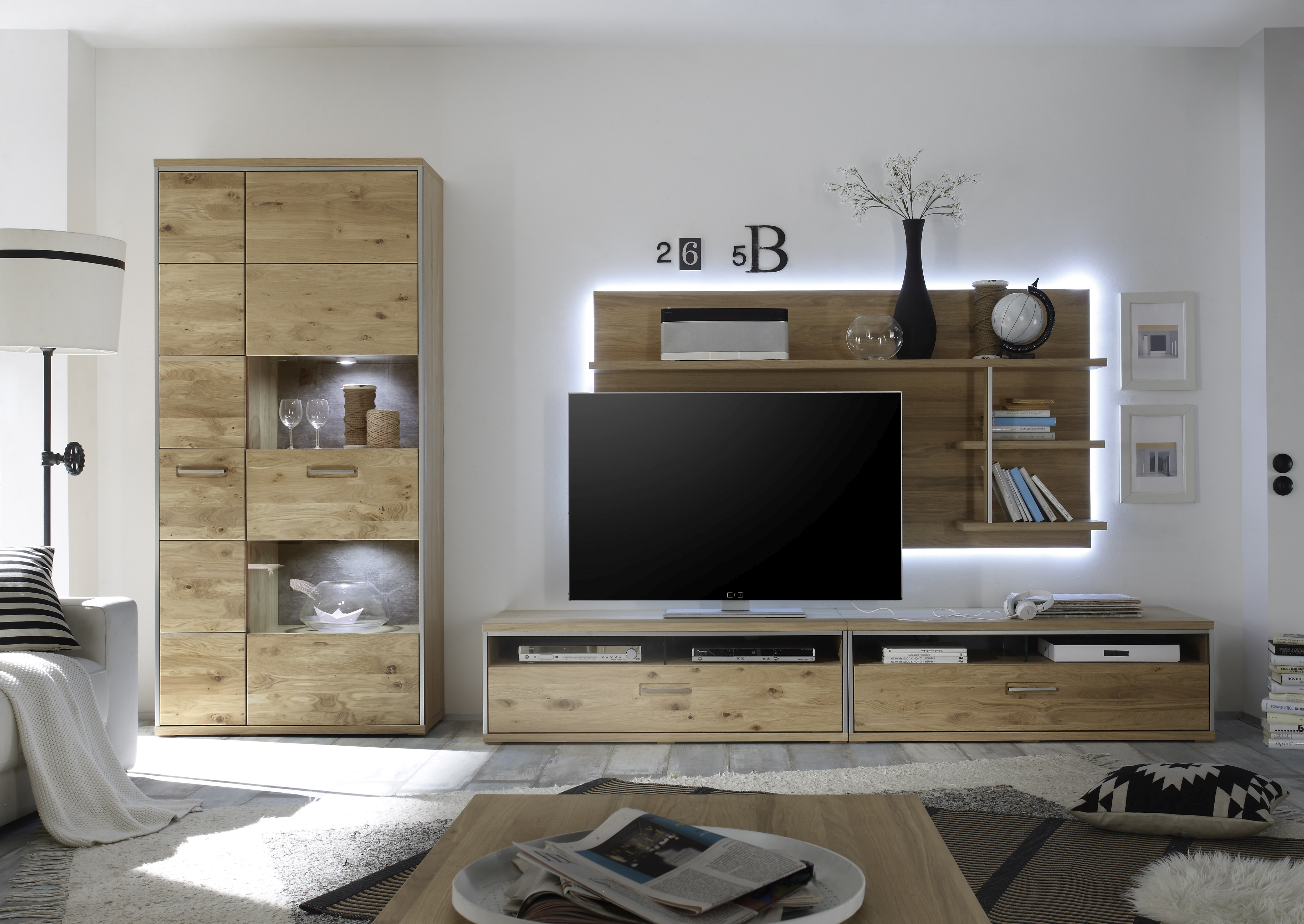 | Equipement murs TV: | Casiers ouverts, Tiroirs, incl. éclairage | ||
