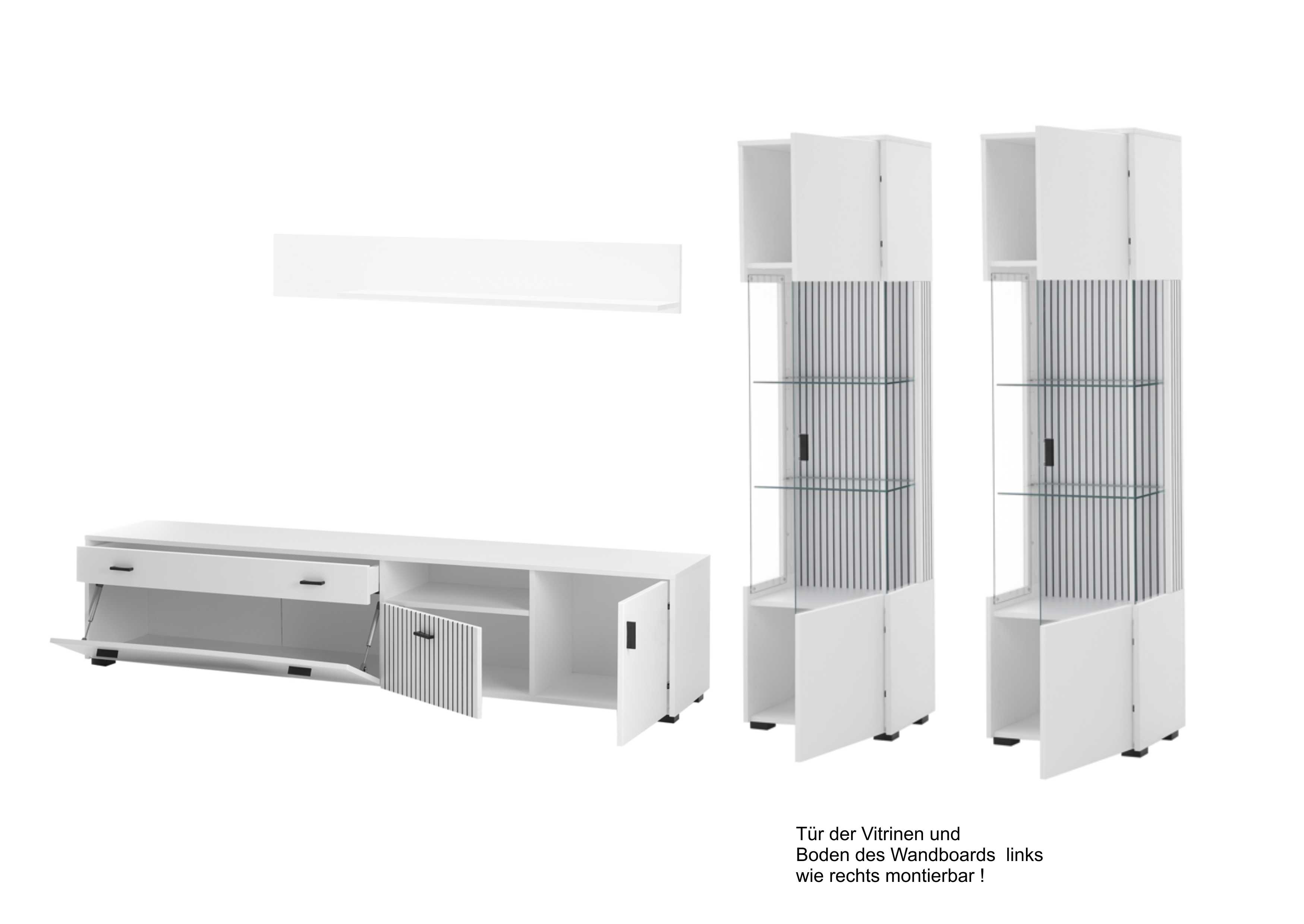 2 meubles vitrines avec, chacun, 1 porte, 2 tablettes en verre et 2 tablettes fixes (porte pouvant être montée avec ouverture à gauche ou à droite)