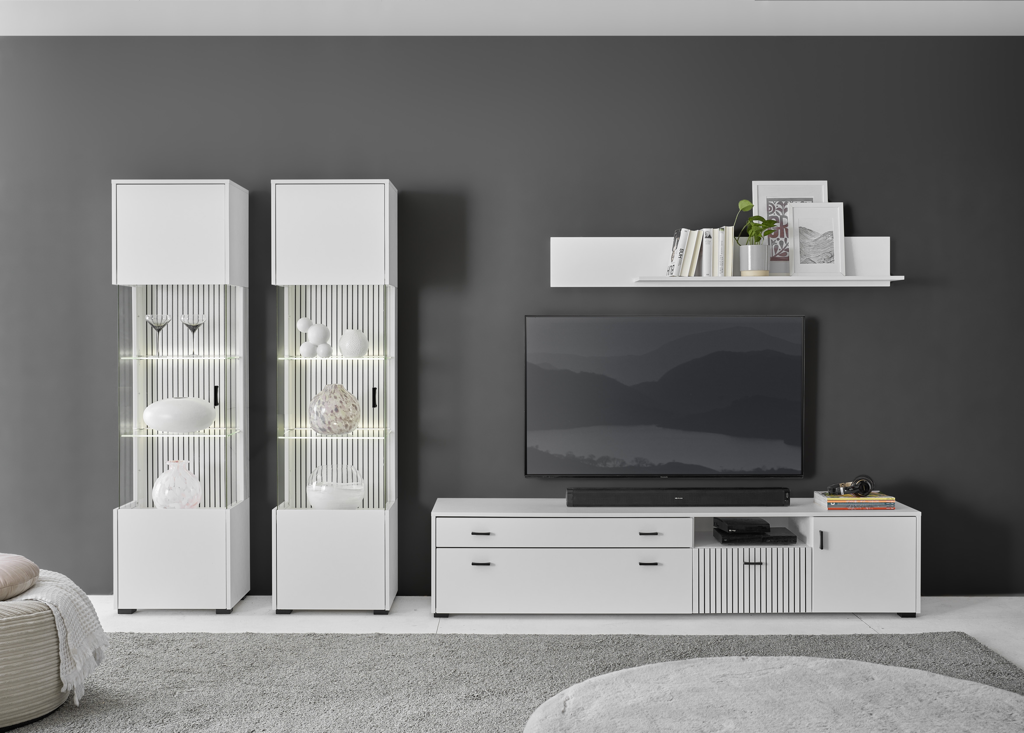 1 banc TV avec 2 portes, 1 abattant, 1 tiroir et un casier pour l’équipement