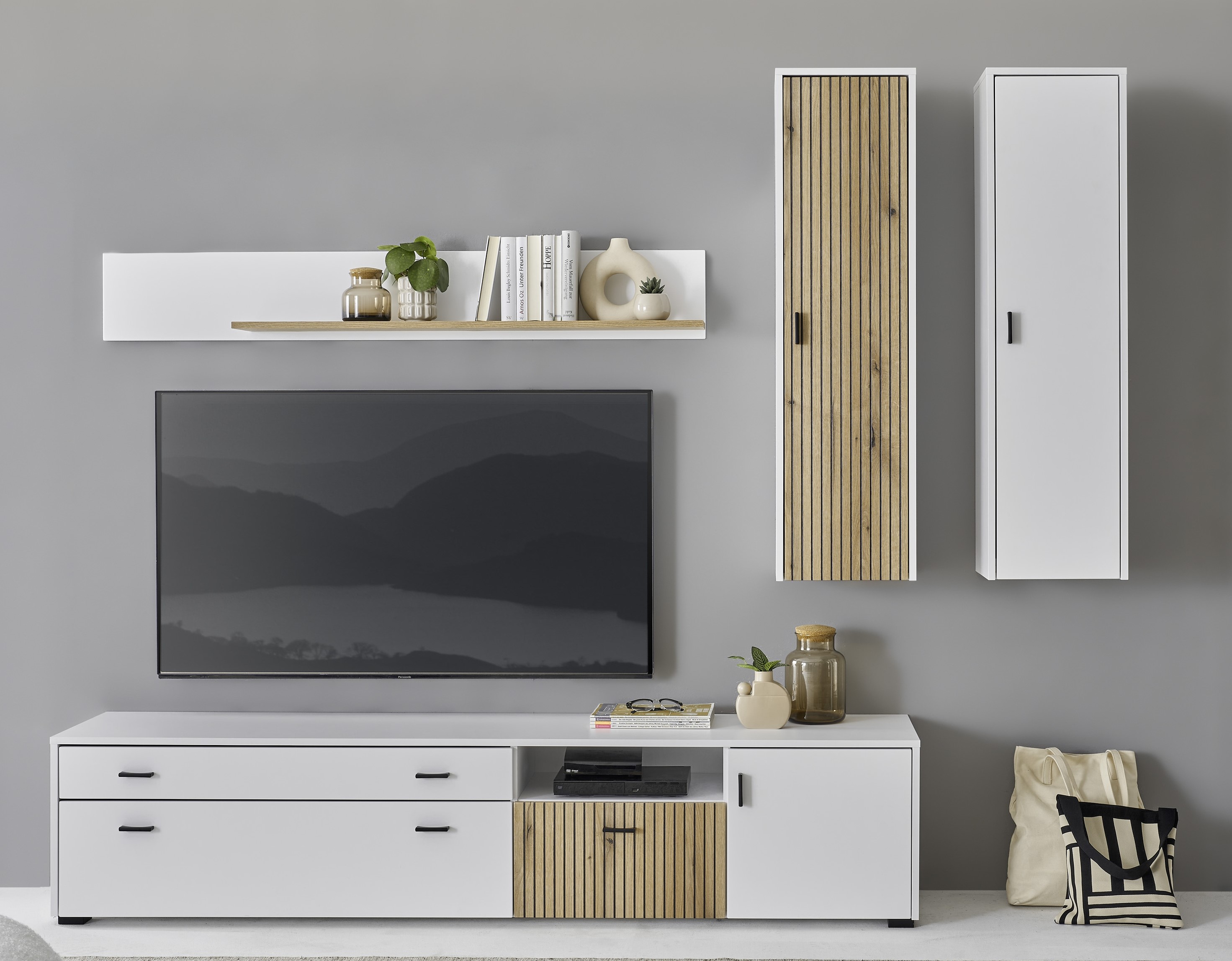 1 banc TV avec 2 portes, 1 abattant, 1 tiroir et un casier pour l’équipement