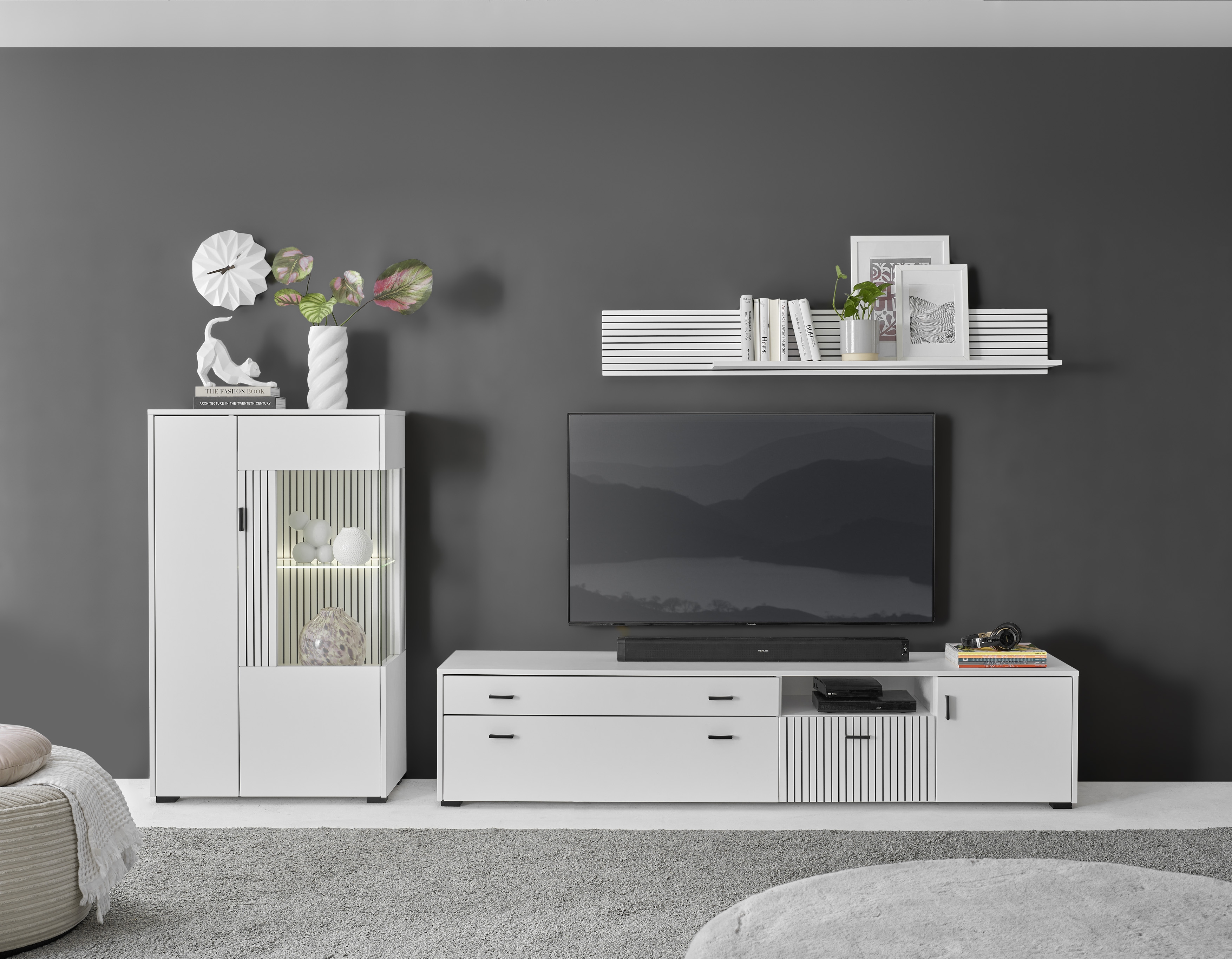 1 banc TV avec 2 portes, 1 abattant, 1 tiroir et un casier pour l’équipement